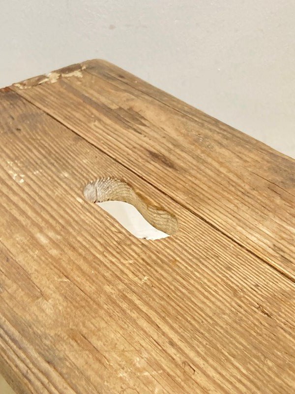 A beautifully rustic old step-stool with hand-hole and nicely shaped sides. Structurally sound and with some of the original old white paint, this is a great size for a little side table too!