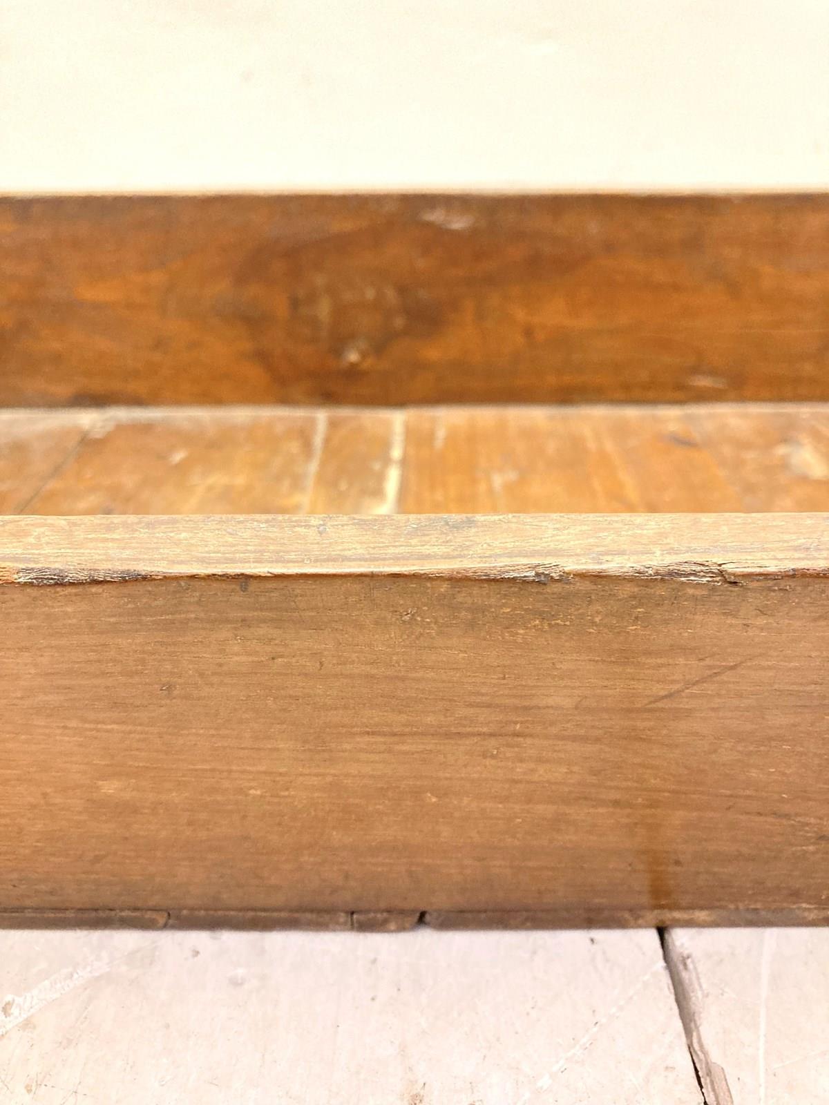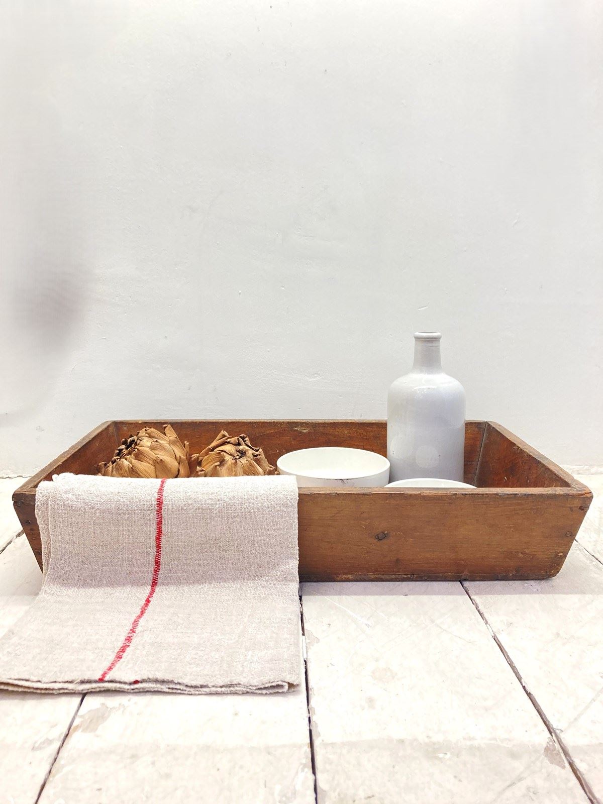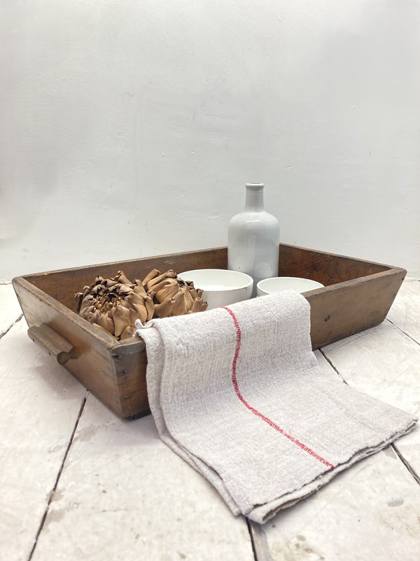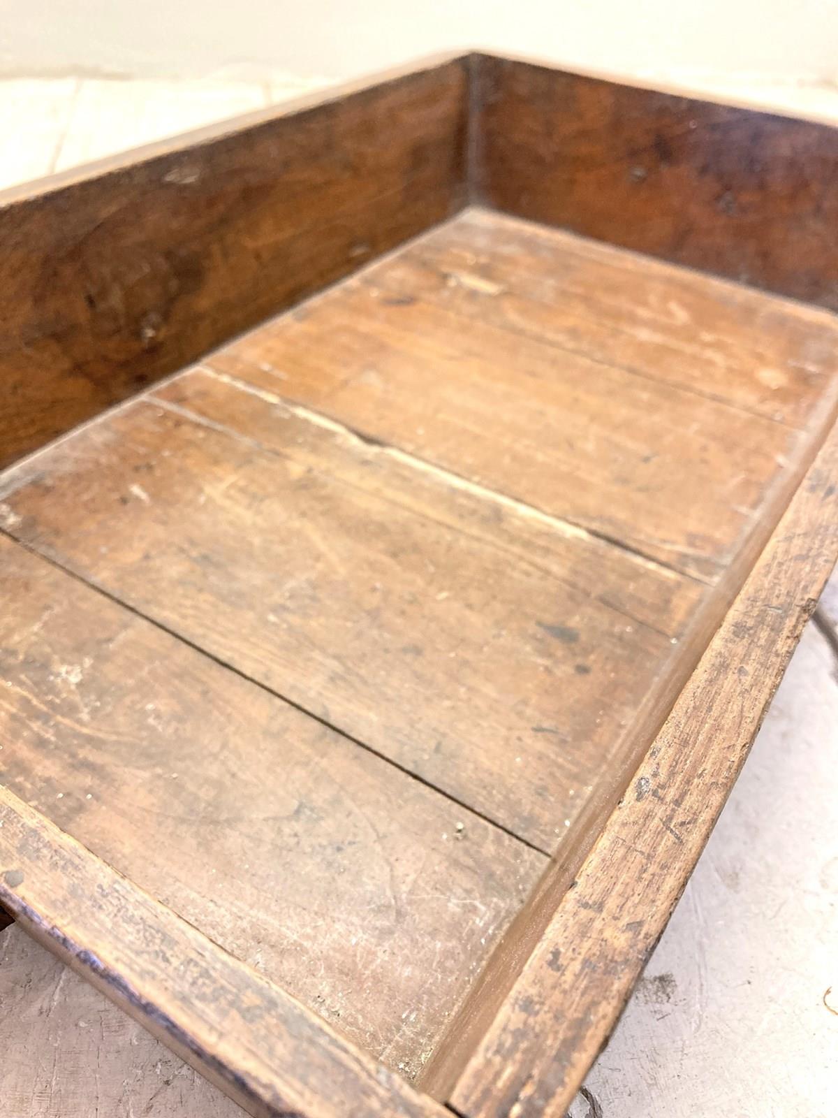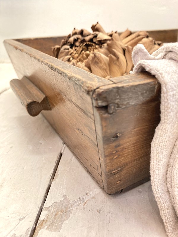 A vintage wooden tray with high sides in a beautifully weathered wood which gives it real rustic appeal. There is a carved flat handle on each end and angled corners - this would look fabulous in a kitchen, on a coffee table etc as well as being rather useful!