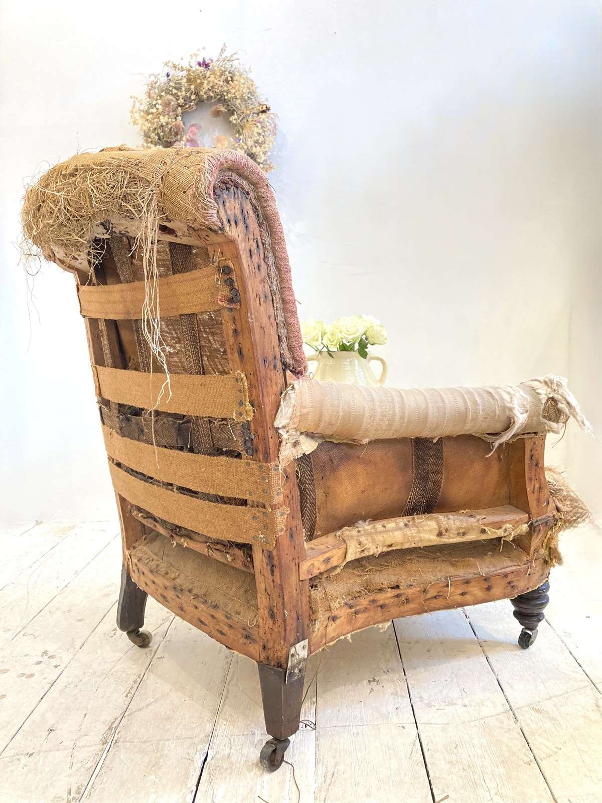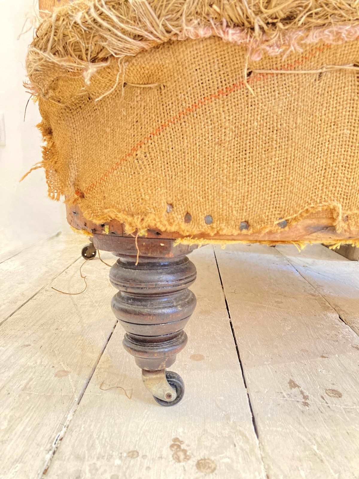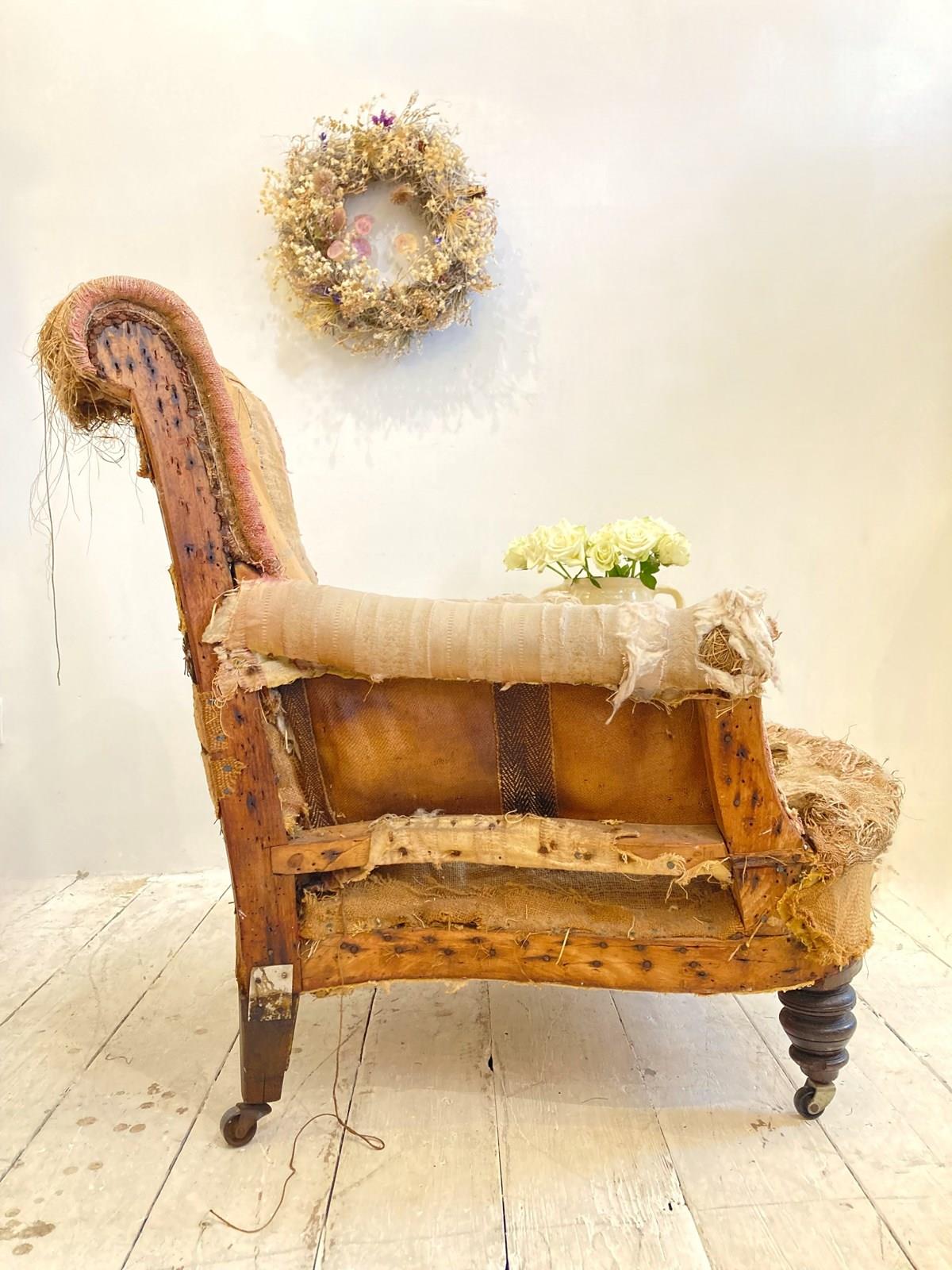 A very sweet little C19th country house style armchair with turned front legs, original castors and deep seat. The back and arms have a nice scroll - this has been stripped back completely and would make a wonderful reupholstery project, as when it's finished it will be an attractive, comfortable and useful chair.