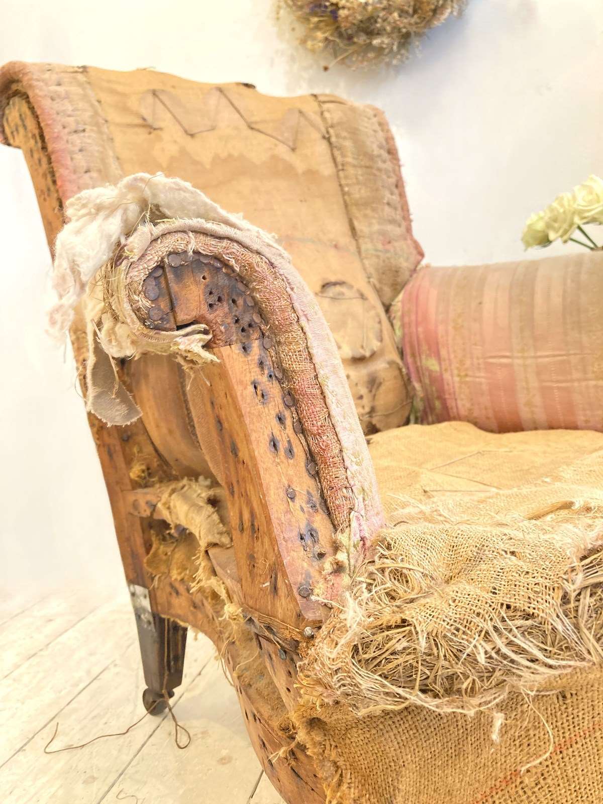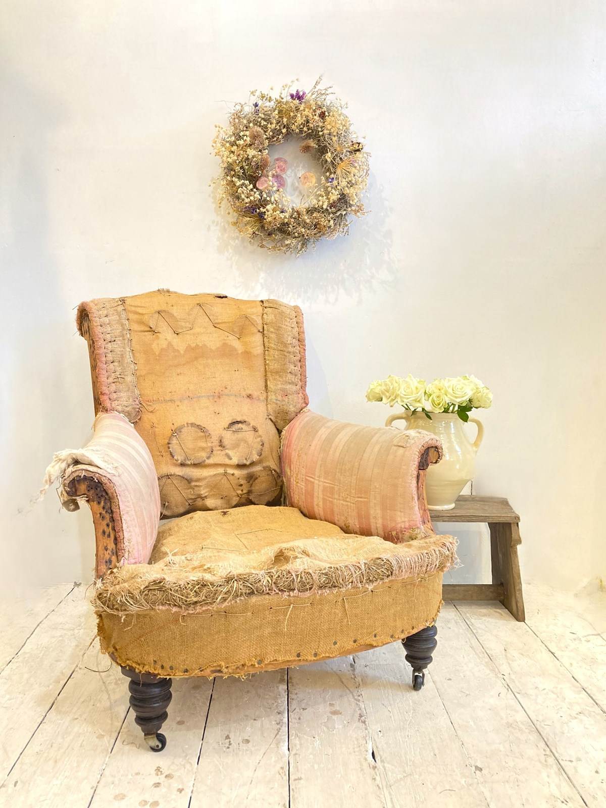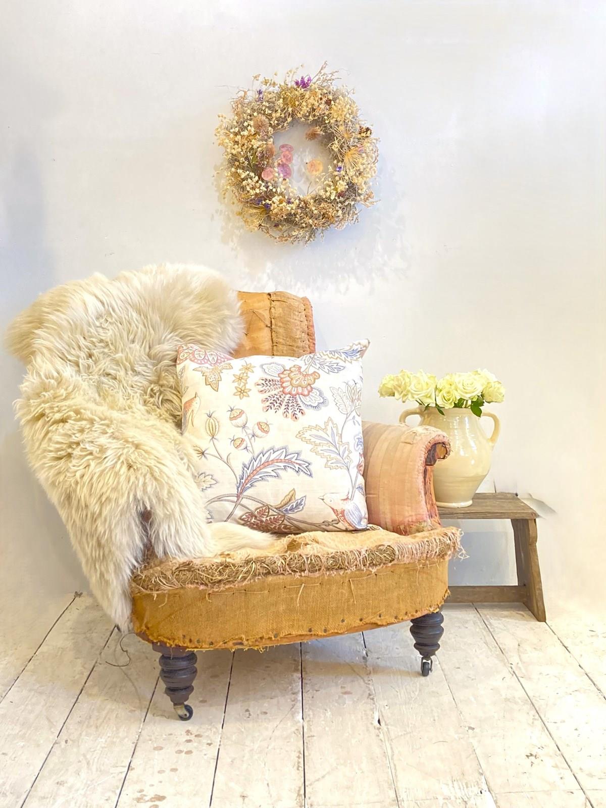 A very sweet little C19th country house style armchair with turned front legs, original castors and deep seat. The back and arms have a nice scroll - this has been stripped back completely and would make a wonderful reupholstery project, as when it's finished it will be an attractive, comfortable and useful chair.