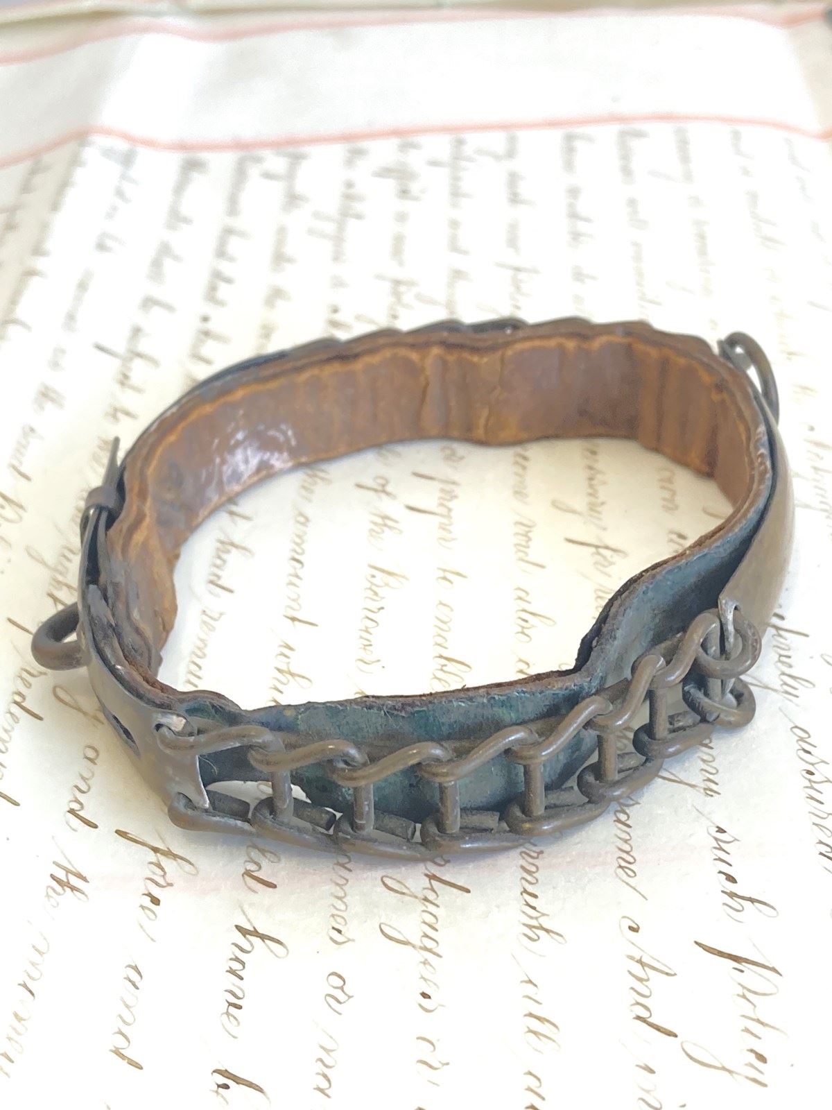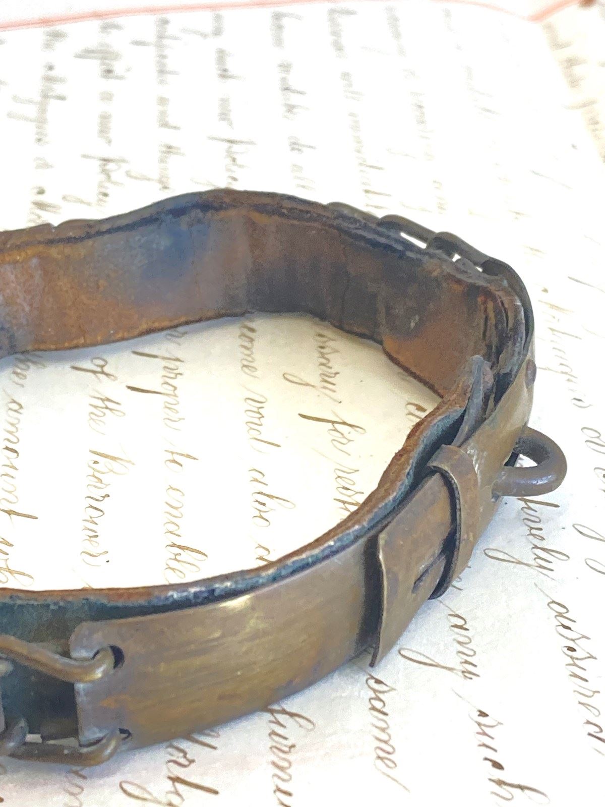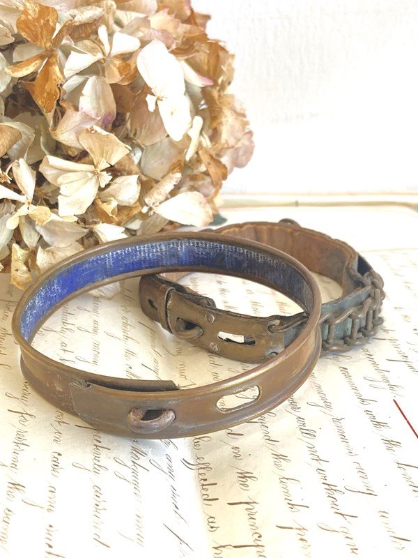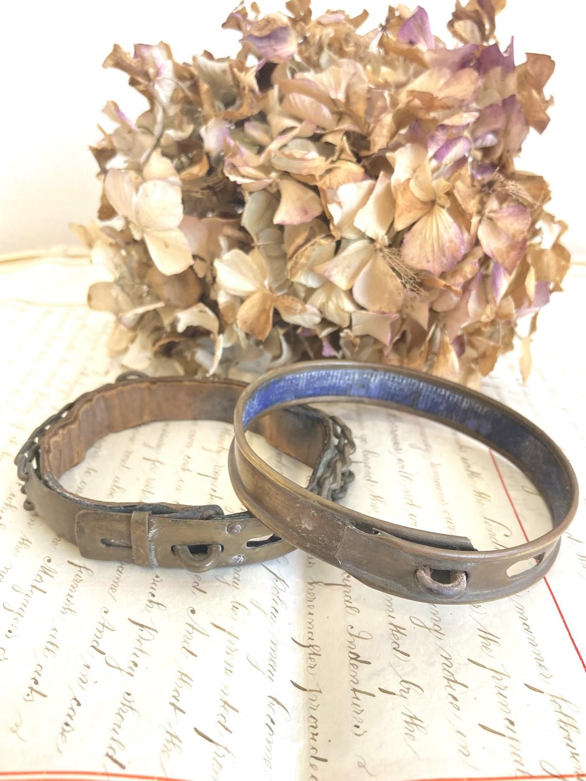 Two absolutely charming antique dog collars c.1860. The first is a sheet brass collar with two settings and a blue leather lining with rolled sides in good condition with no splits or dents. The second is leather and brass with articulated links on either side, the back is a brass panel which has not been engraved and the front is a brass loop with three openings for sizing. The brass is in good condition, however the leather inside shows signs of age.