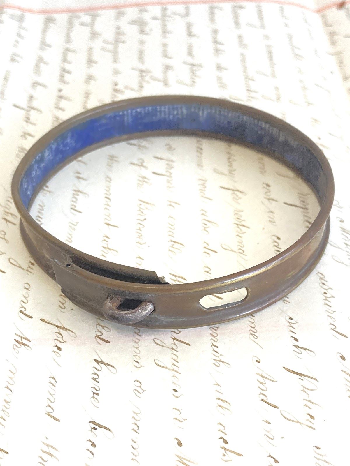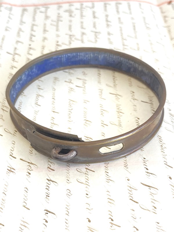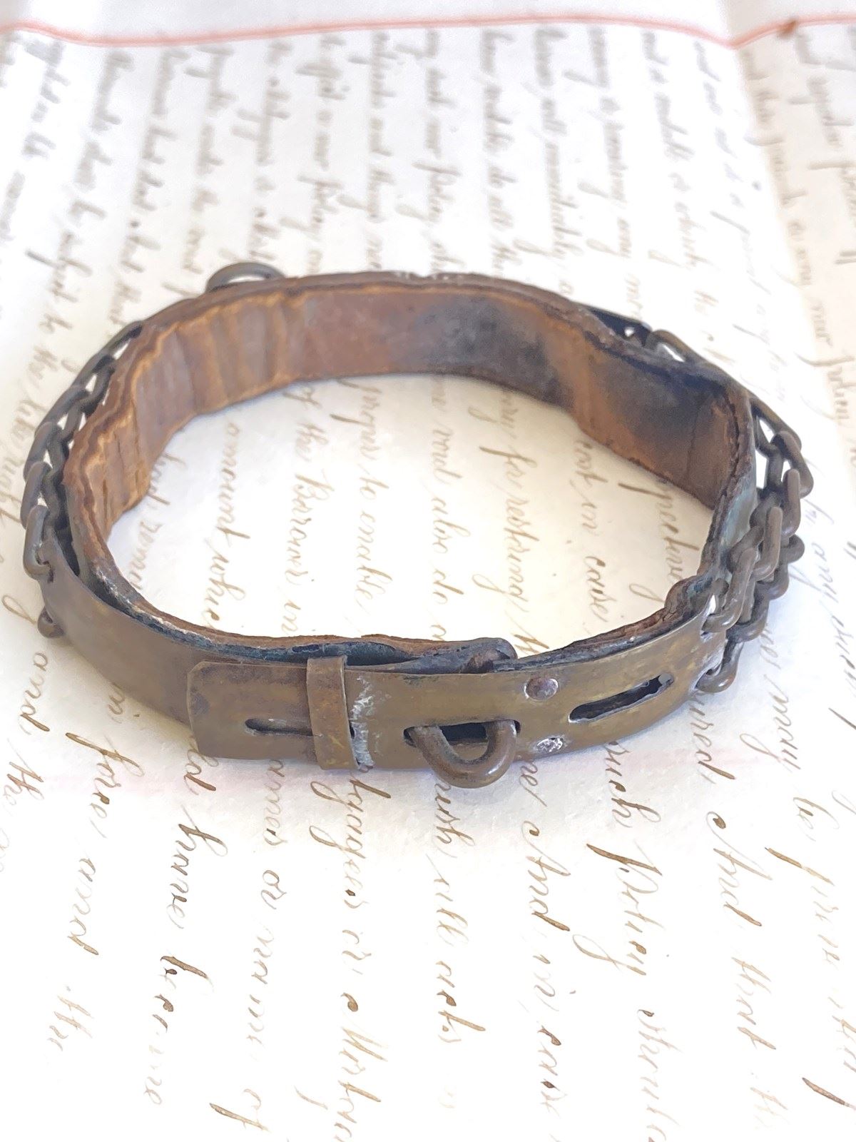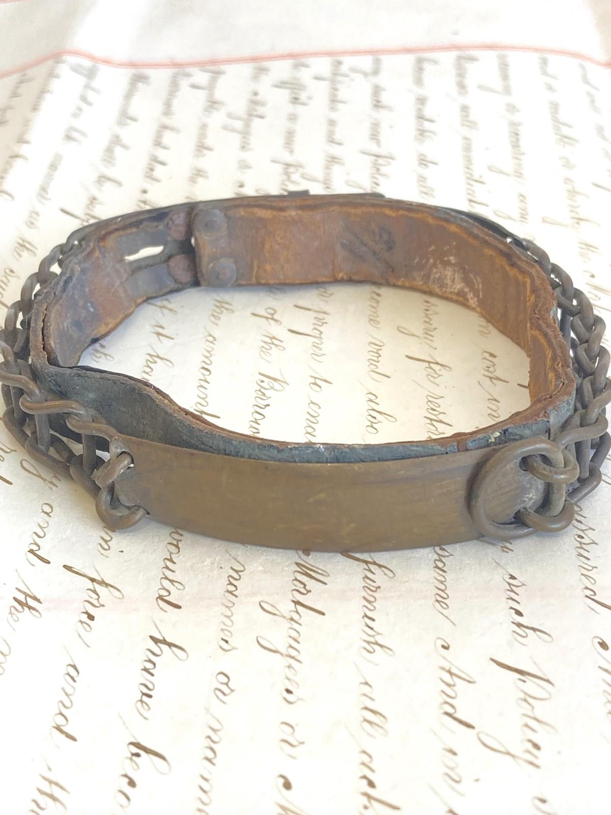 Two absolutely charming antique dog collars c.1860. The first is a sheet brass collar with two settings and a blue leather lining with rolled sides in good condition with no splits or dents. The second is leather and brass with articulated links on either side, the back is a brass panel which has not been engraved and the front is a brass loop with three openings for sizing. The brass is in good condition, however the leather inside shows signs of age.