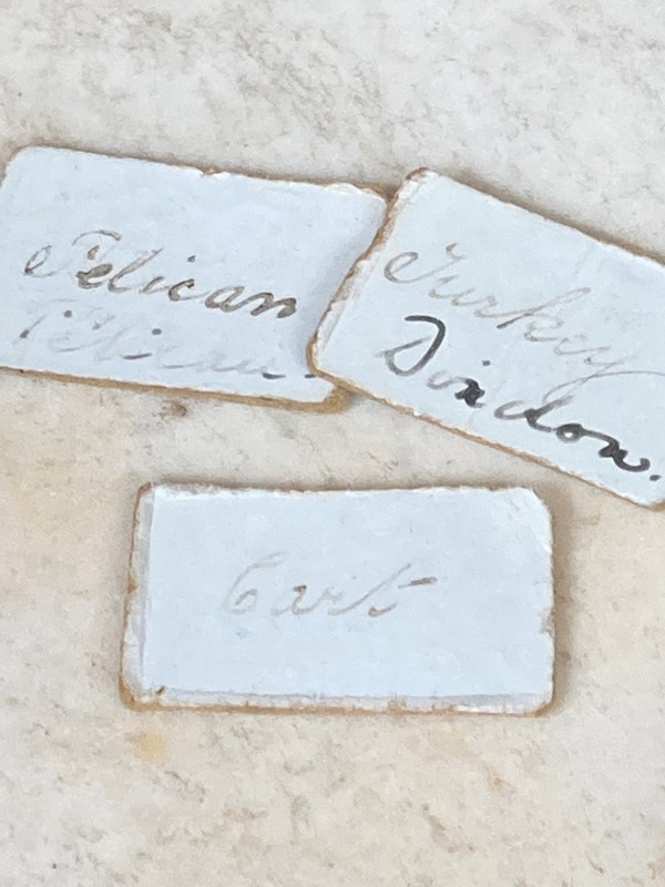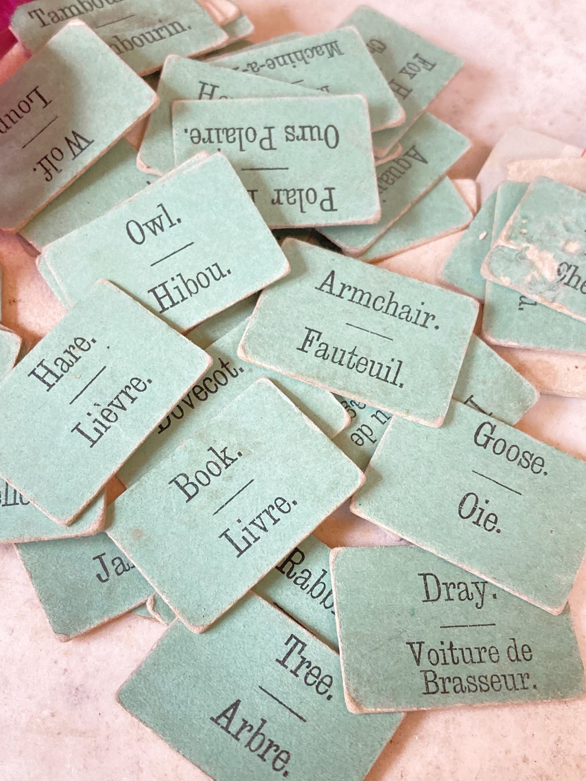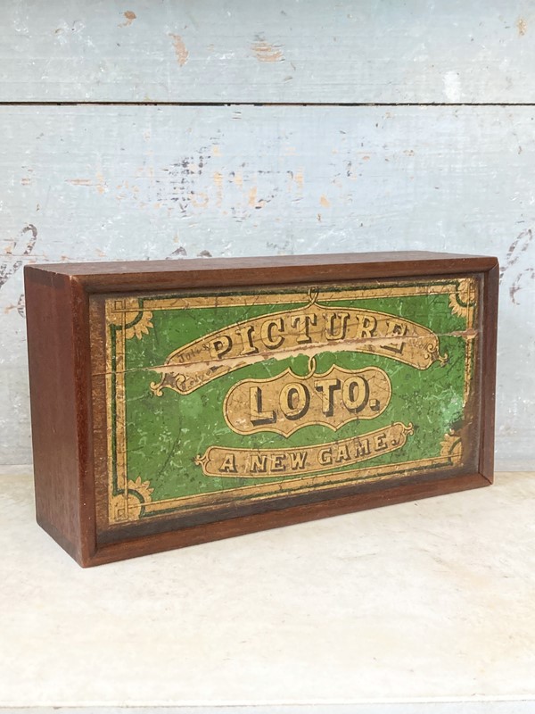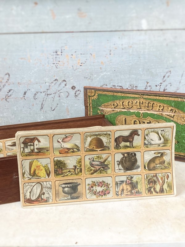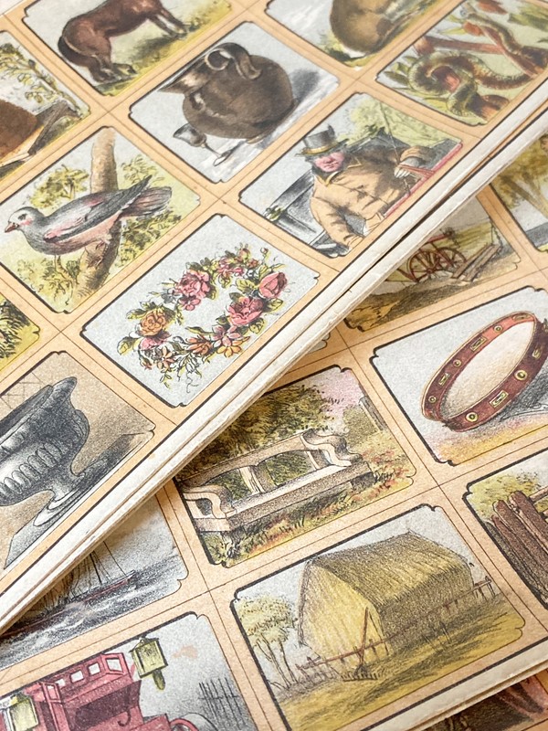 An utterly charming antique picture loto game in the original mahogany box; the picture cards are beautifully coloured and each of the labels are in both English & French (a couple have been replaced with hand-written ones over the years). The lid to the box has split but still slides well. Very decorative - c.1890. 7cm x 14cm x 25cm