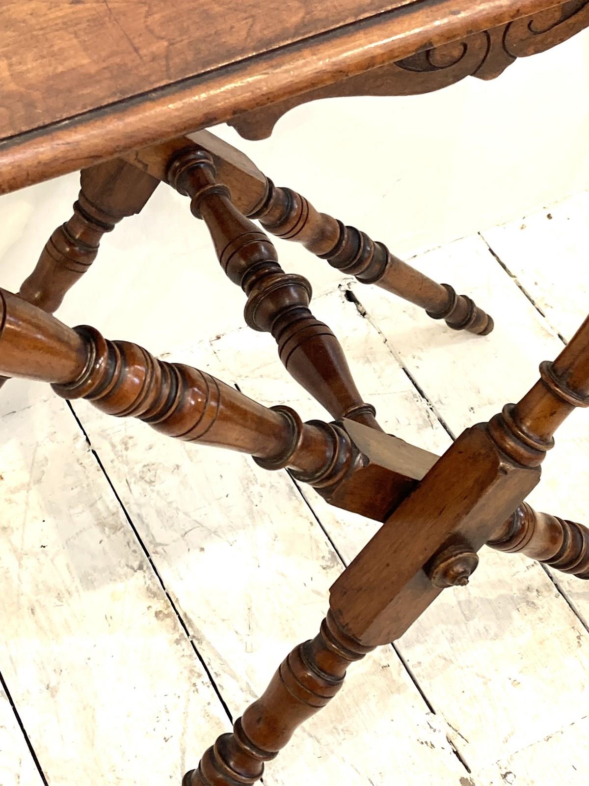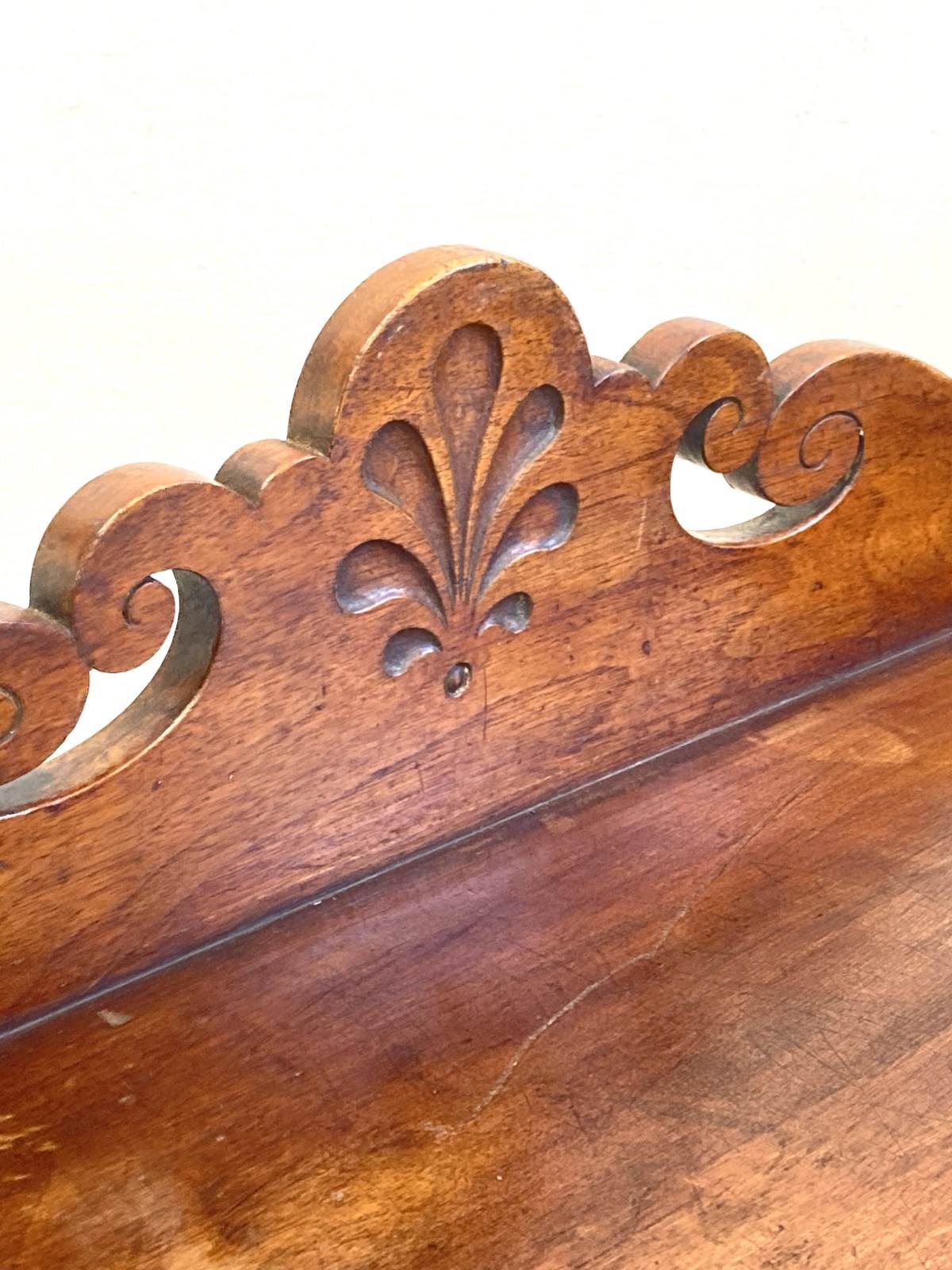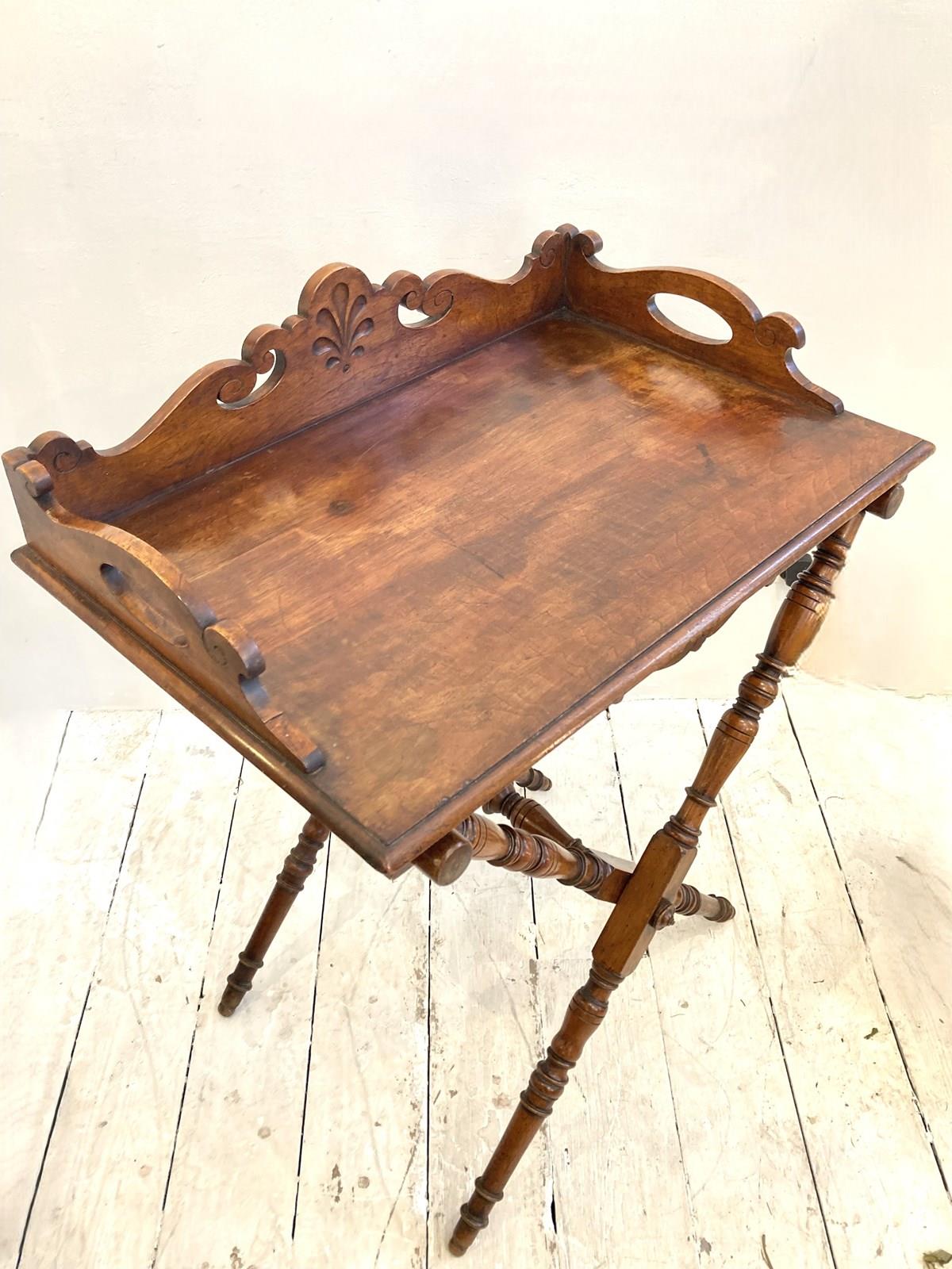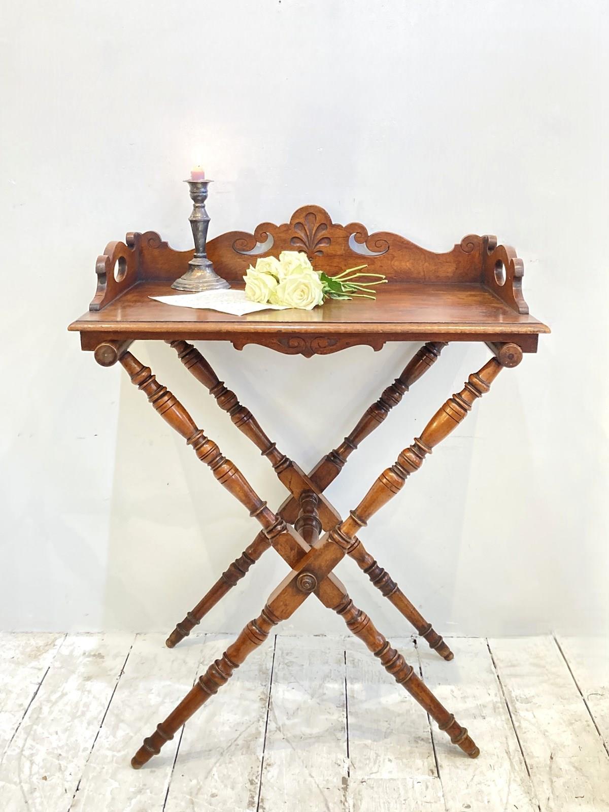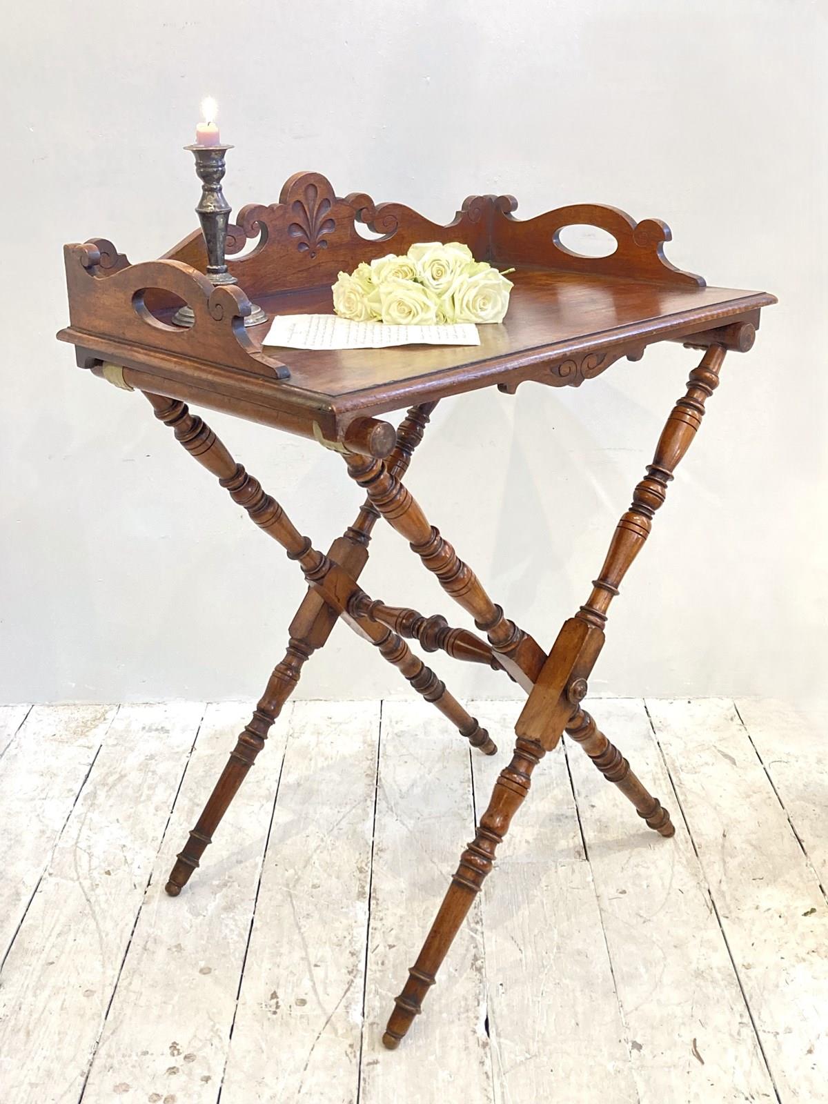An elegant and decorative C19th Butler's Tray Table comprising of a large mahogany tray with carved gallery and sides with handles on a collapsible X frame made from nicely turned spindles. Originally used for serving in grand houses, they're now the perfect size to be used for a drinks table or side table with the added benefit of being about to fold down for storage when not in use. In lovely antique condition with a warm colour and deep glow.