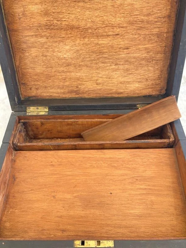 The mahogany box is in lovely antique condition and there's the original brass escutcheon and inlaid plaque on the top; open the lid to reveal a little pen slide & recess, then flip open again to a writing slope (would have been leather, now later painted) and storage space.