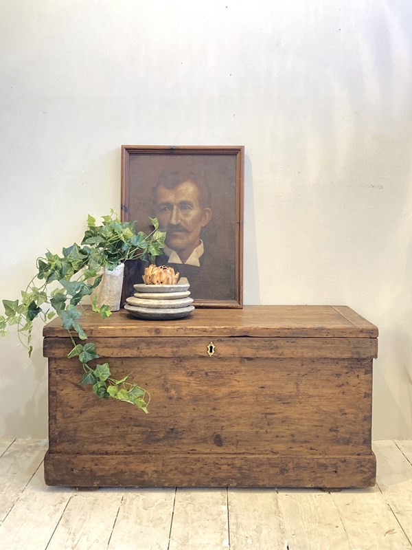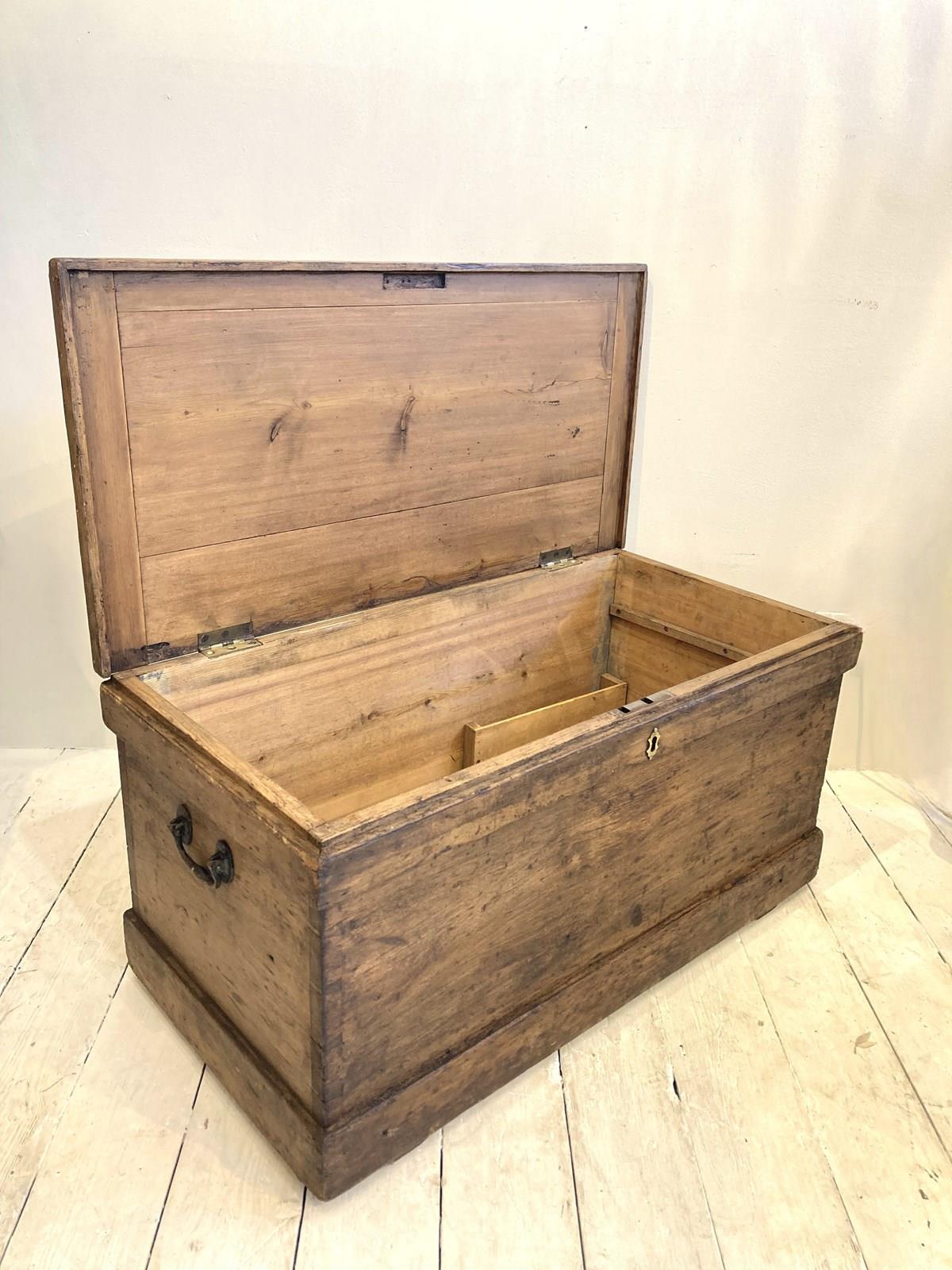 A handsome C19th pine trunk with the original cast iron handles on either side and lovely clean interior. This is a great size for a coffee or side table - it's been waxed to a deep, dark colour and stands on two runners to lift the base slightly off the floor.