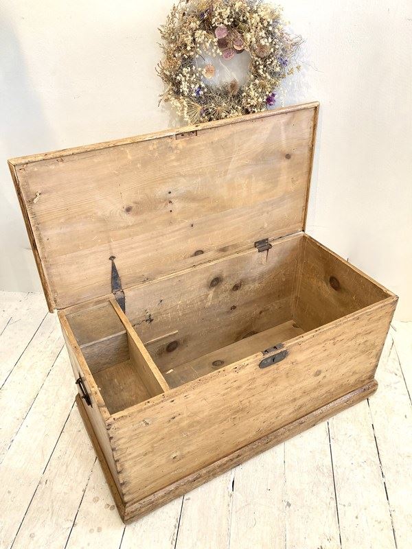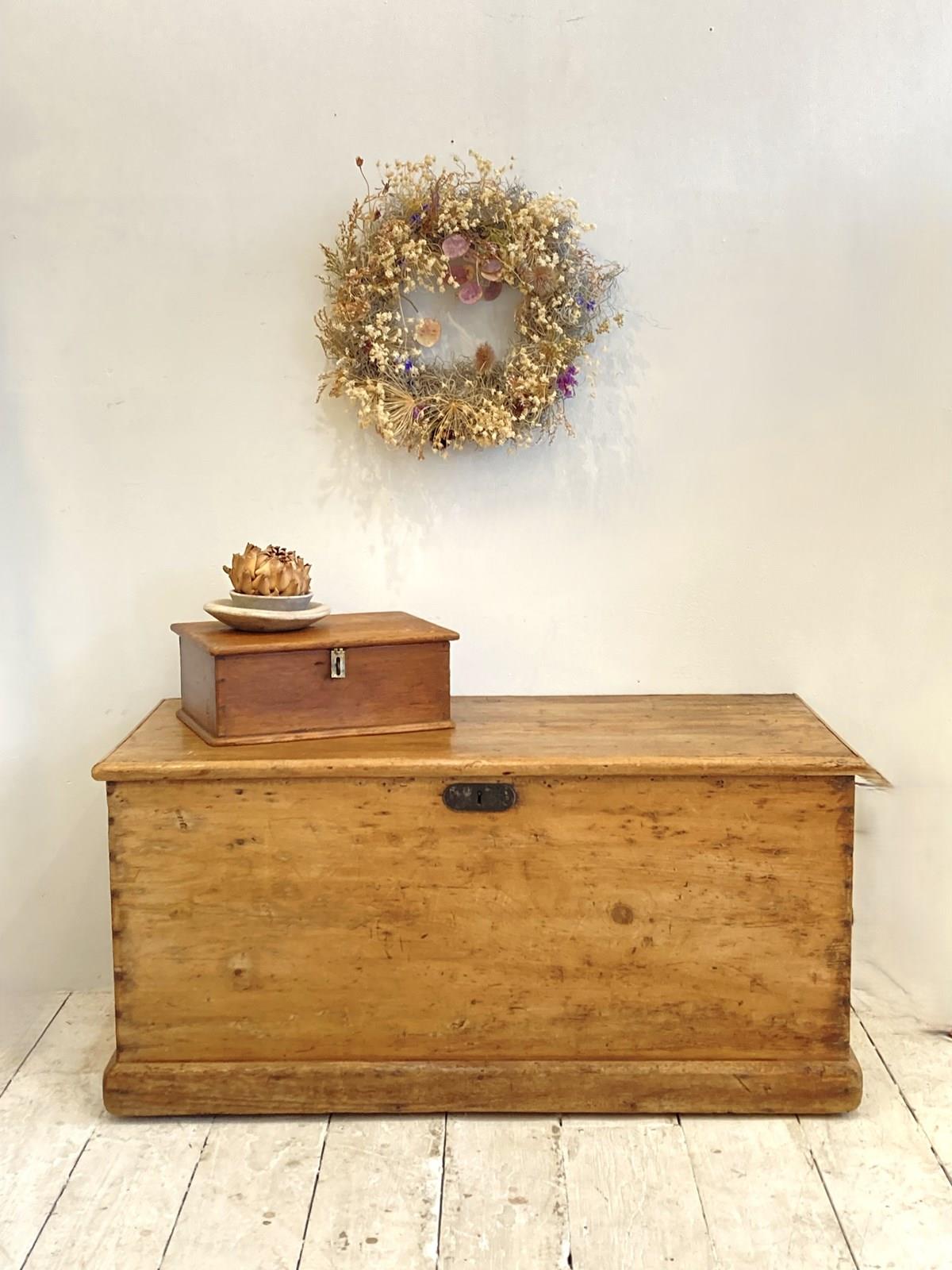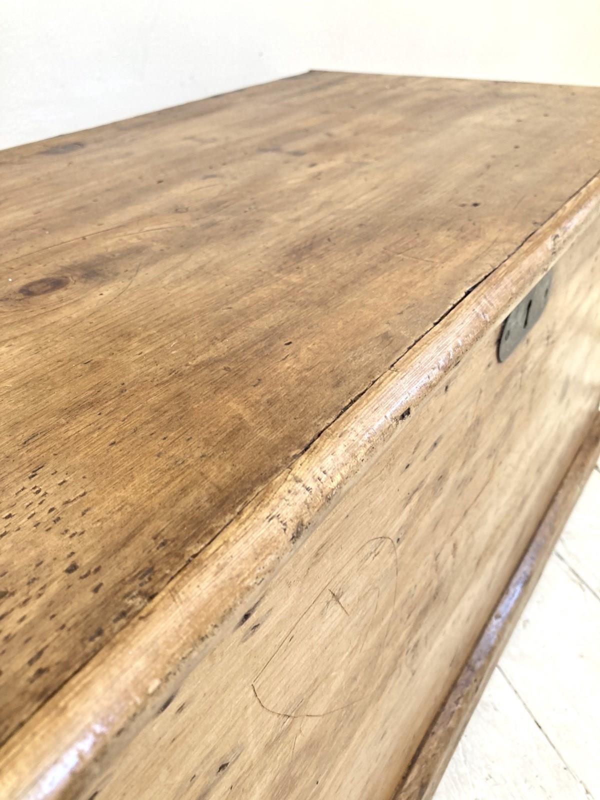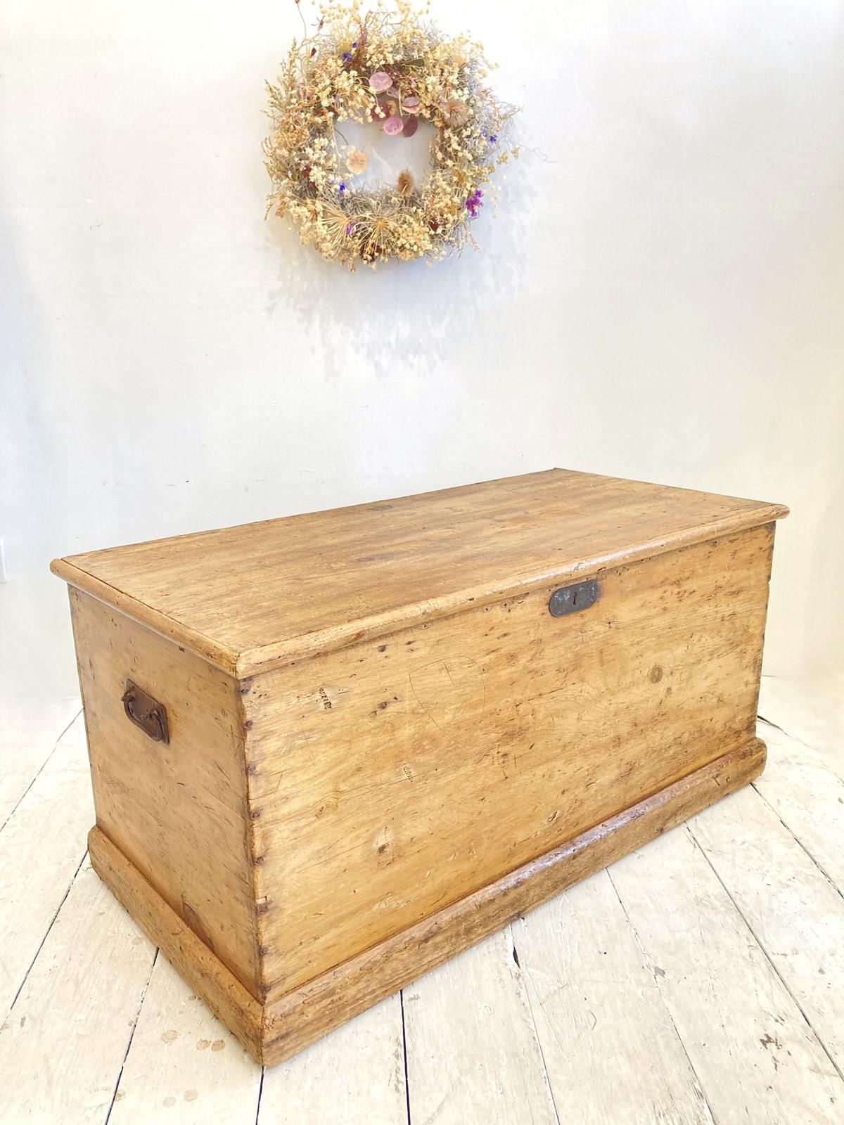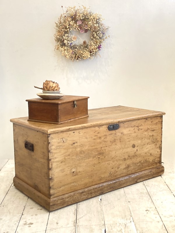 Always popular, these Victorian pine trunks are so useful for both storage and as side tables, coffee tables etc. This example has a wonderful warm glow and is in great condition - the original steel handles match the original escutcheon whilst the size is perfect for a small coffee table, in a bay window or for storage at the end of a single bed.