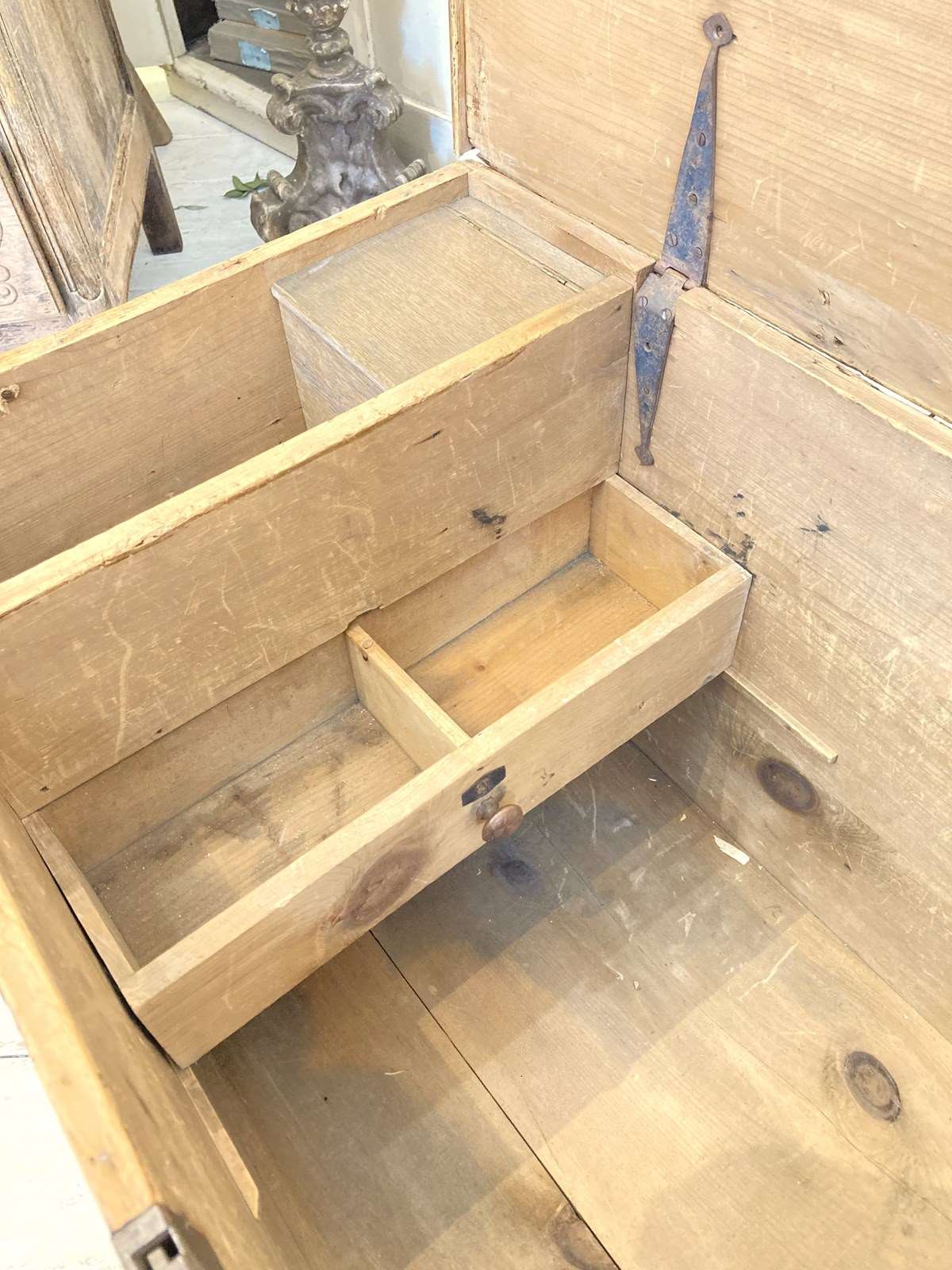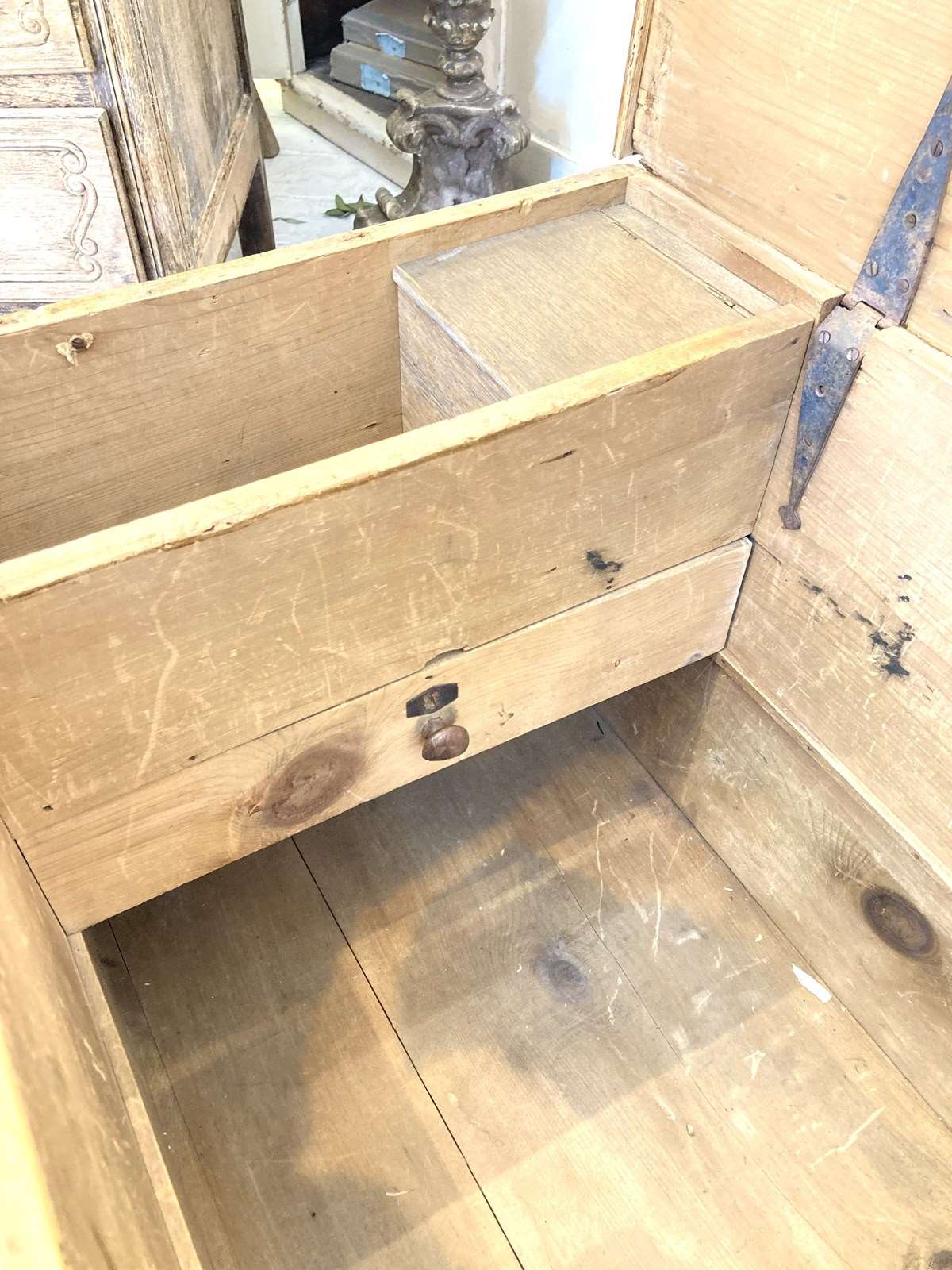Inside there's a little surprise - not only does it have a candle tray (the tallow from the candles would deter moths which is why the candles were stored with the linens!) and also a sweet little sliding drawer for storing secrets!