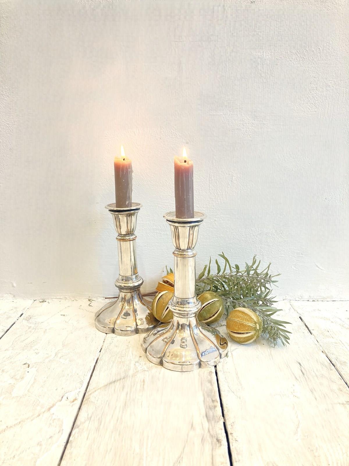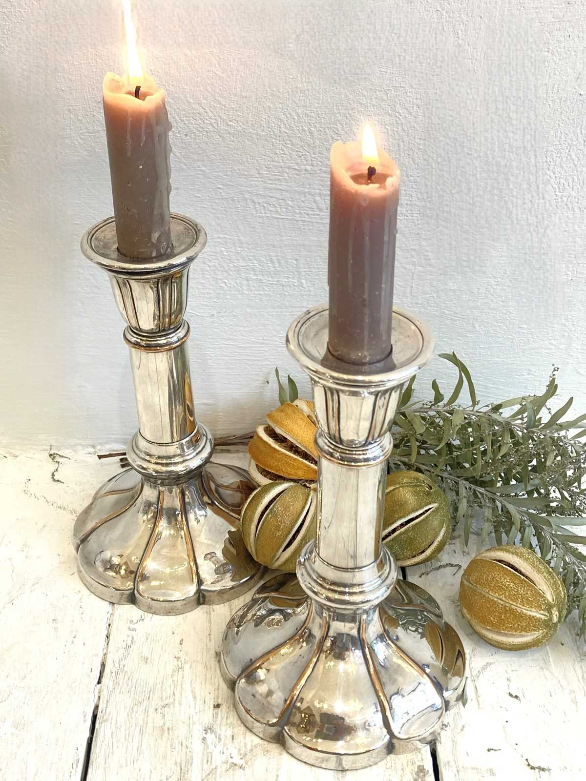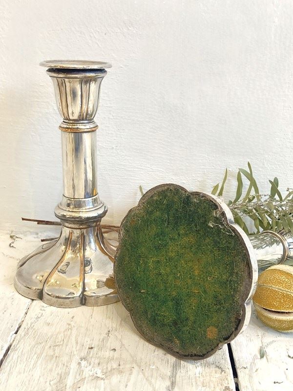 A pretty pair of C19th silver plated candlesticks with a petal shaped base. These were originally telescopic, which means that you could make them higher but the mechanism no longer functions. The plating has worn away on the high points to show the original copper underneath, which actually serves to emphasize the pretty shape of the base!
