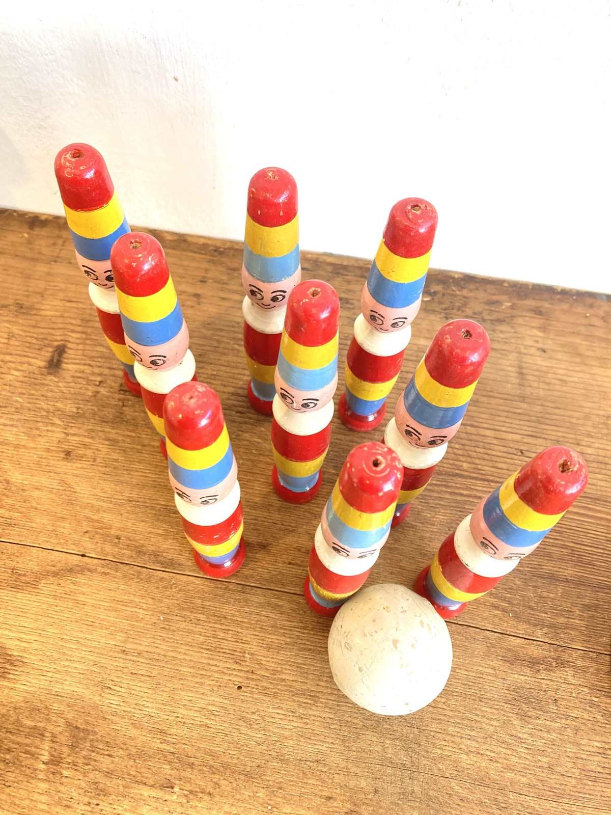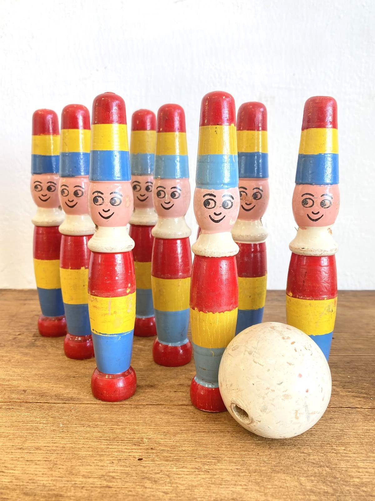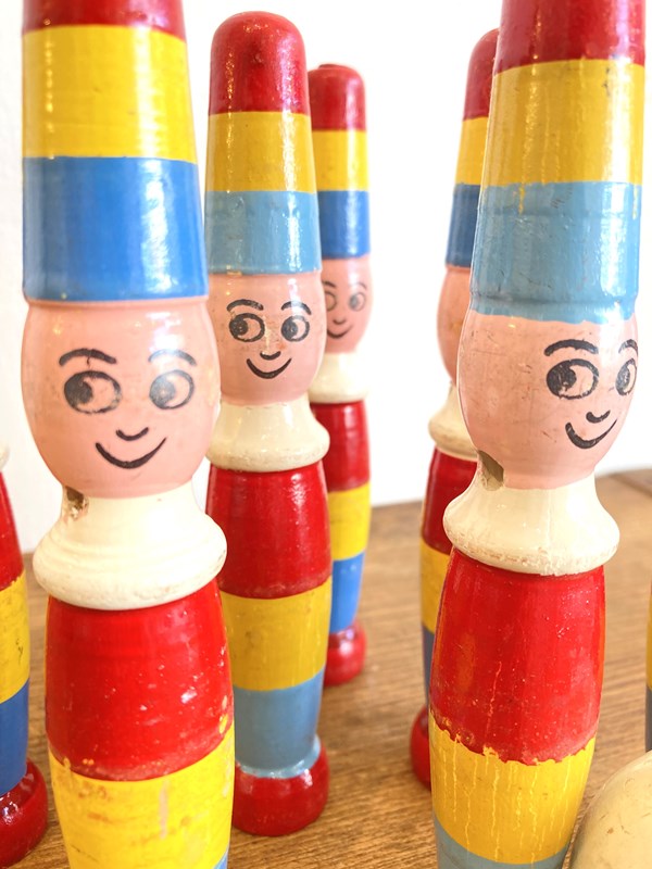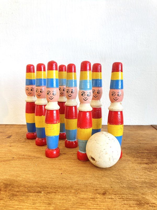 We've got a real soft spot for vintage toys and skittles in particular - they're so decorative and fun! This is a vintage set of 9 pins with the original ball are modelled as very happy clowns - perfect for a nursery or playroom.