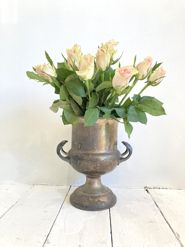 A classical urn-shaped silver plated champagne bucket with ornate scrolling handles either side and stepped round base. Left entirely as we found it - tarnished, loved and used, this would make a wonderful planter, vase or to chill your bubbles as originally intended!
