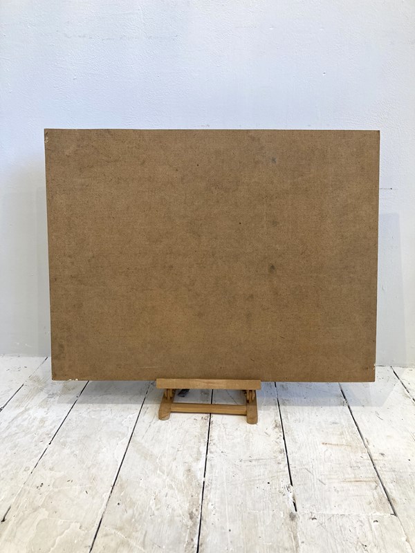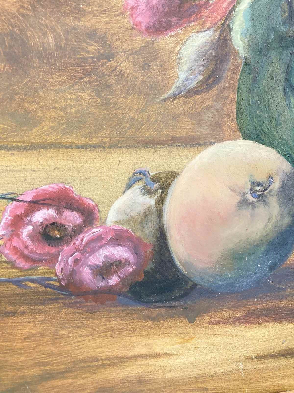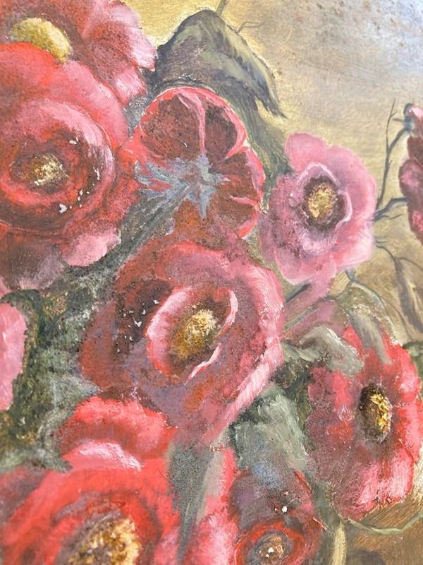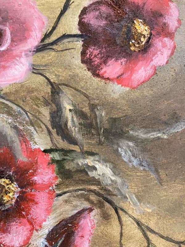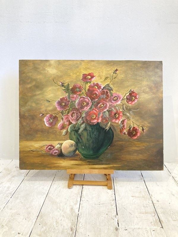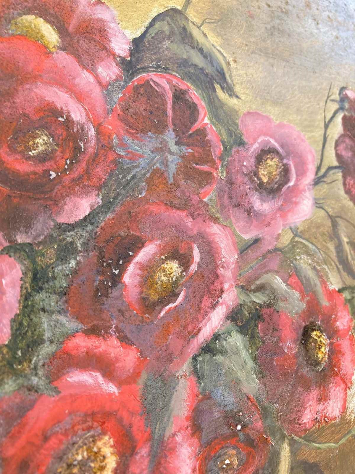 A striking vintage landscape oil on board of a vase full of deep red peonies/roses - unsigned but nicely done and very decorative.