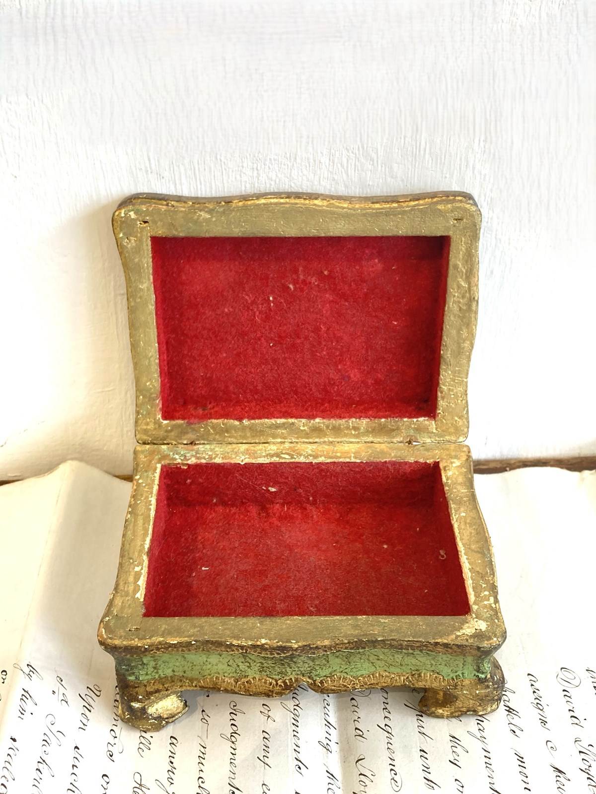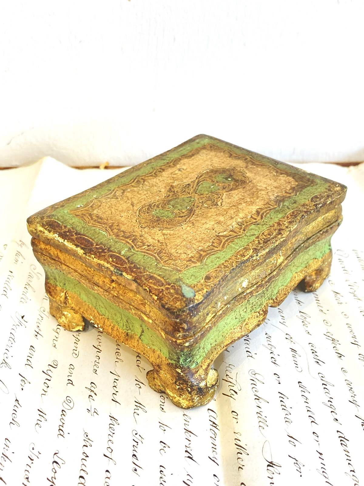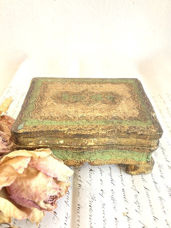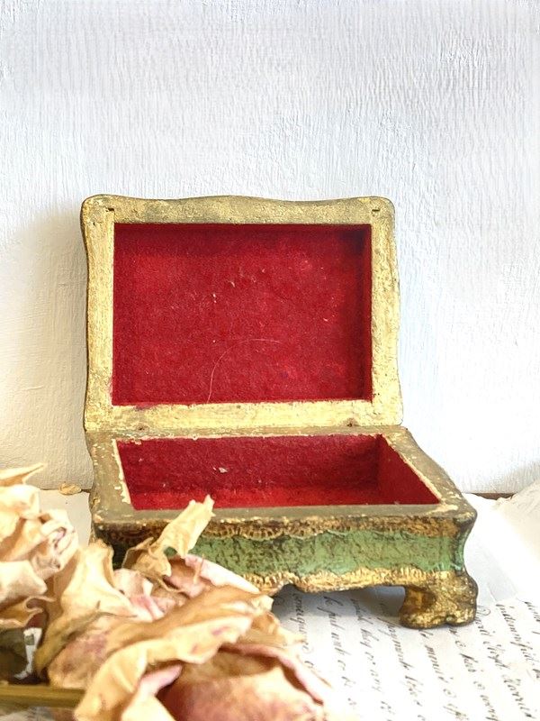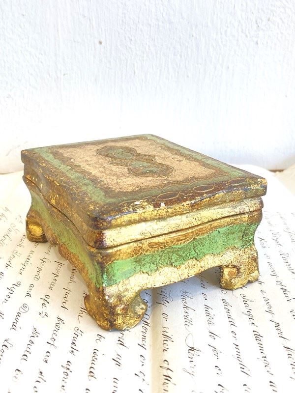 A pretty little vintage Florentine box or casket, hand carved and decorated with gilt and handpainted details in green. The delicate scalloped edges and sweet little bracket feet make this a really nice example in good condition.