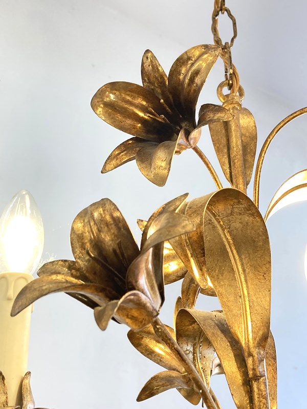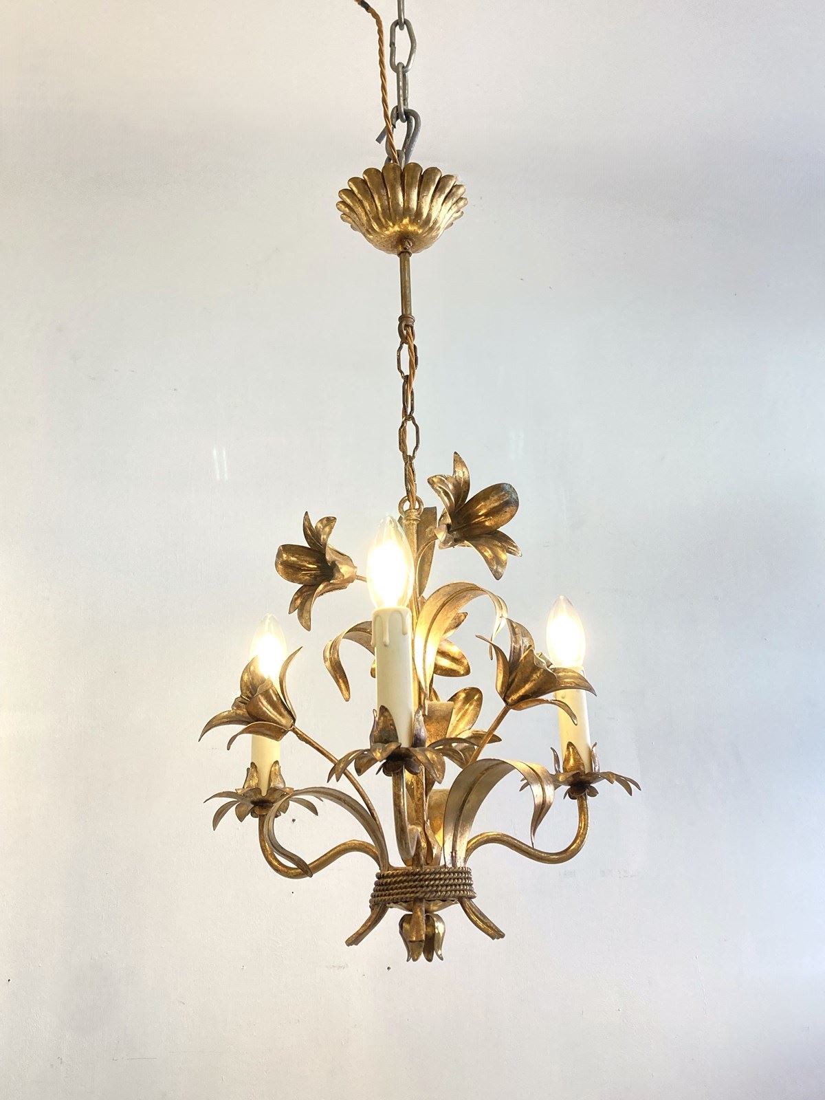 This light is based upon the French ecclesiastical candelabra that were commonly used in churches and chapels featuring cast lilies and leaves. With three arms, this has a lovely balance to it and is decorative and pretty without being overwhelming. There is a length of chain terminating in the original brass ceiling rose.