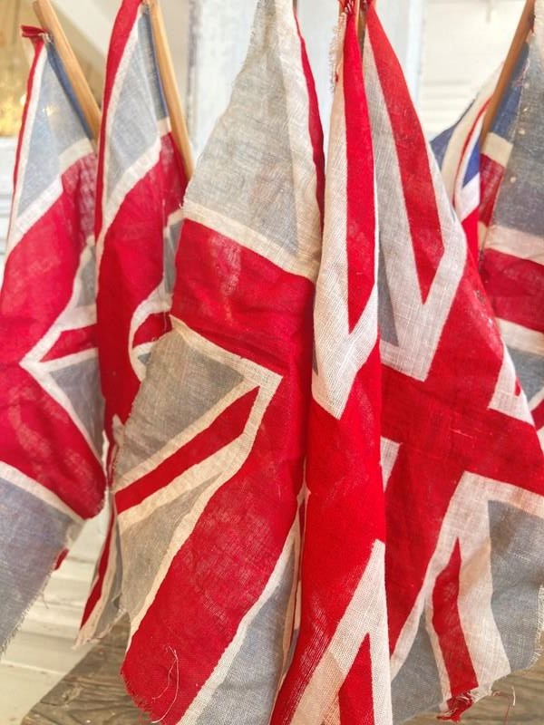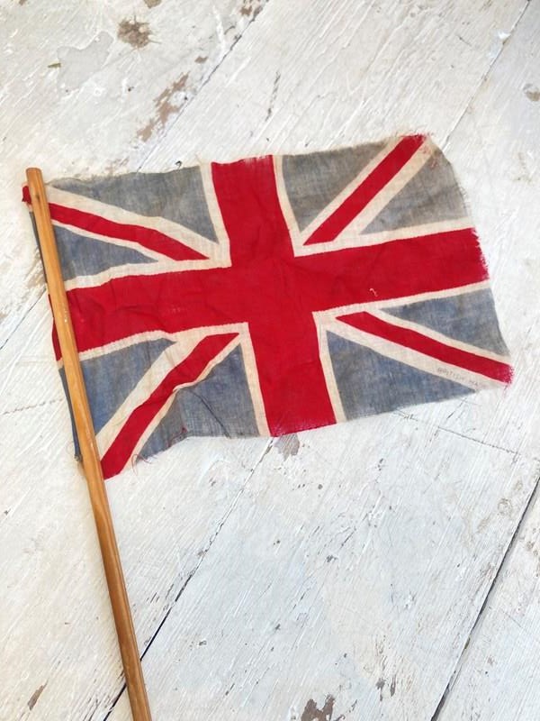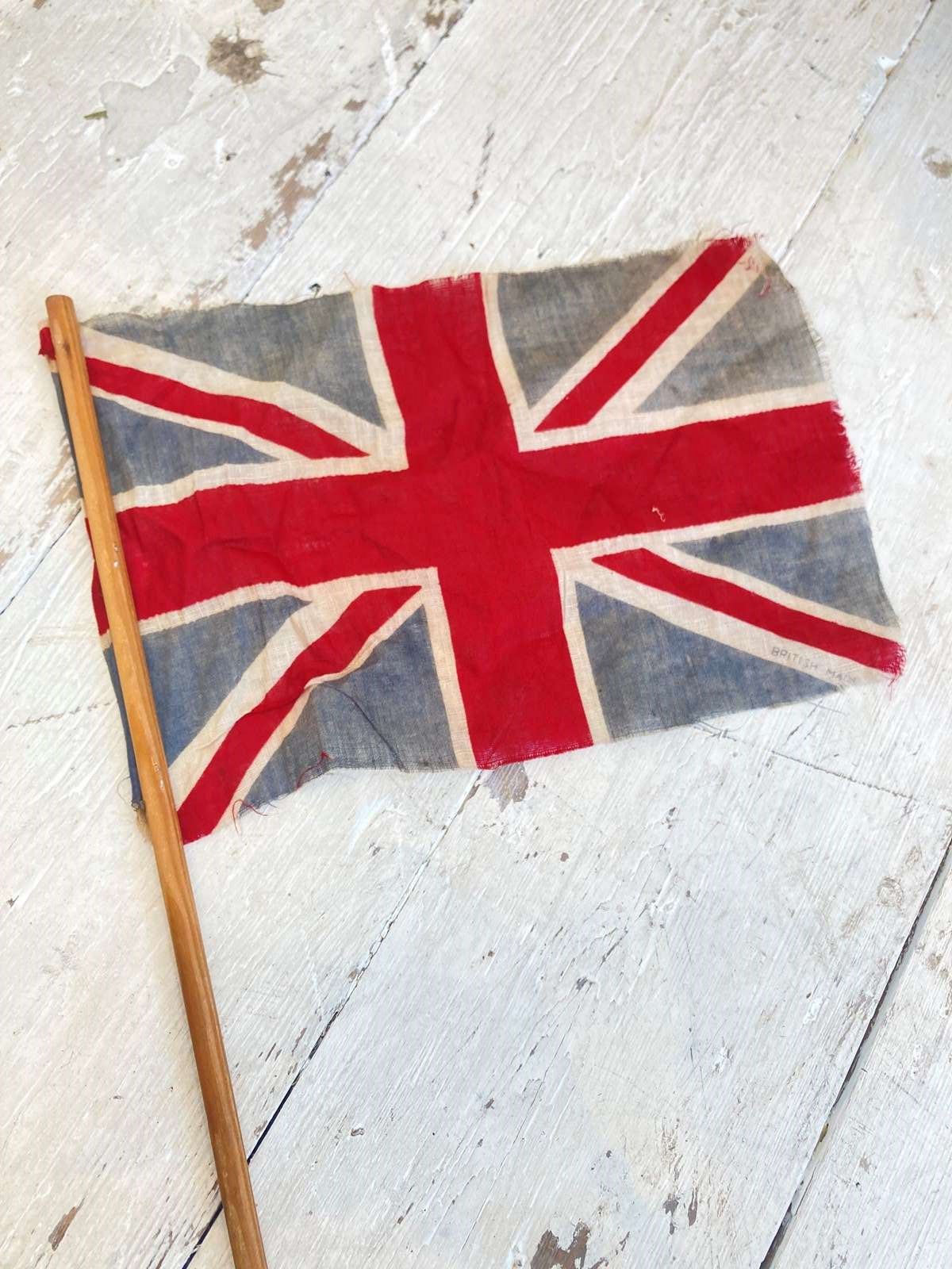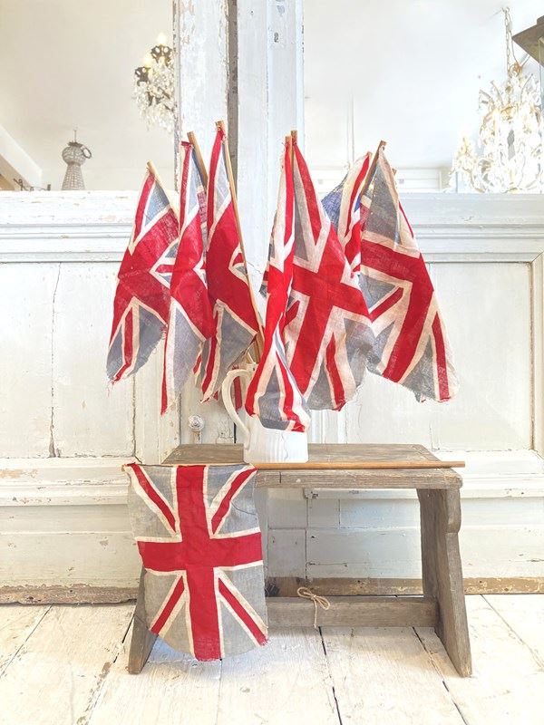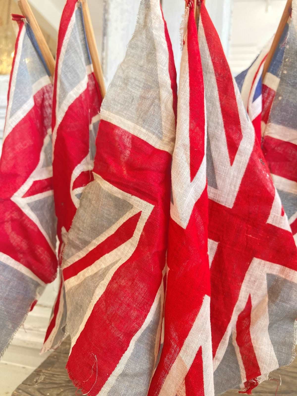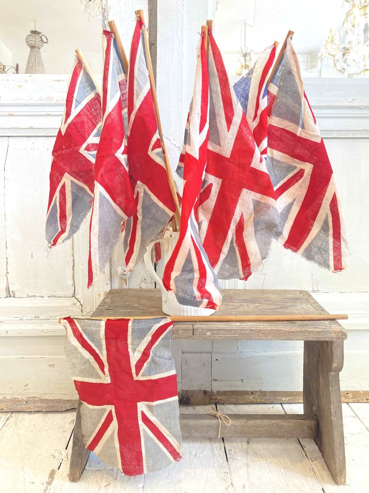 A lovely collection of vintage Union Jack flags on little wooden poles, Probably dating from the 1940's - 50's they're gently faded but in good condition with 'British Made' stamped on the corner. Sllight fraying at the edges which just adds to the vintage appeal.