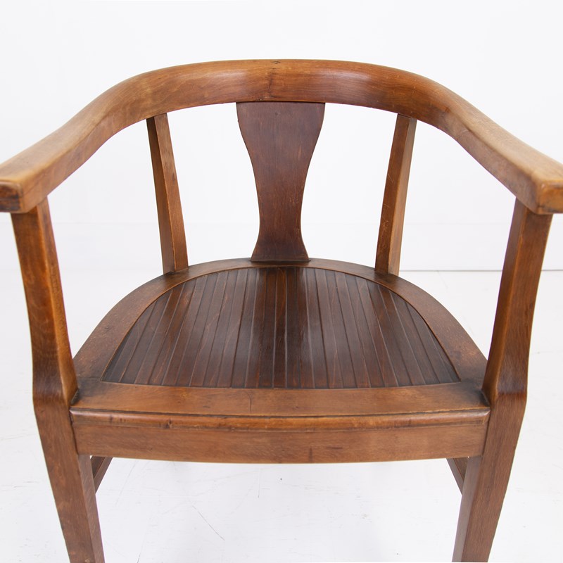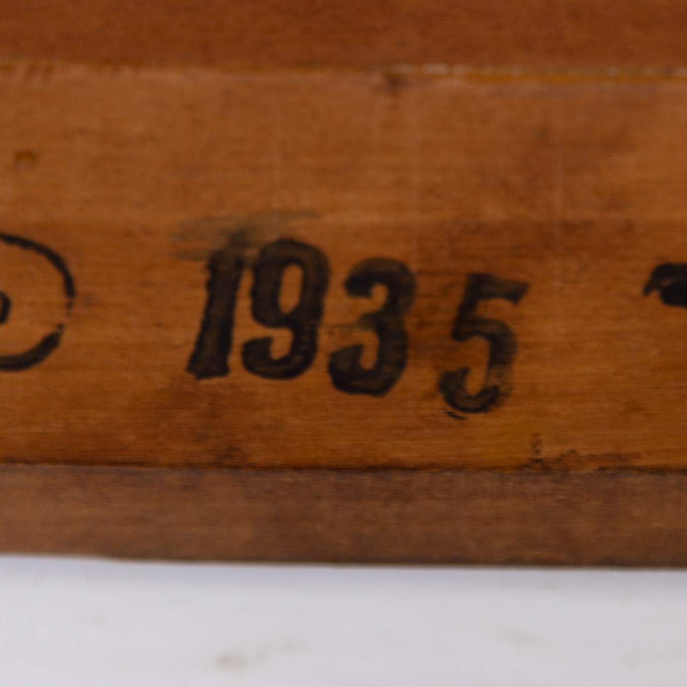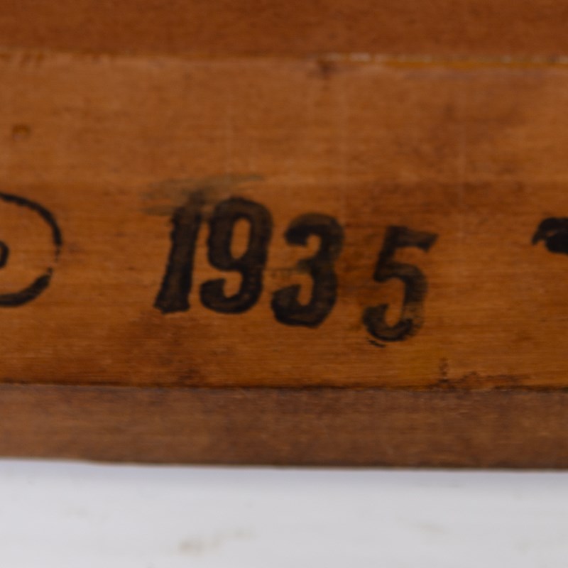 Sitting in lovely time-worn condition and dated 1935 underneath the ribbed shaped seats, the chairs have an effortless design very much of the era and are faintly industrial in style with some good width, berth and depth to them.