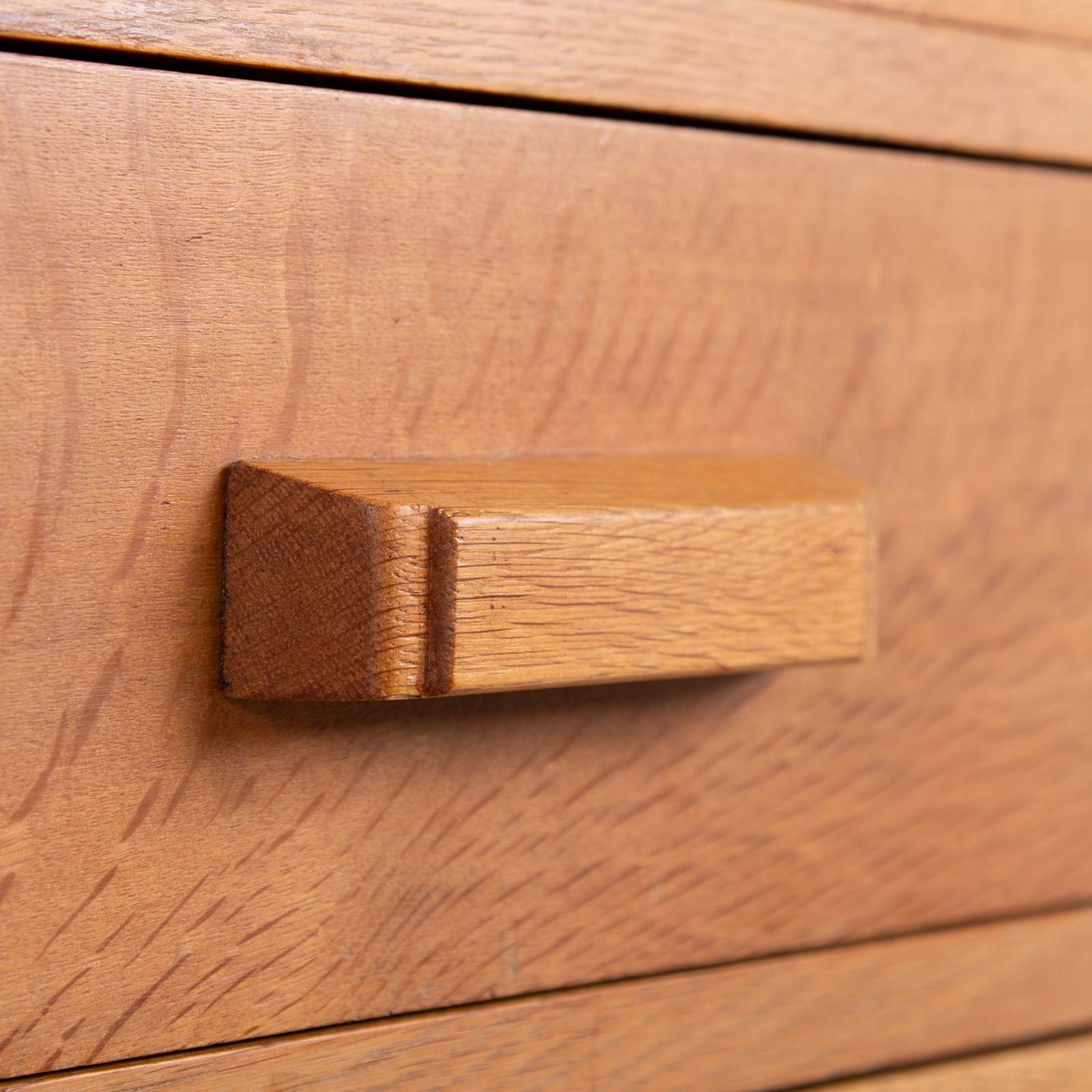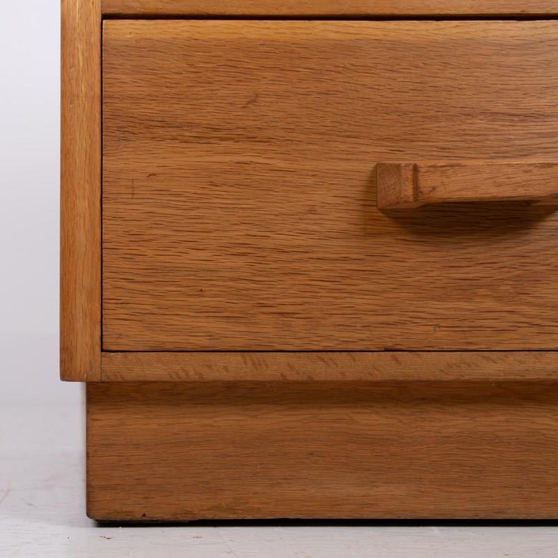 This design has been in favour by the military for a number of years - a flight of 3 deep drawers topped with 2 deep half drawers which works well for storage. This one sits in fine condition after a careful repolish in our workshop. We have the well shaped oak handles in situ and the inverted bottom plinth works well. Expect a few marks to the top, nothing nasty with a good tone of oak.