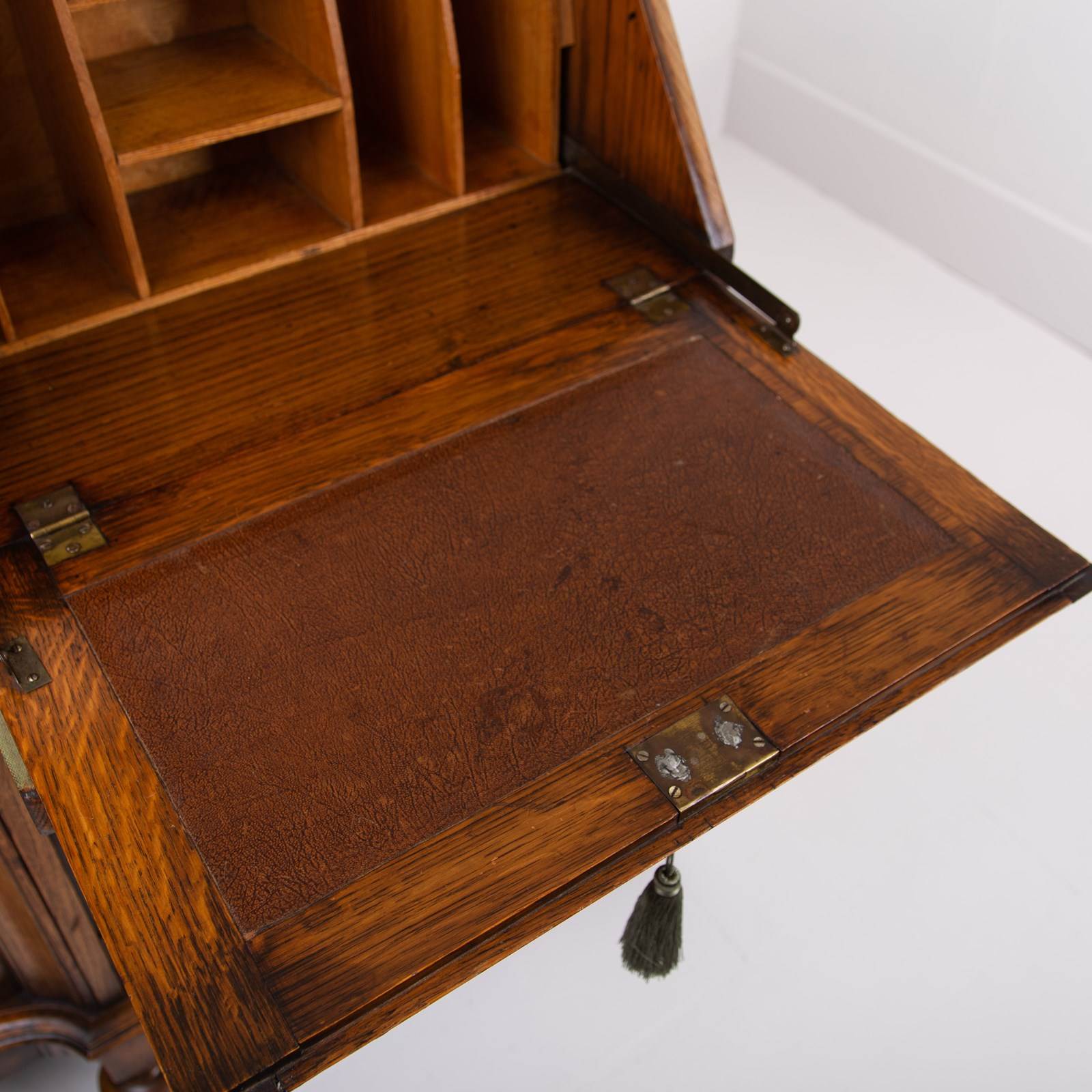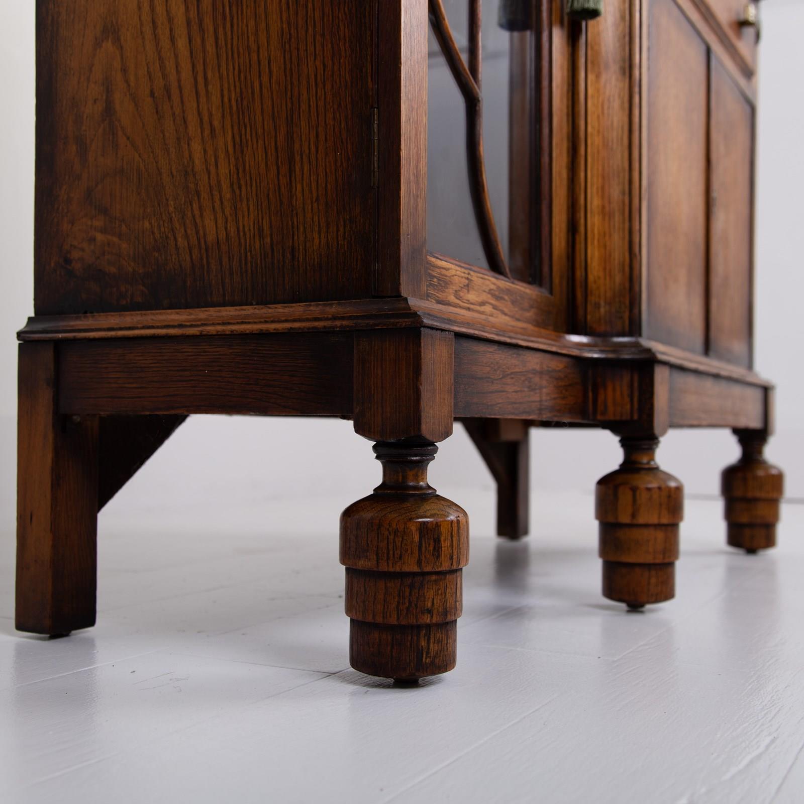 Condition is good - we have the original grained chocolate brown leather writing inset to the inside alongside some useful little pigeon holes, we have 3 working locks with two keys, adjustable shelves to the bookcase, a useful little lower cupboard with drawer above and overall its been loved and cherished only showing sensible historic wear - nothing nasty or off putting. Heavy for its scale!