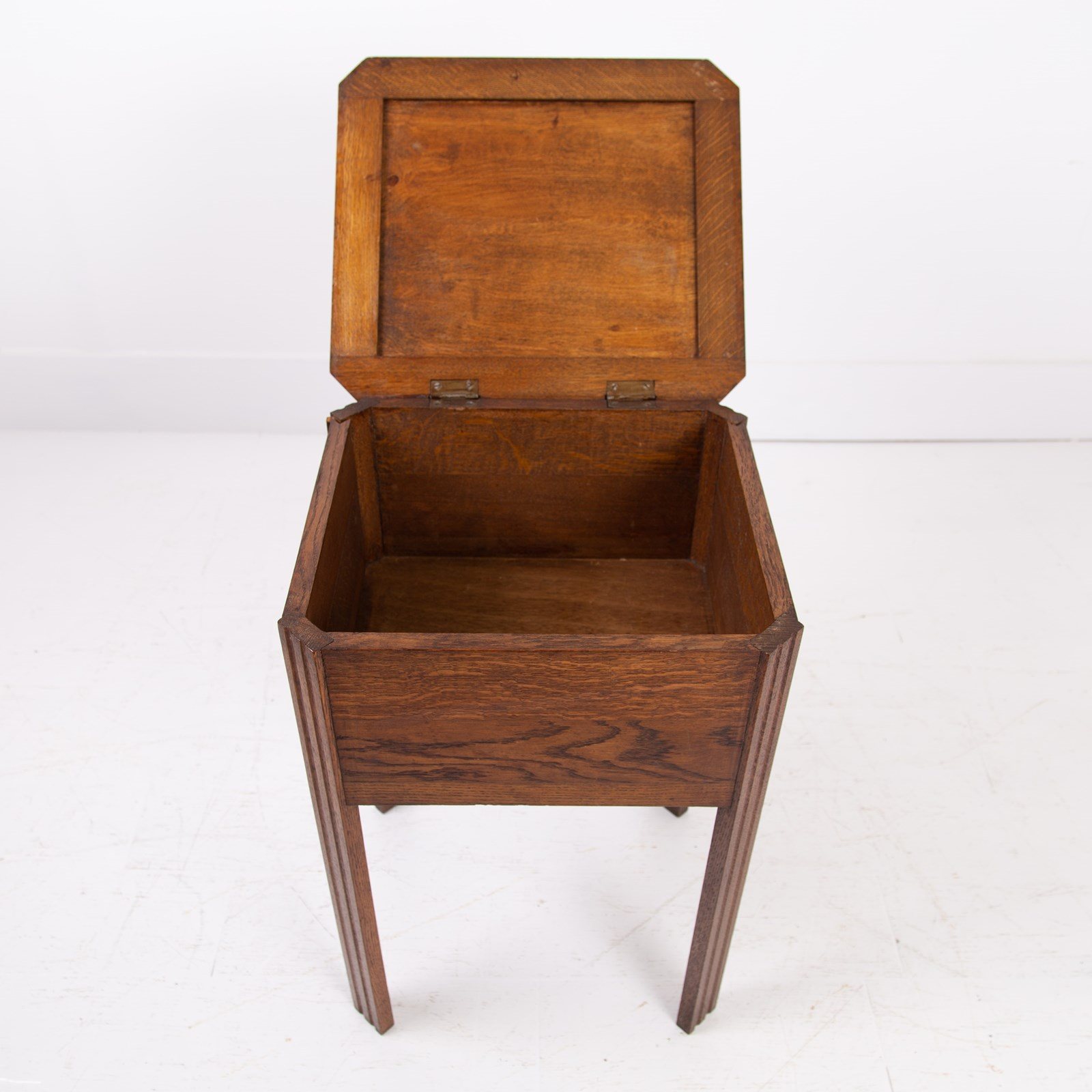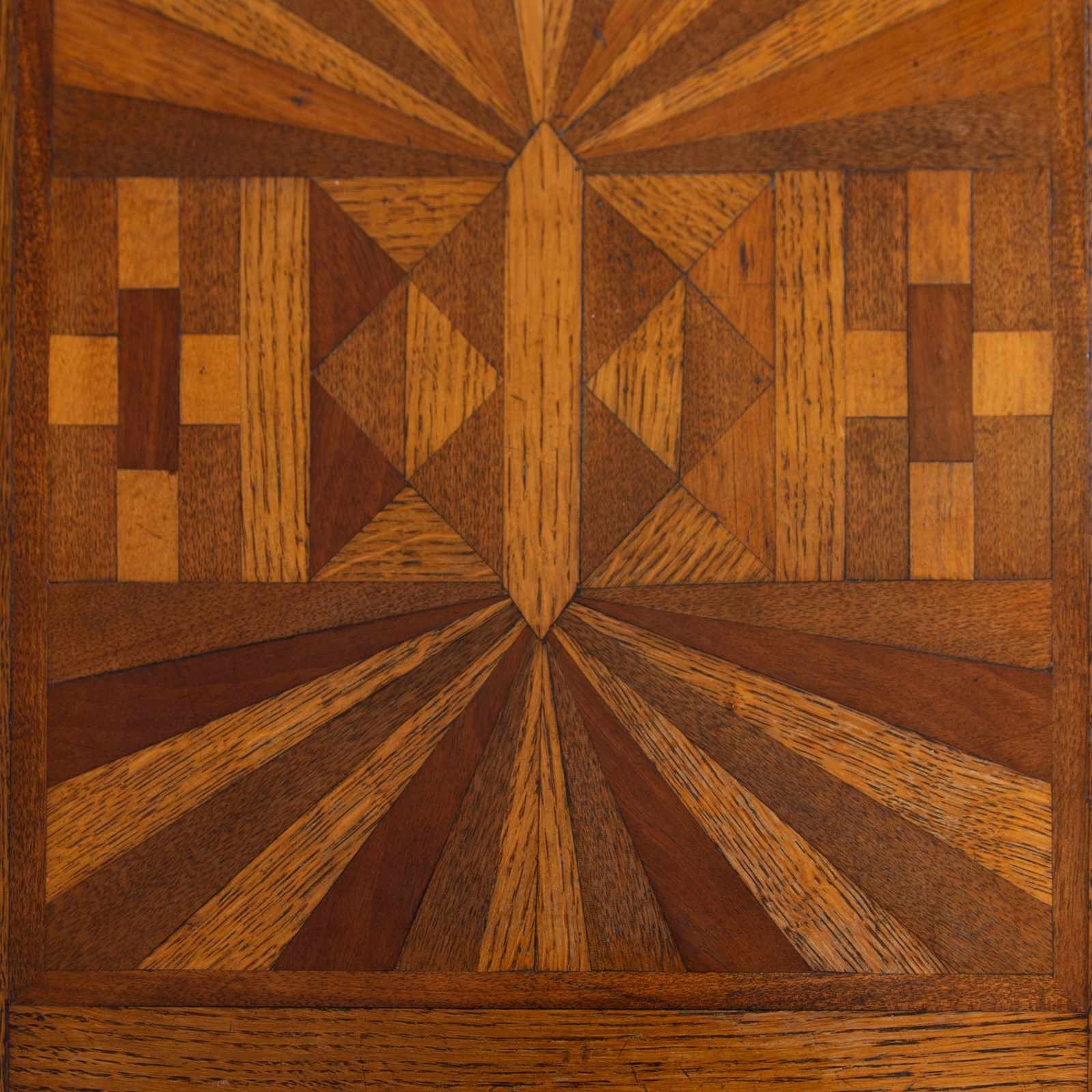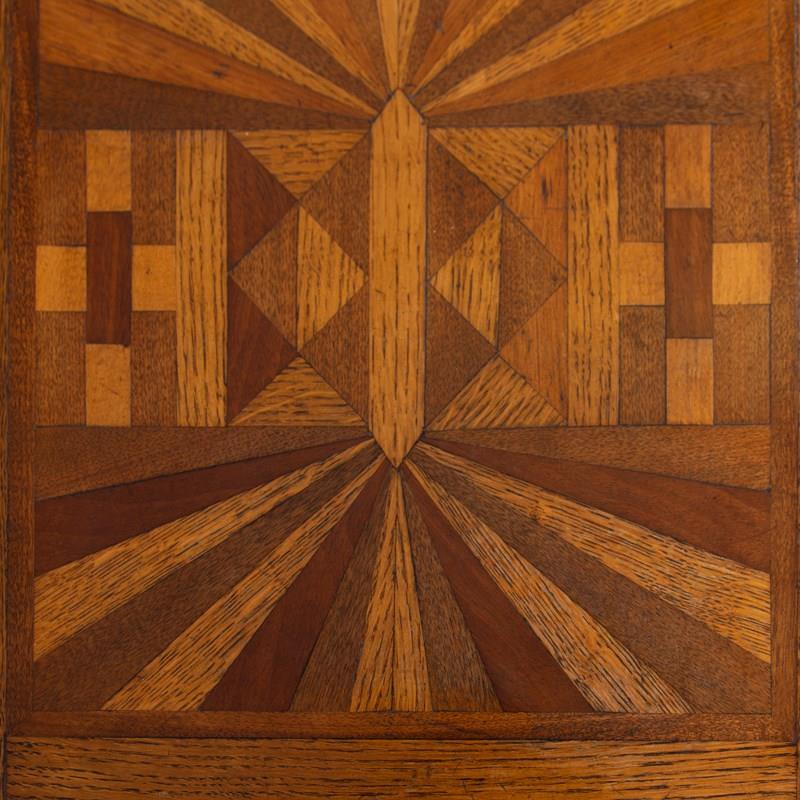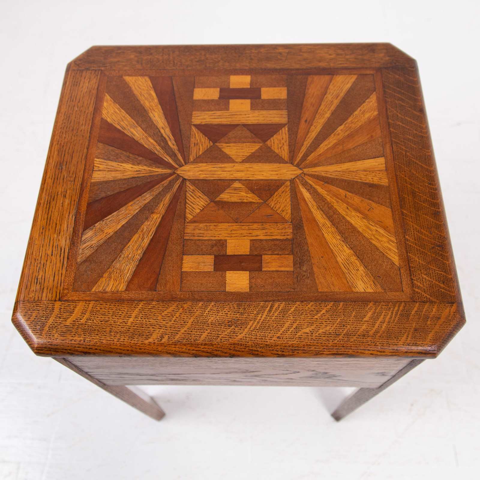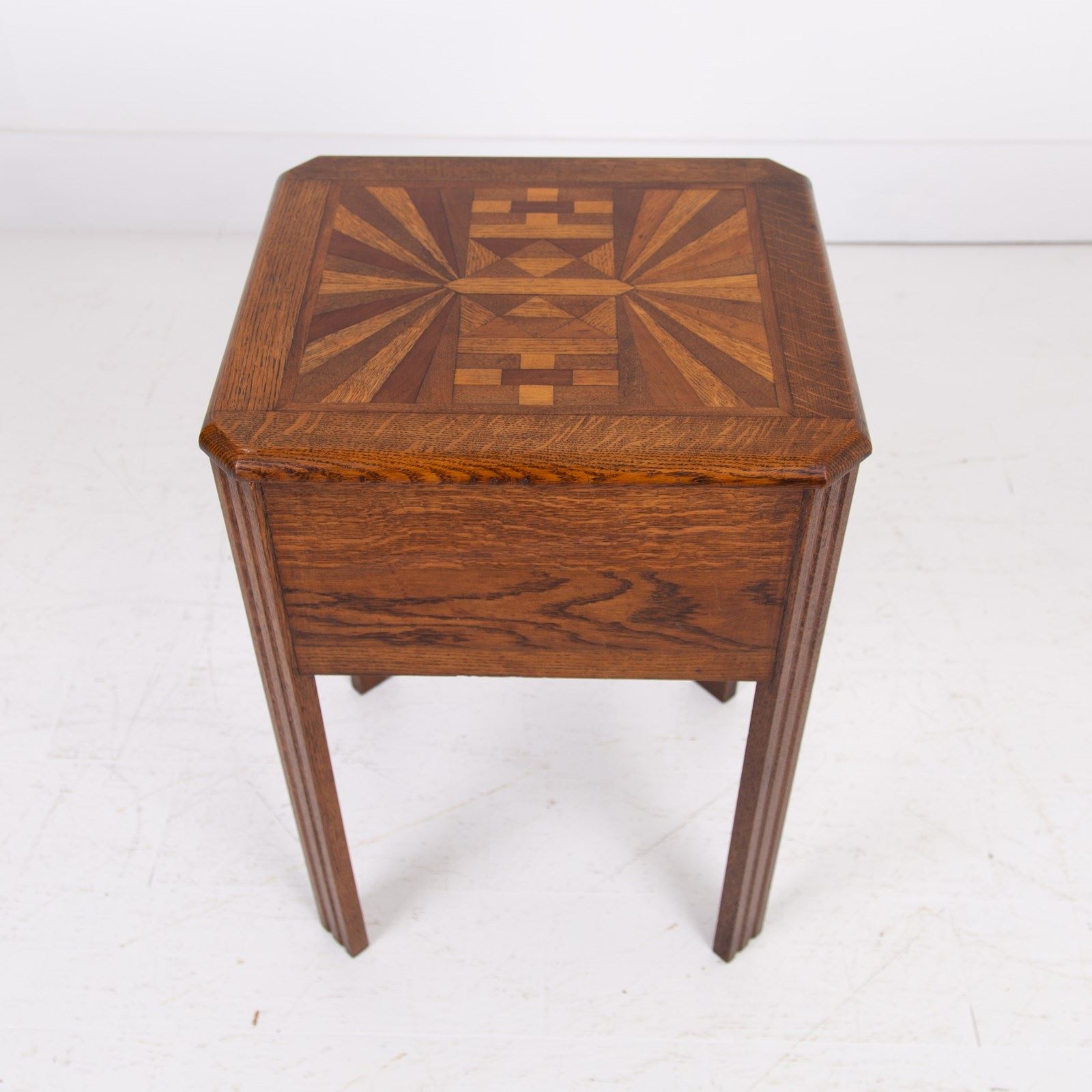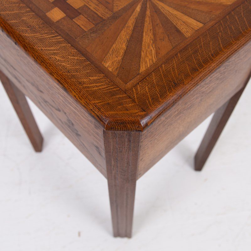 A charming little 1930s English oak side table with its deco inspired parquetry top using different tones of oak and walnut. We have not come across one before so here it is with its deco shaped legs and useful storage.