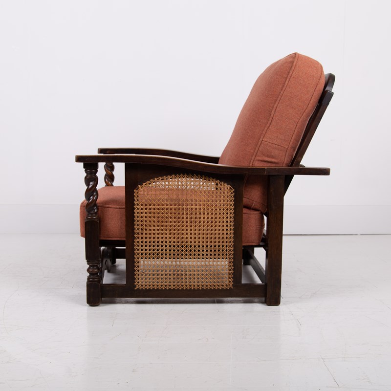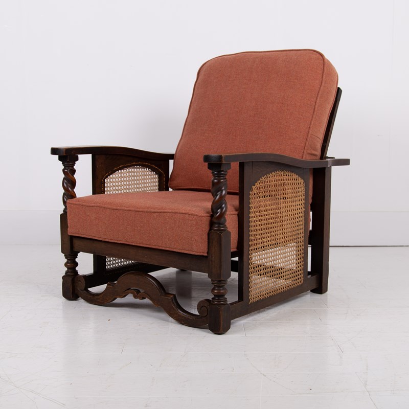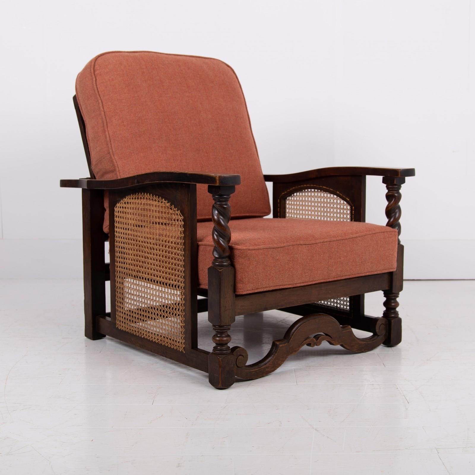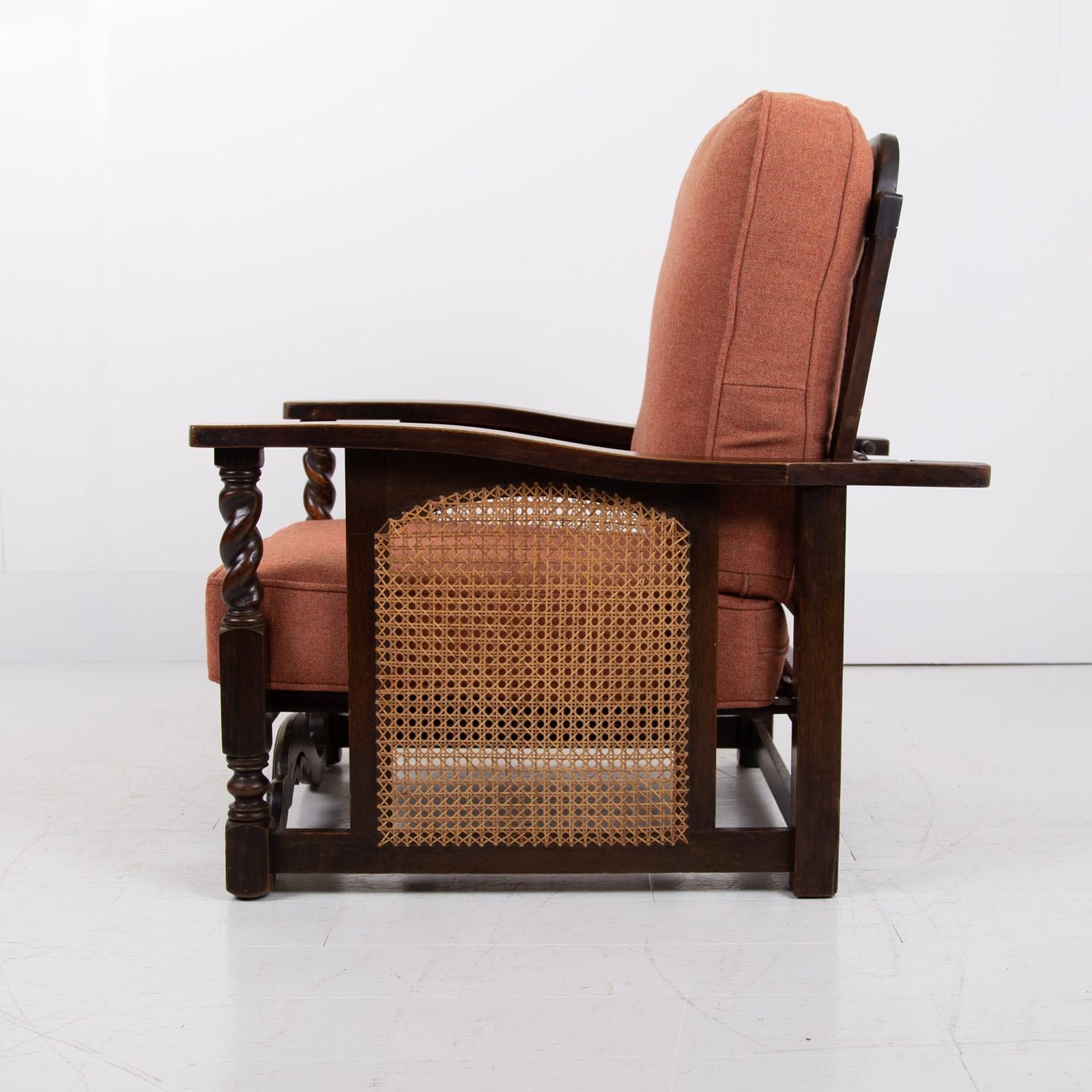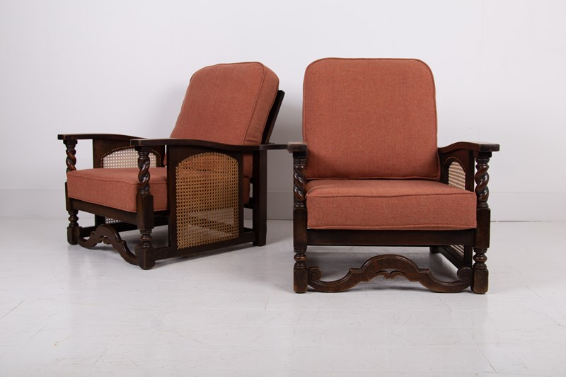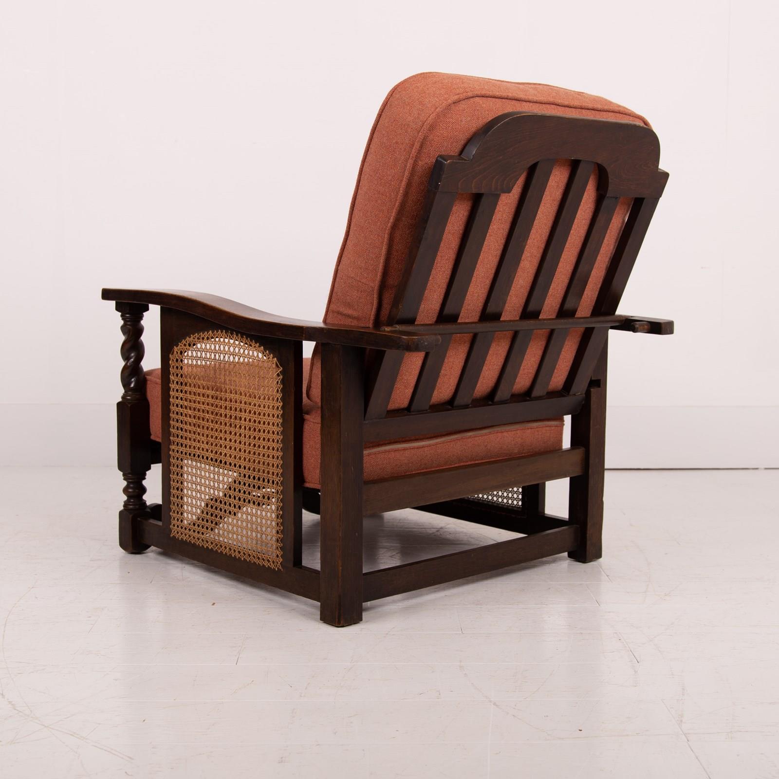 Great looking pair of English oak reclining armchairs with attractive newly caned sides, turned arms, well endowed frames and new deep piped cushions in a Braemar wool herringbone fabric in burnt clementine shade. These not only look good but are also comfortable to sit in.