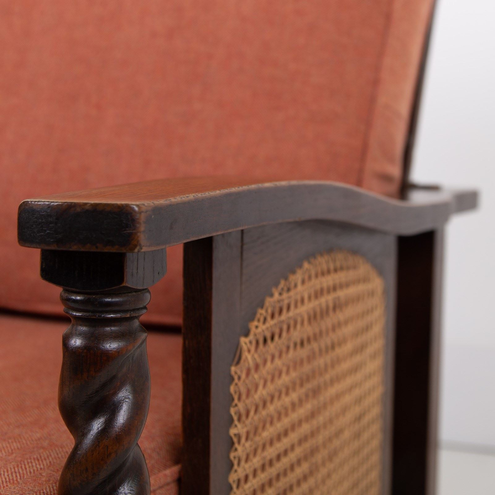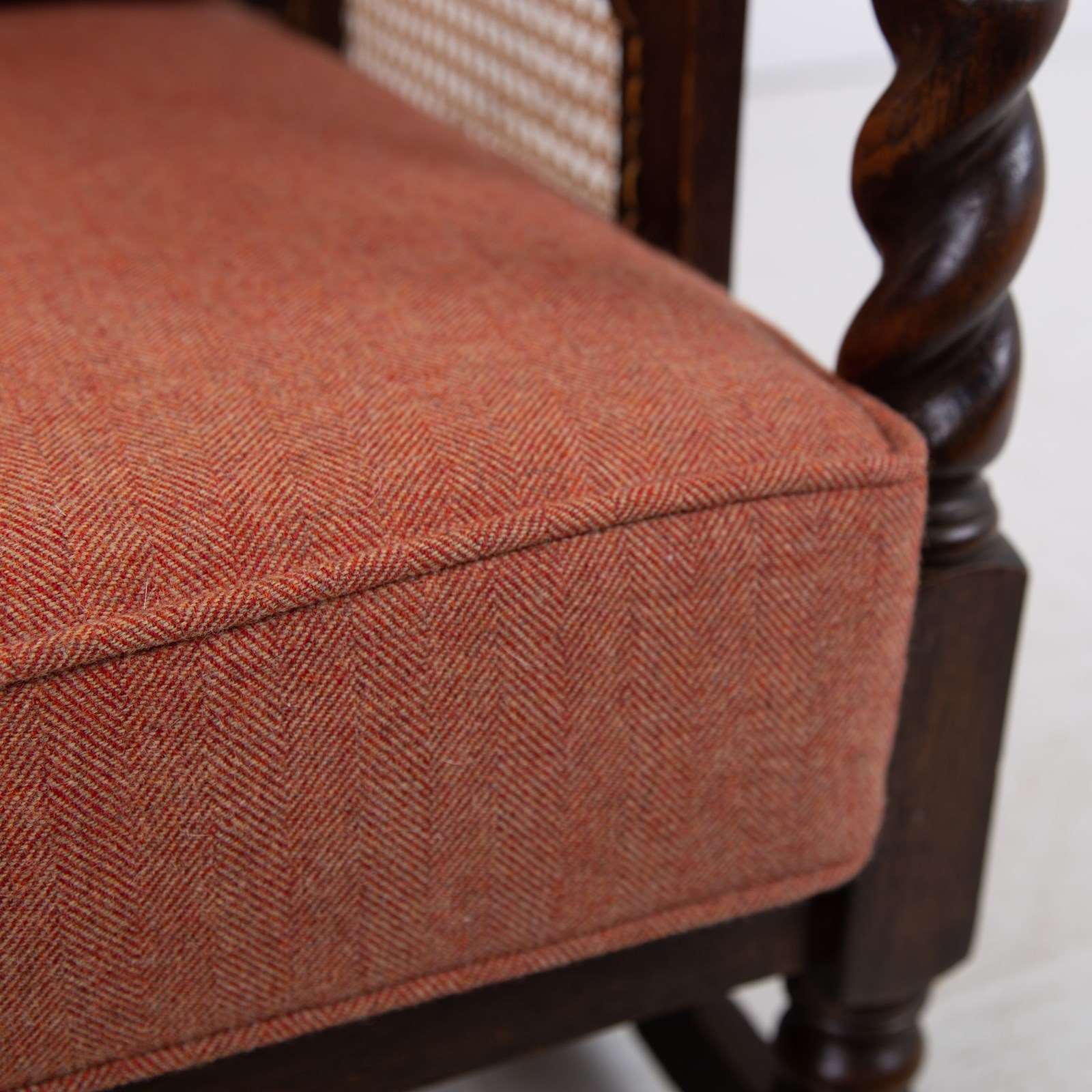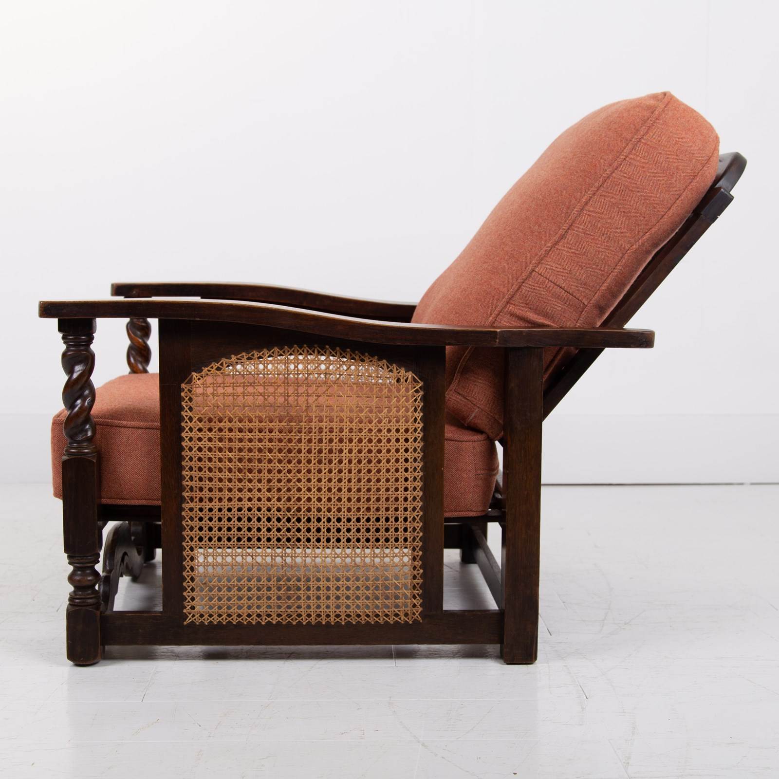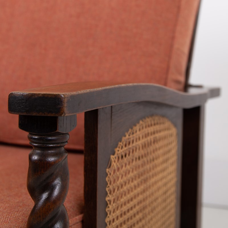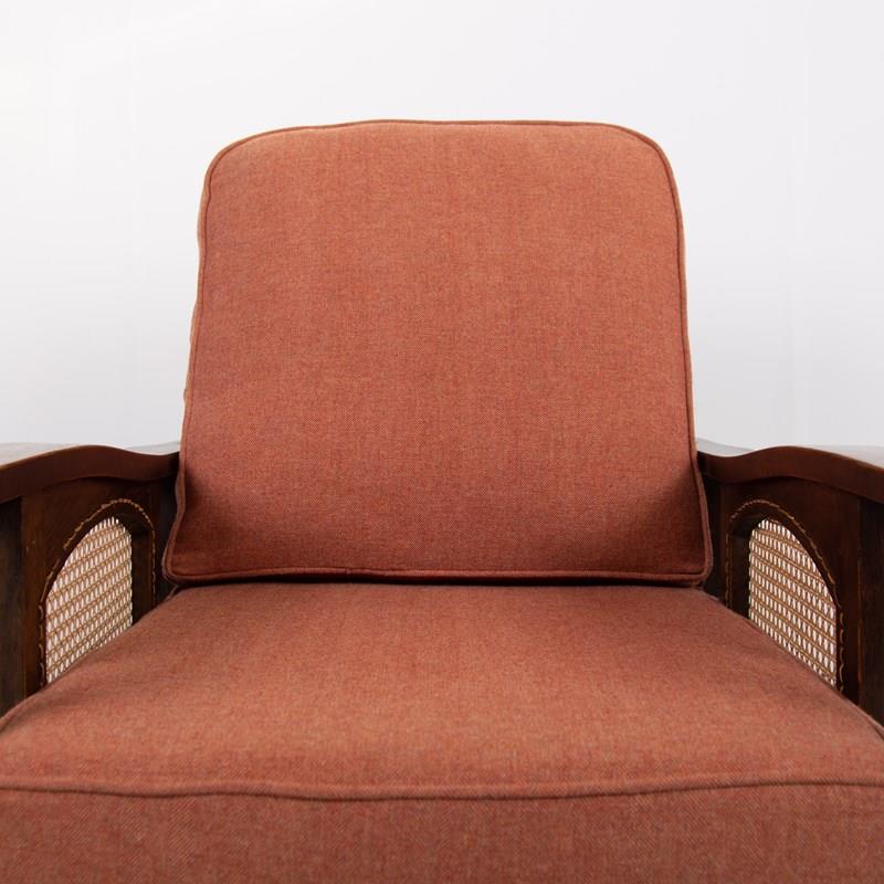 Great looking pair of English oak reclining armchairs with attractive newly caned sides, turned arms, well endowed frames and new deep piped cushions in a Braemar wool herringbone fabric in burnt clementine shade. These not only look good but are also comfortable to sit in.