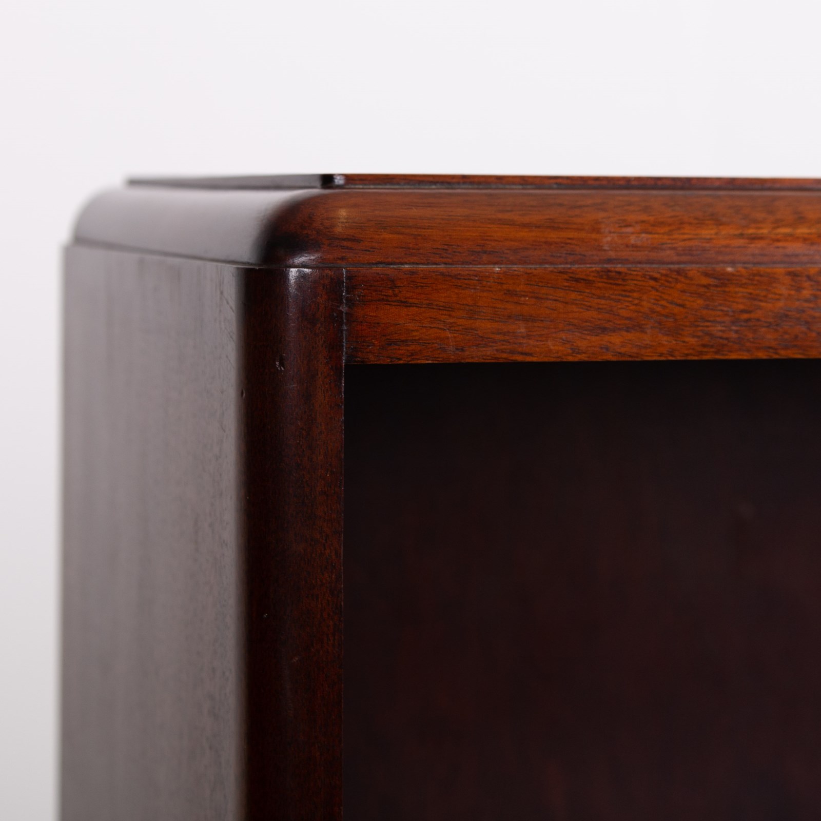 Well proportioned in size, this one sits very nicely with its 4 fixed shelves, inverted plinth, attractive thumbnail profile to the top and overall nicely aged condition. The bookcase is weighty for its size being solid timber and is ready for placing after a light wax in our workshop. Expect a well cared for piece with sensible ageing.