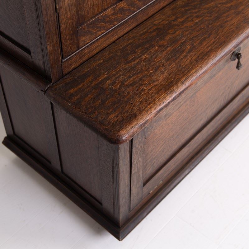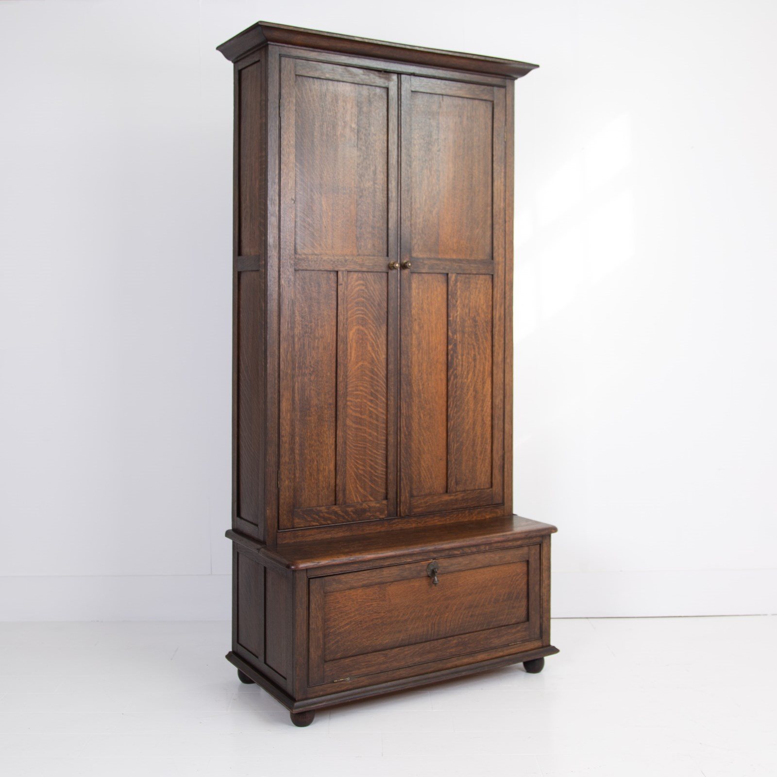 The two long doors hide a number of hooks likely for coats or perhaps it may originally have been a church piece for the storage of cassocks. Underneath this we have a drop down door exposing a long cupboard space for shoes, trainers and slippers. The piece sits in good historical order with age knocks and bumps. We have cleaned the piece and ensured its ready to place.