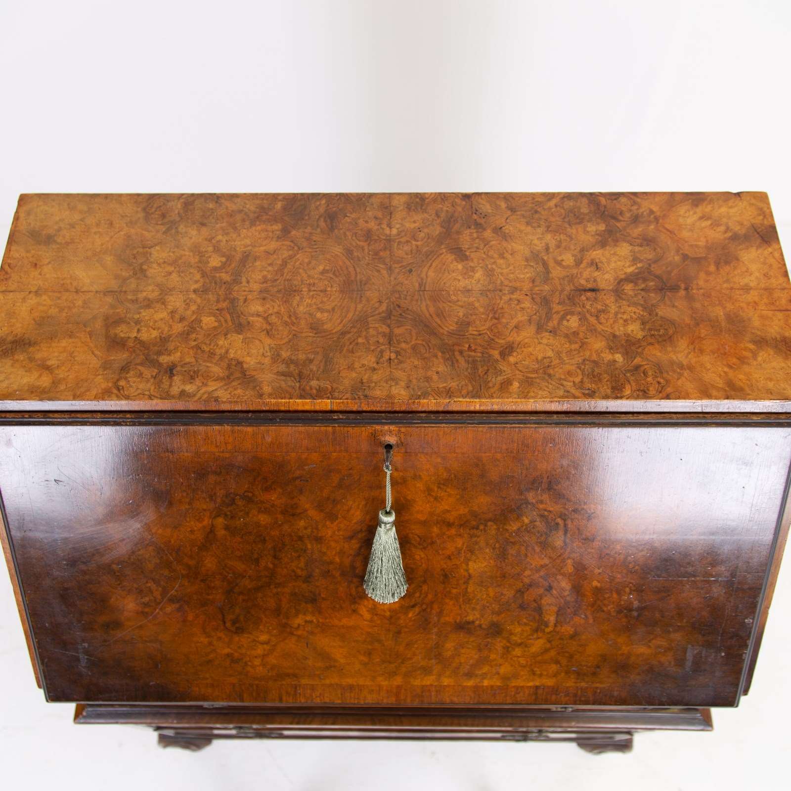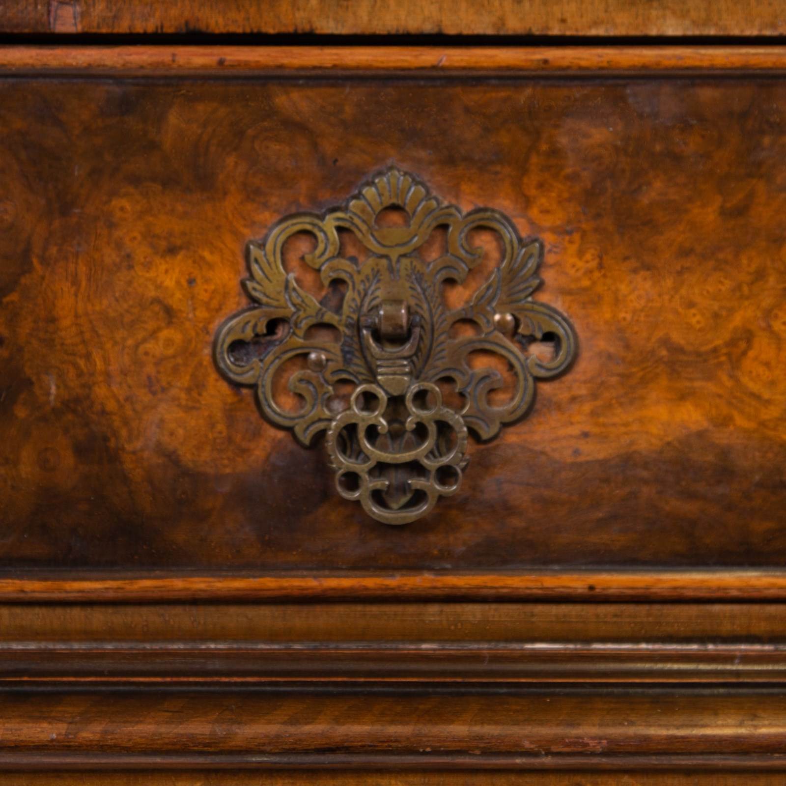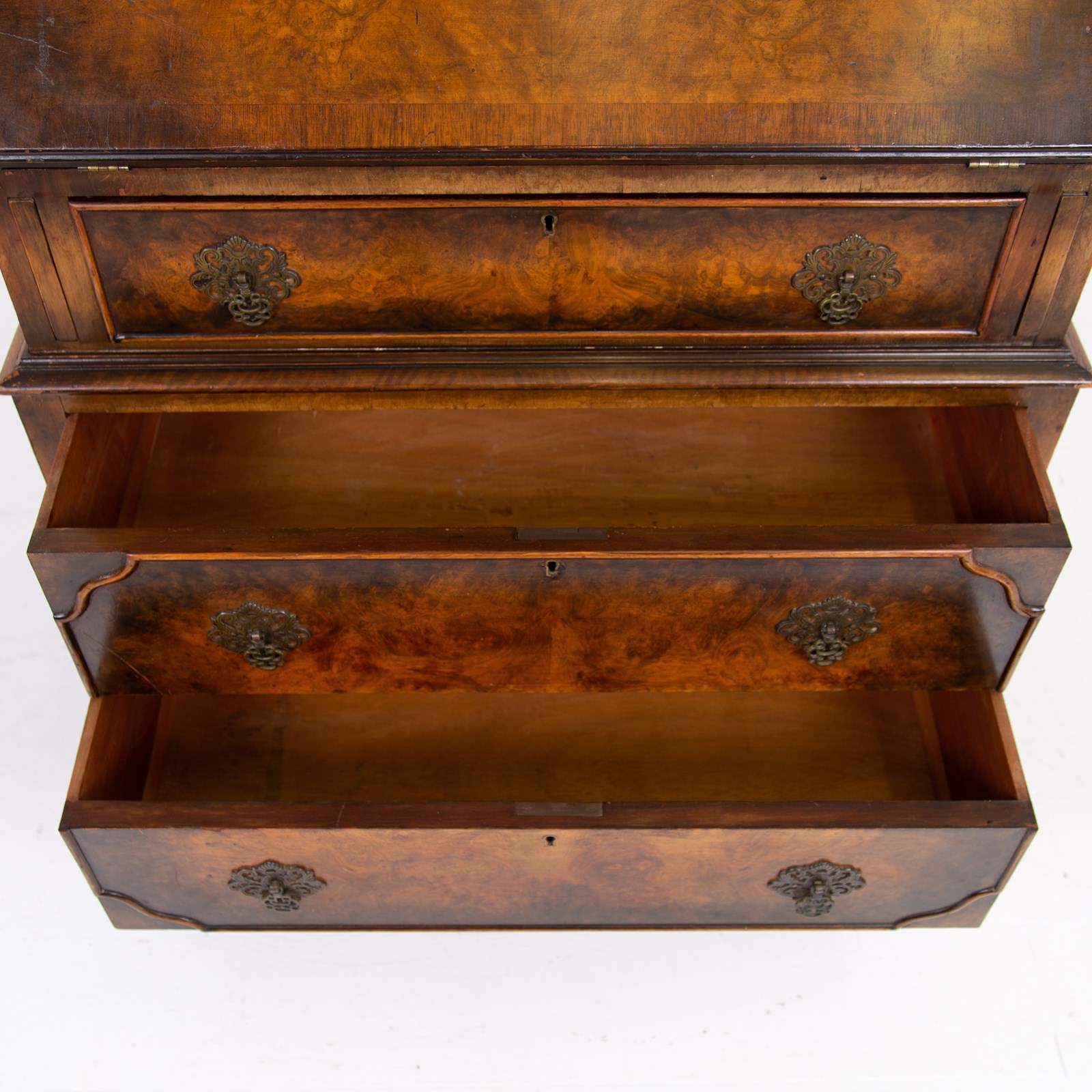 A weighty piece - always a good sign of quality. The drop down work space which opens by way of the original lock and key possesses its original aged leather inset and we have a good arrangement of pigeon holes for storage. The 3 useful and highly decorative figured walnut drawers are opened by the ornate brass handles offering plenty of space and storage. As we said, it all works as it should but expect aging in the right places…