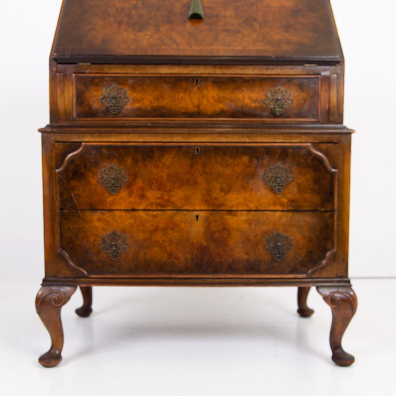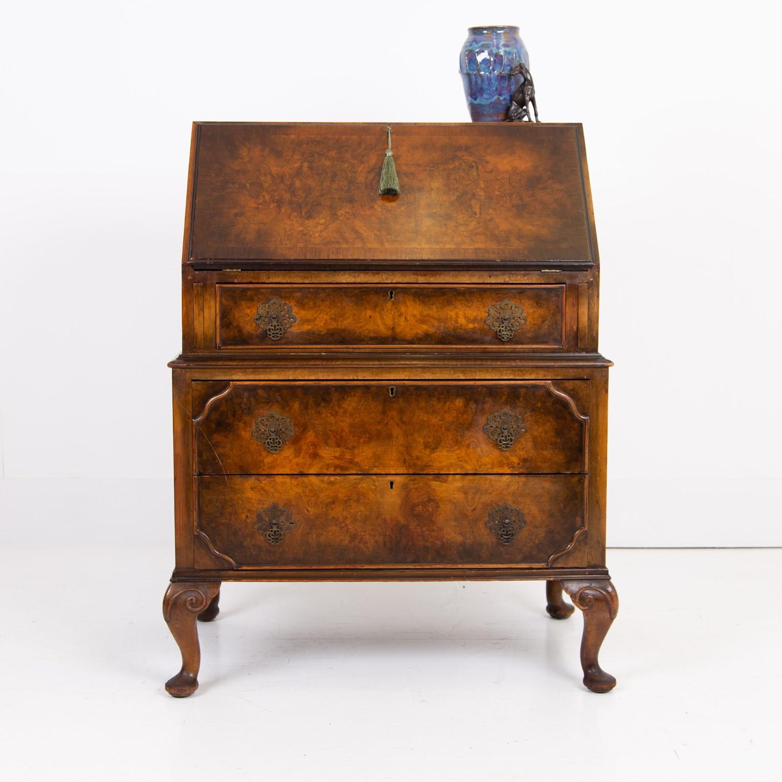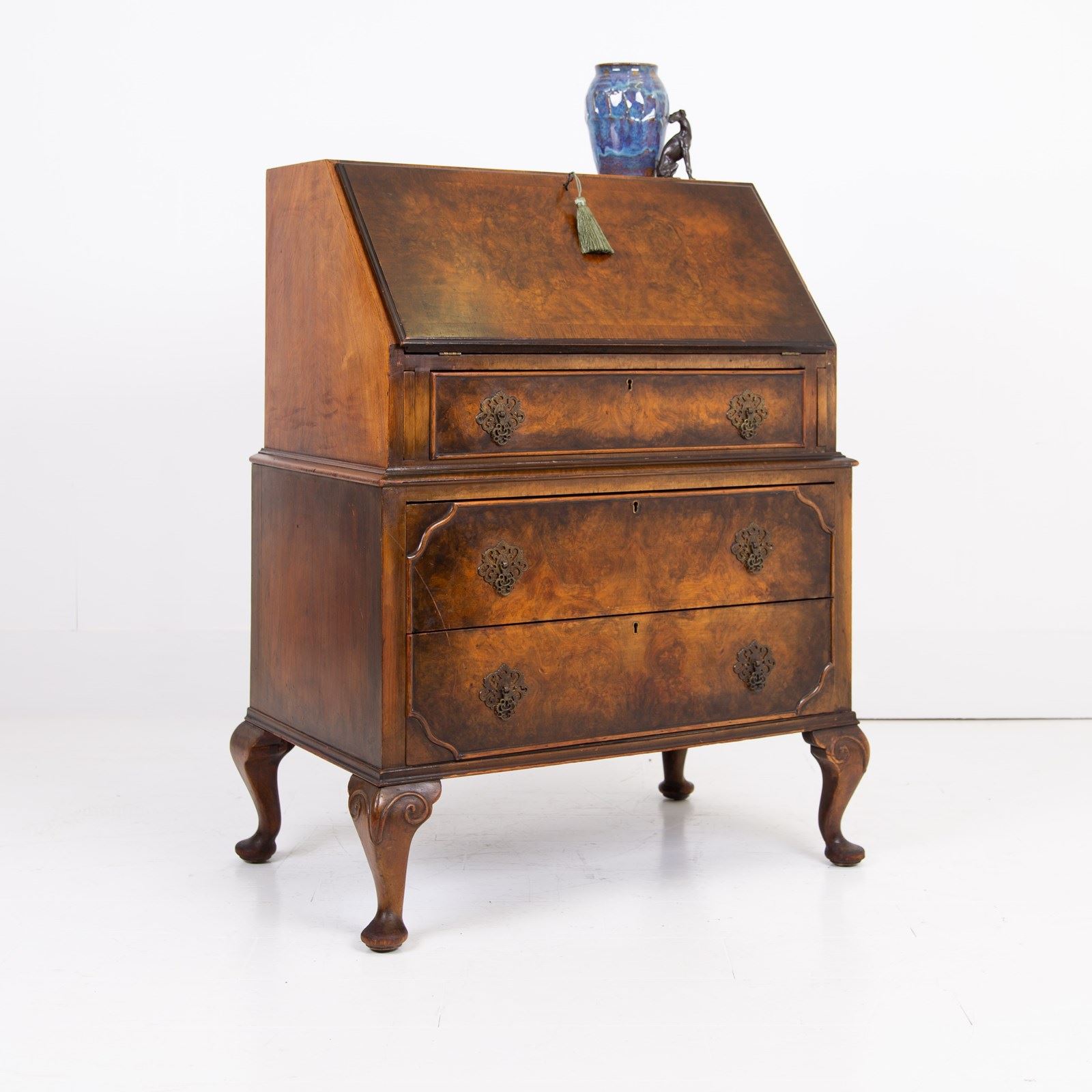 Sitting in lovely aged order we have a good quality walnut 3 drawer bureau raised by cabriole legs. The bureau is in fabulous historic condition having been a one owner piece from a period home in Berkshire - we have genuine wear and the workshop have carefully cleaned the piece without it losing its aged character and personality.