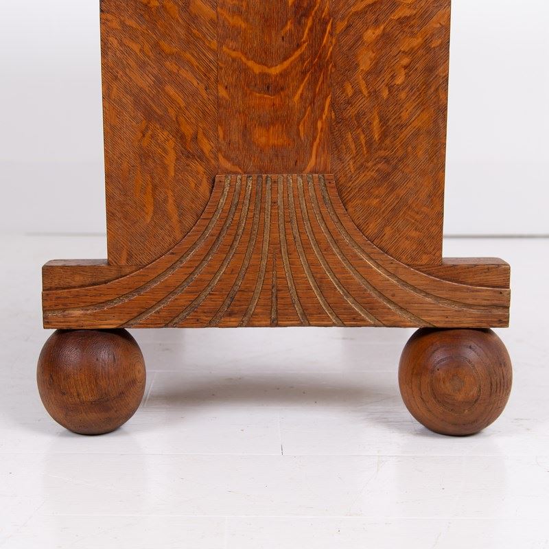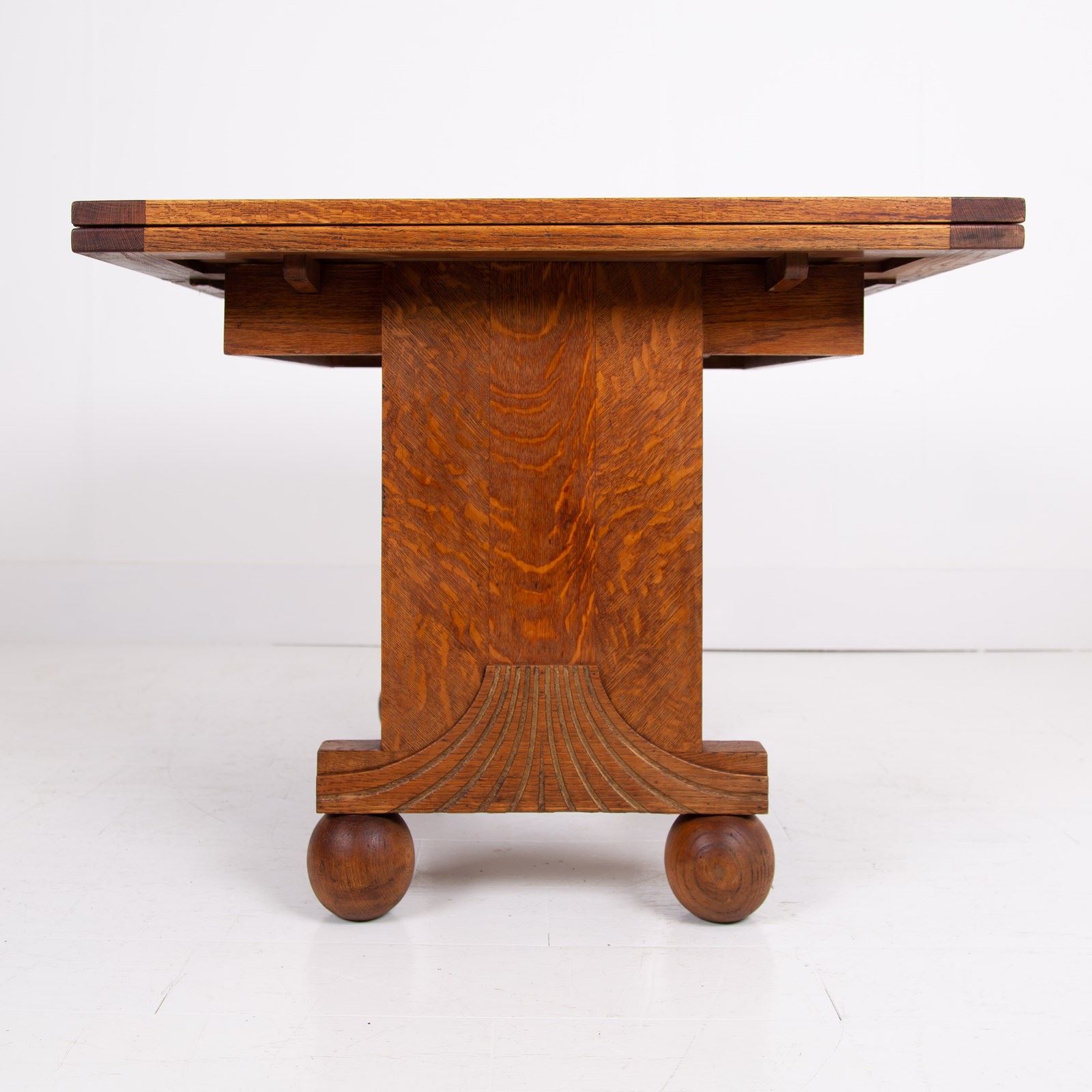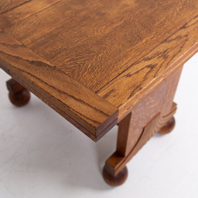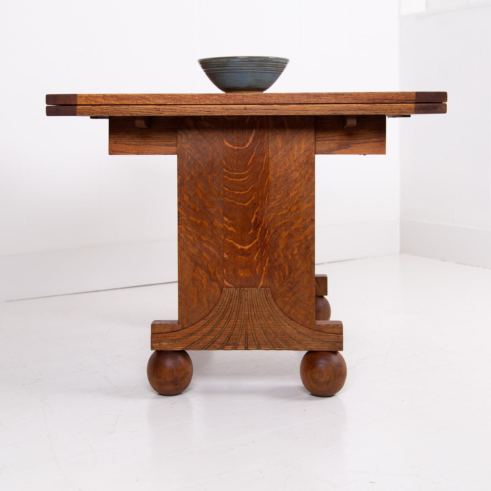 Tremendous looking Art Deco oak dining table by English maker Gomme (label attached). This was the era when Gomme employed designers who were given the opportunity to design very good Art Deco furniture exploring and taking ideas from French pieces. The last one sold by us by Gomme was used as a desk.