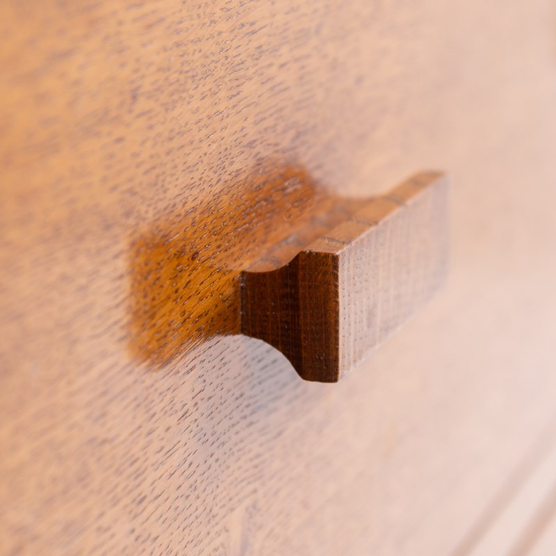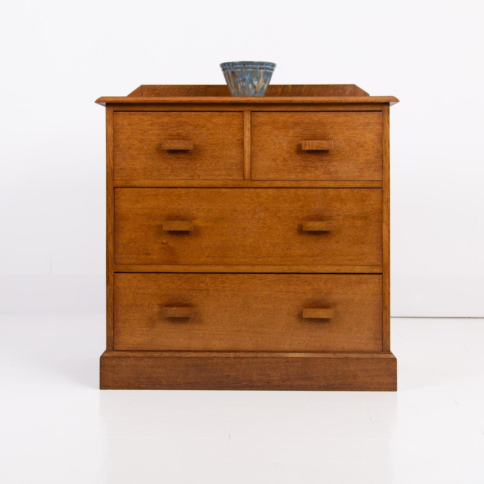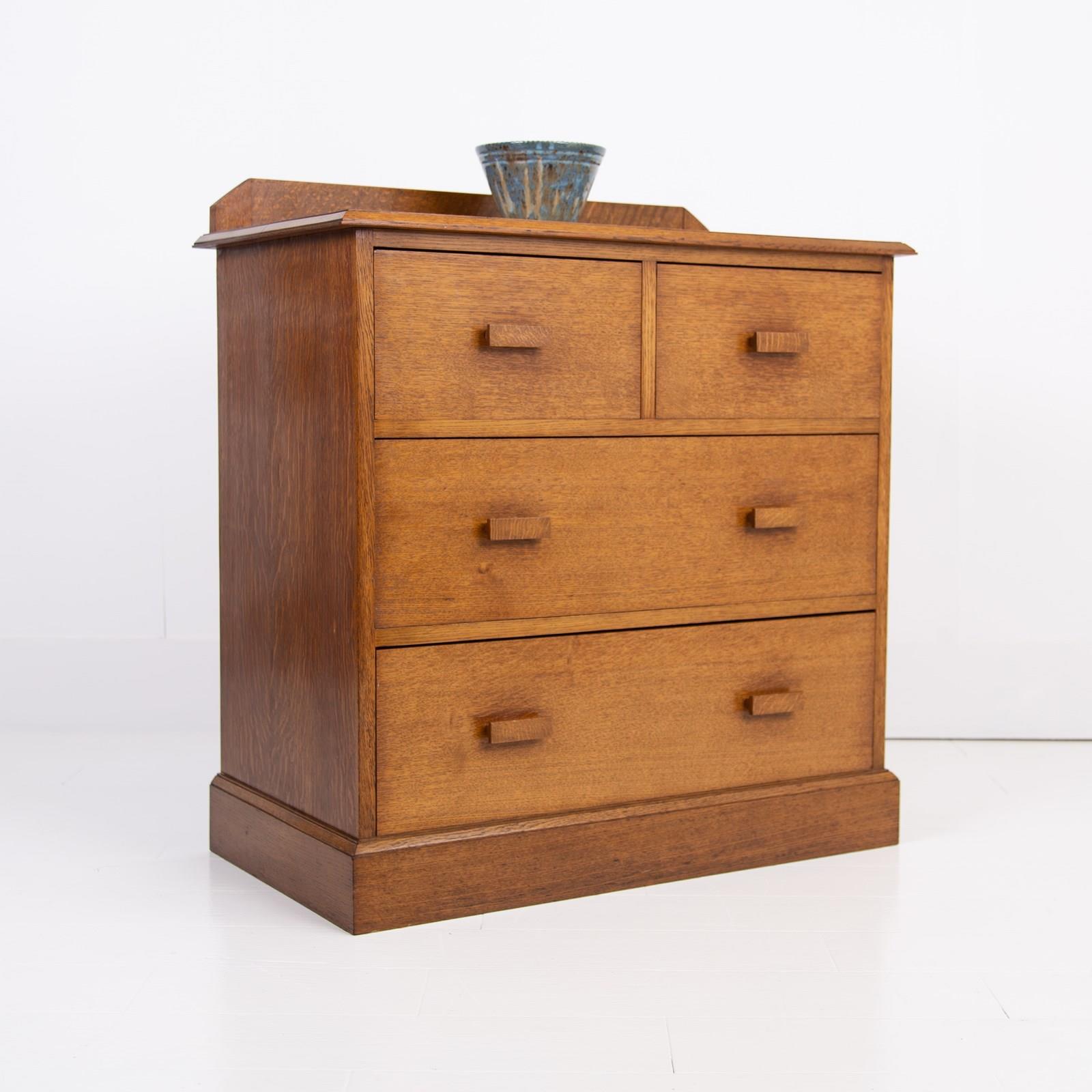 Liking this British oak Modernist chest of 4 Drawers C1930. Great use of some interesting grains, good colour and wonderfully simple and good to look at design. No maker's mark but super quality.