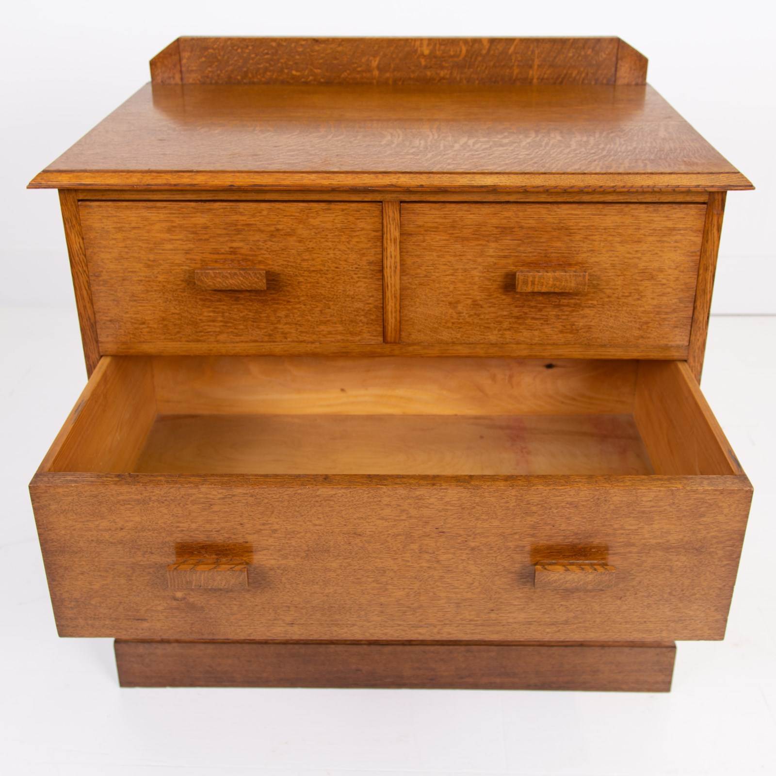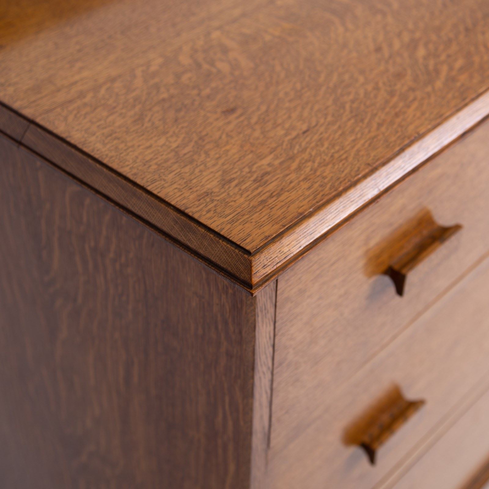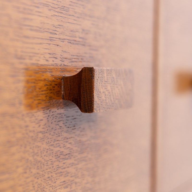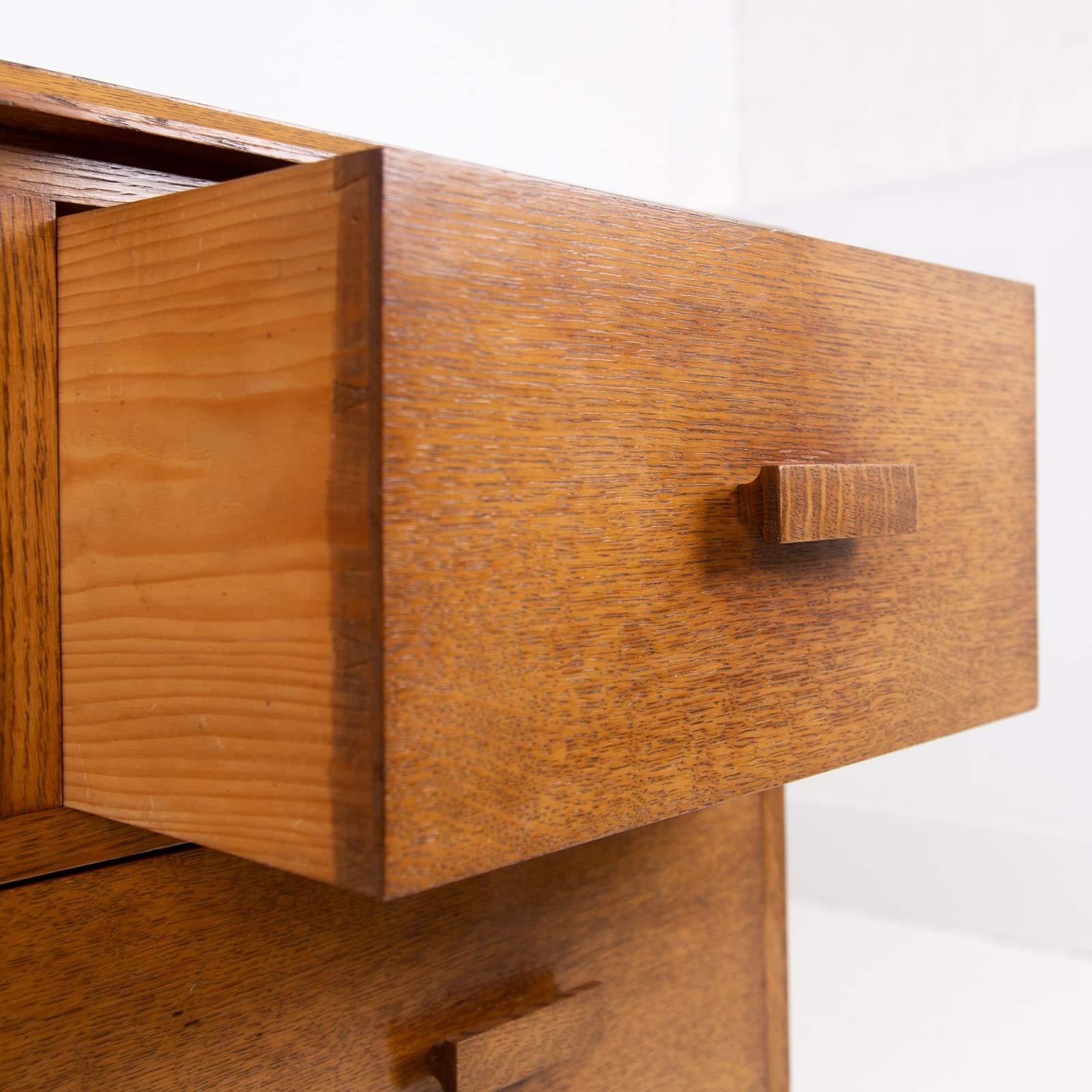 Liking this British oak Modernist chest of 4 Drawers C1930. Great use of some interesting grains, good colour and wonderfully simple and good to look at design. No maker's mark but super quality.