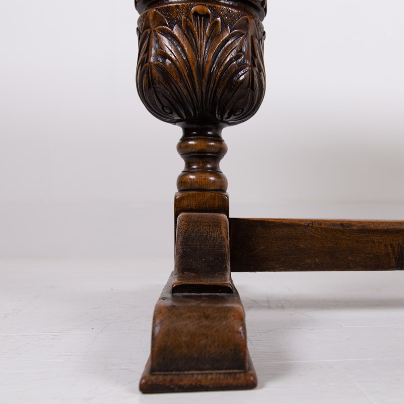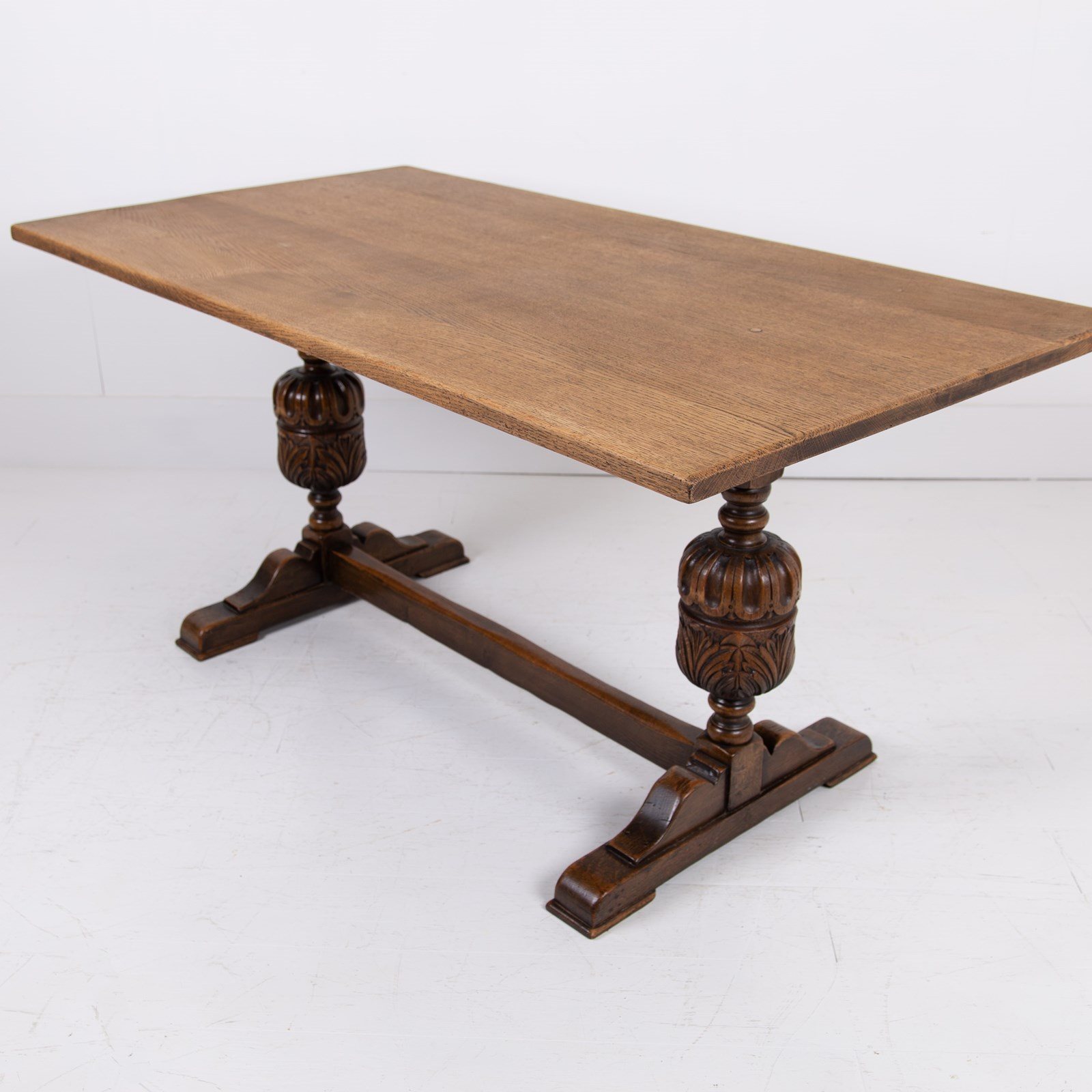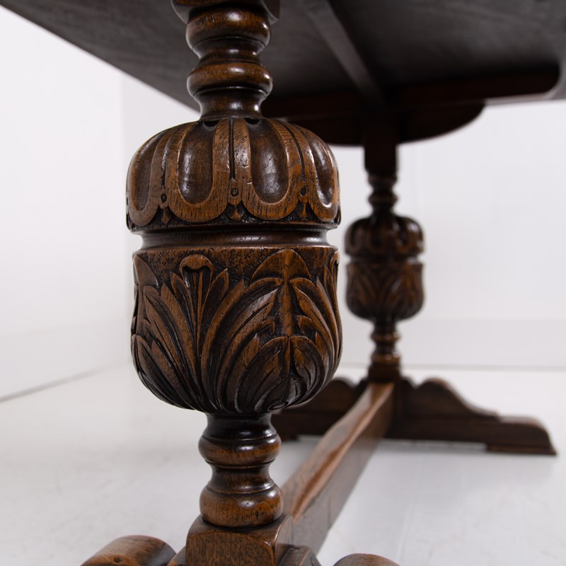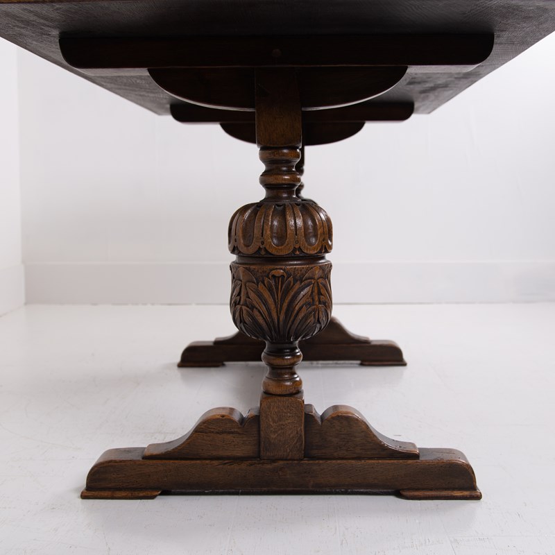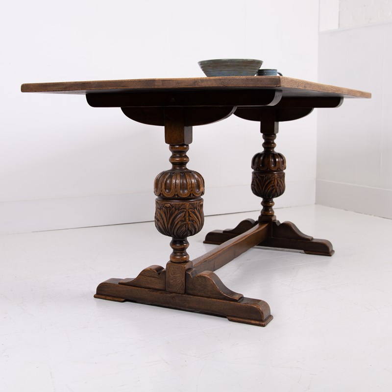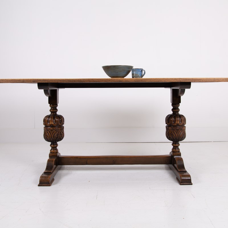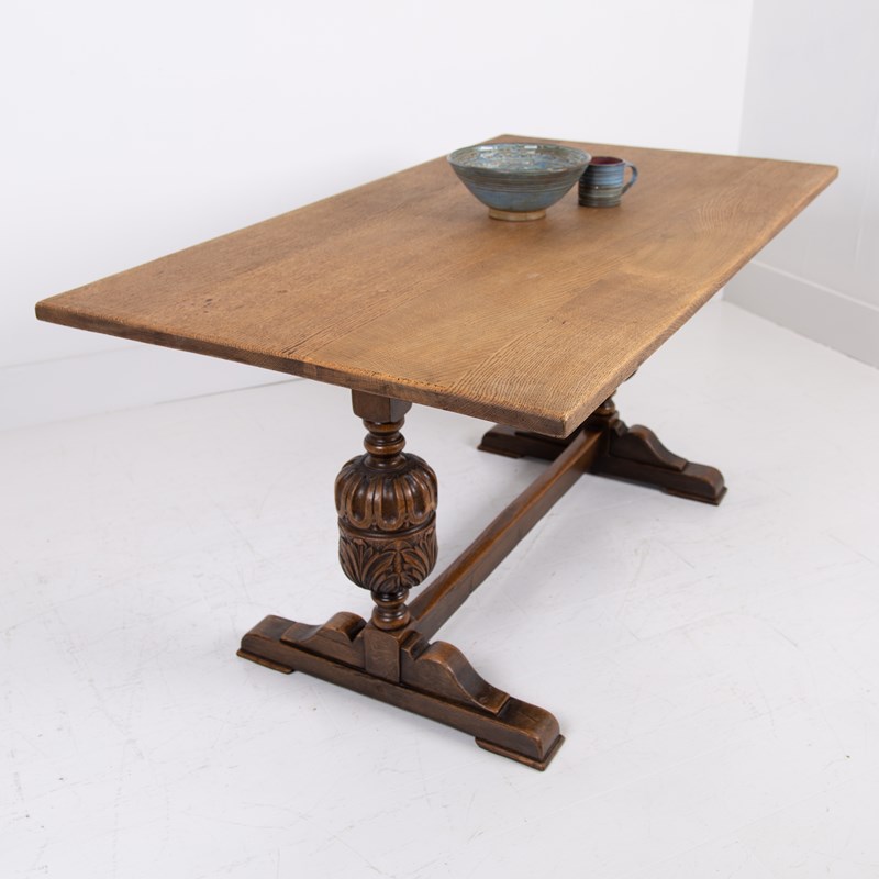 Of good proportions, design and quality is this English oak dining table or maybe a desk for some, C1930s. We have a well sized thick plank style top sitting on attractive bulbous carved supports.