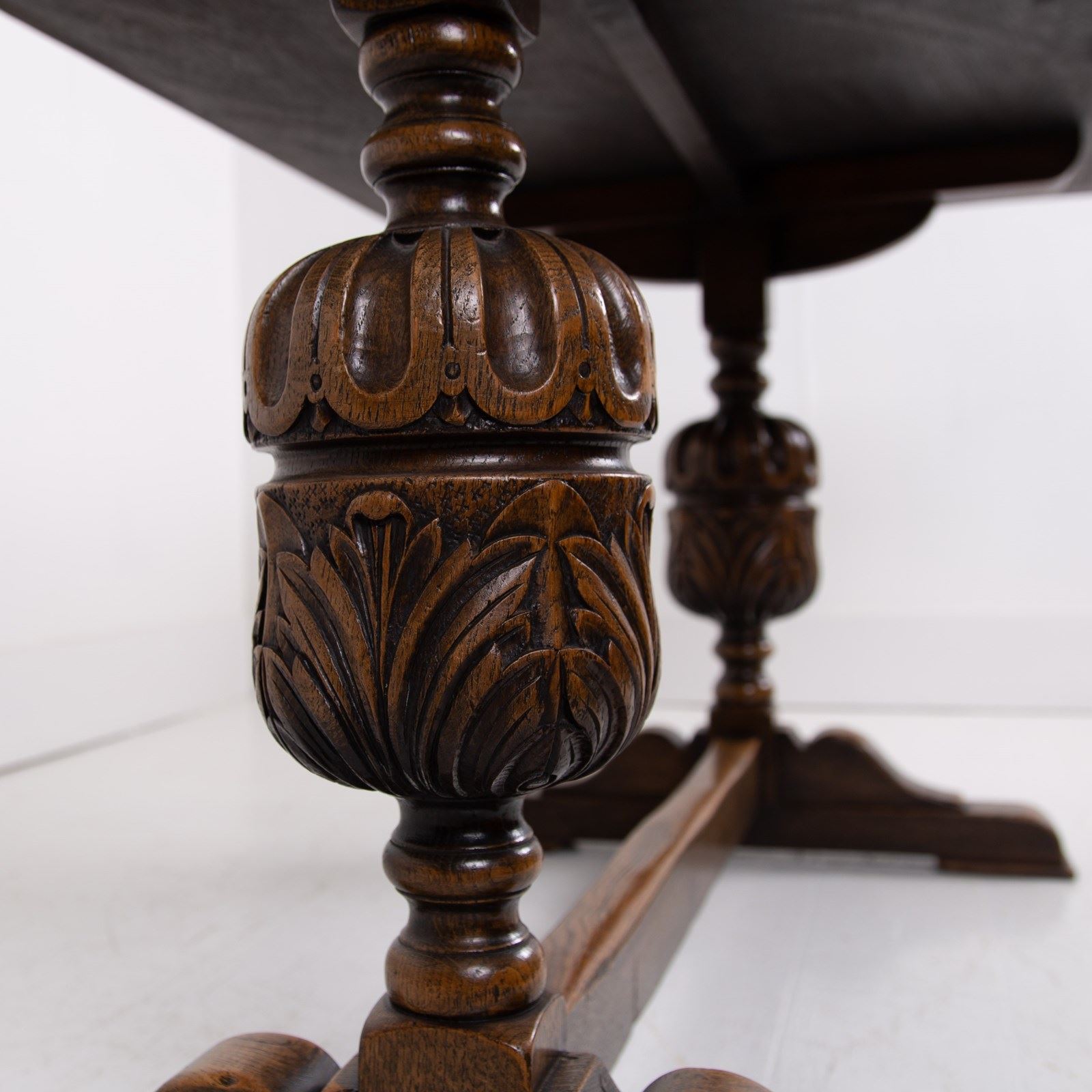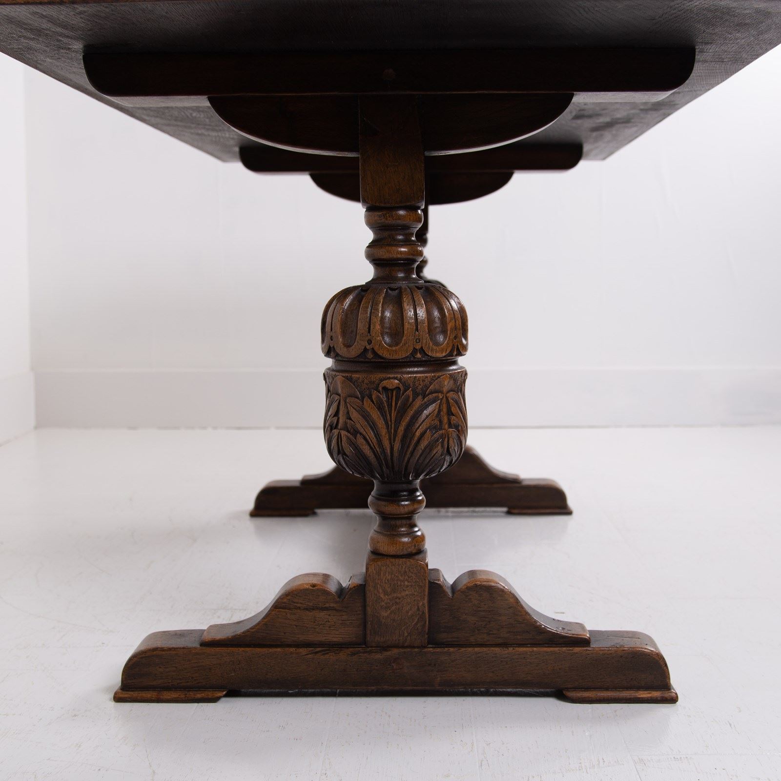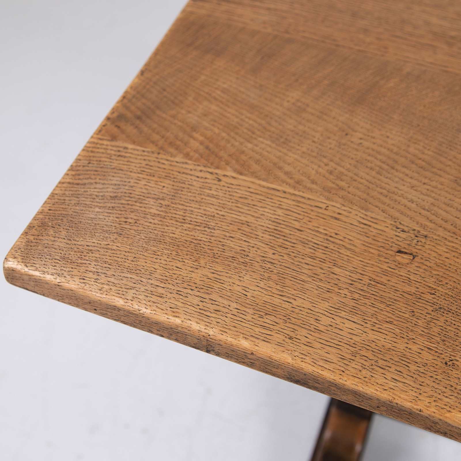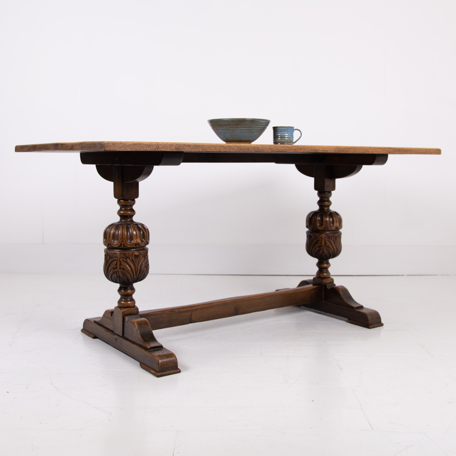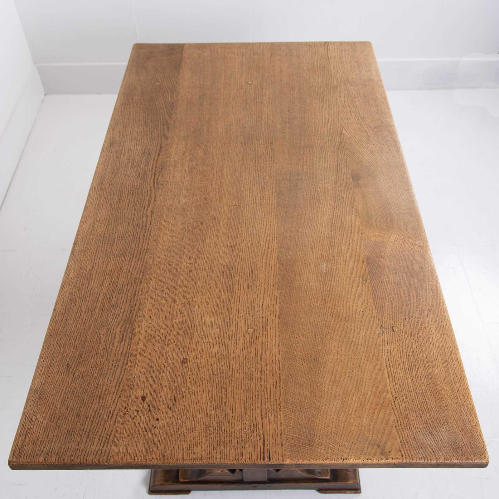 Of good proportions, design and quality is this English oak dining table or maybe a desk for some, C1930s. We have a well sized thick plank style top sitting on attractive bulbous carved supports.