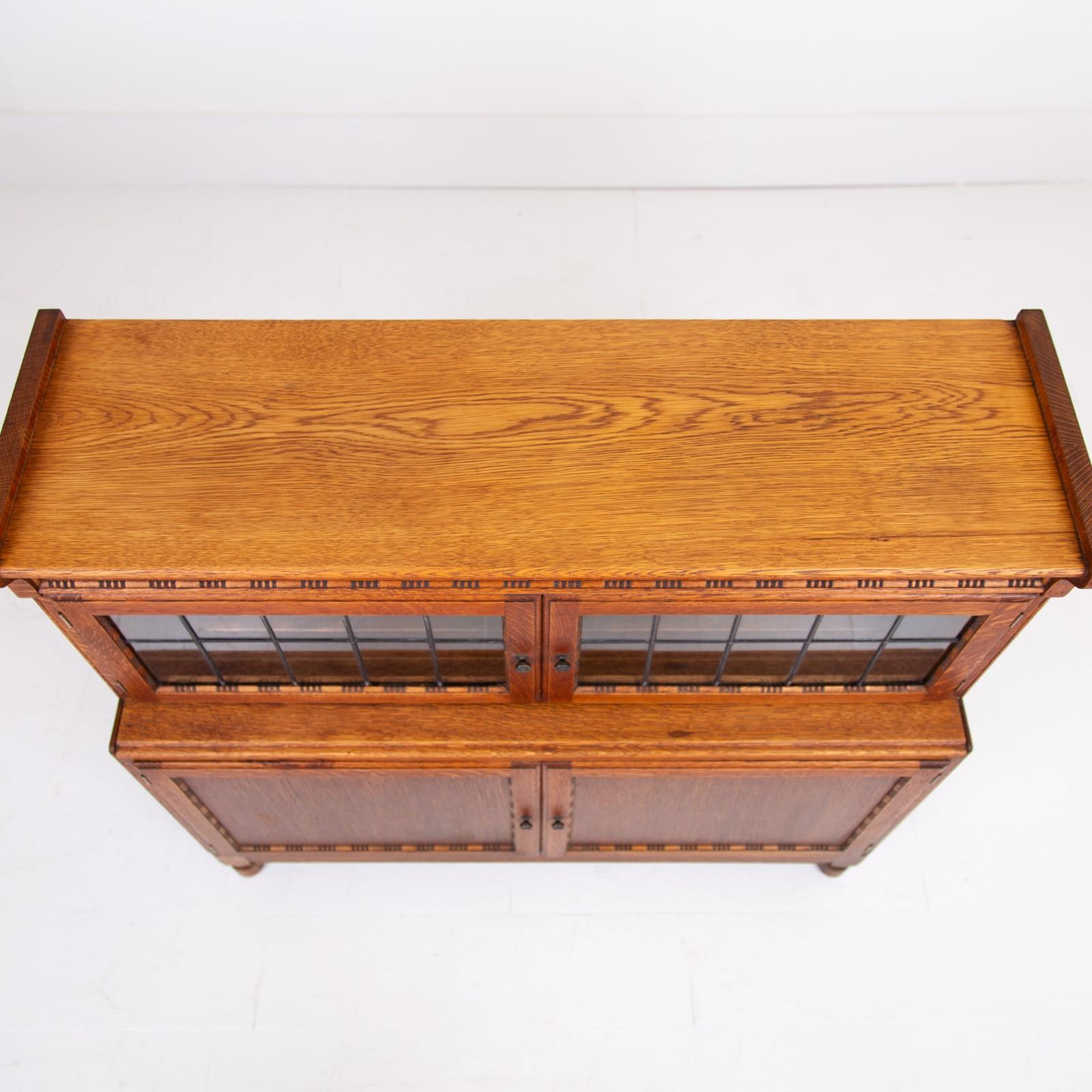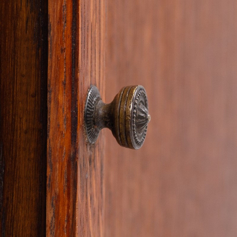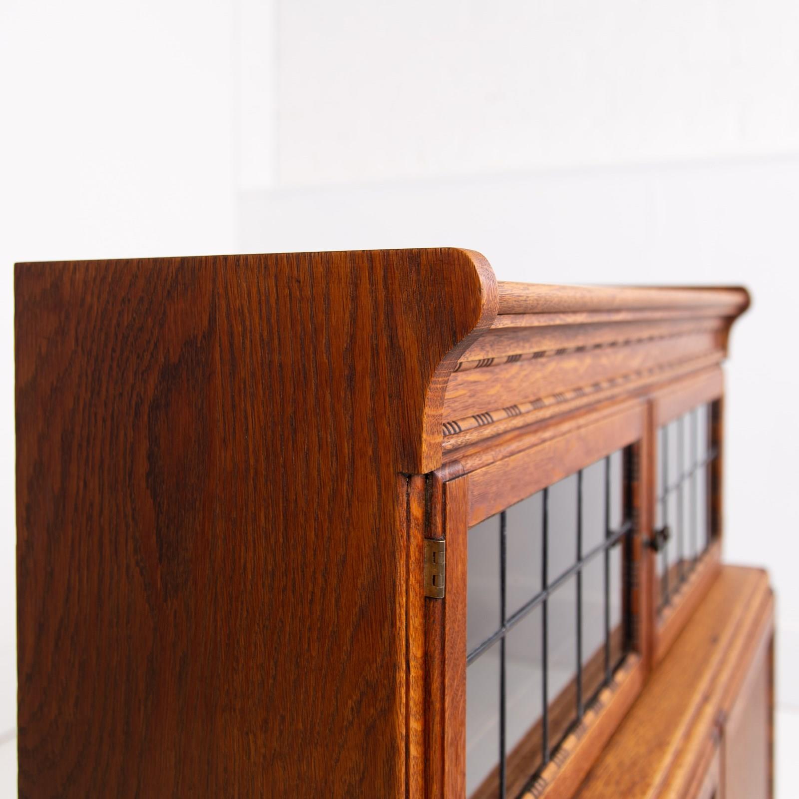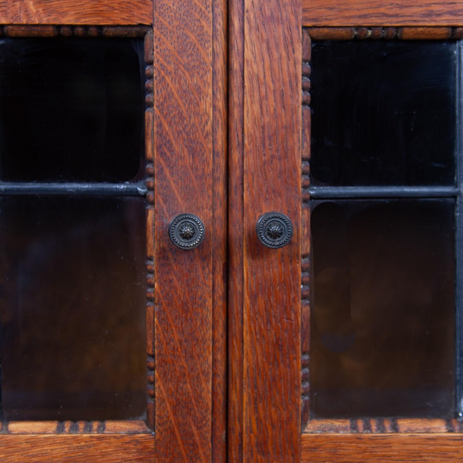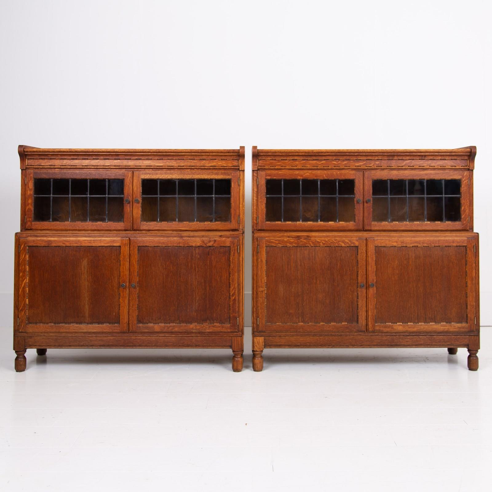 The English oak is of a pleasing tone and grain with some pleasing on the eye moulding and details on the pair. We have a maker's label to both bookcases to the inside of the top door and the bookcases sit well.