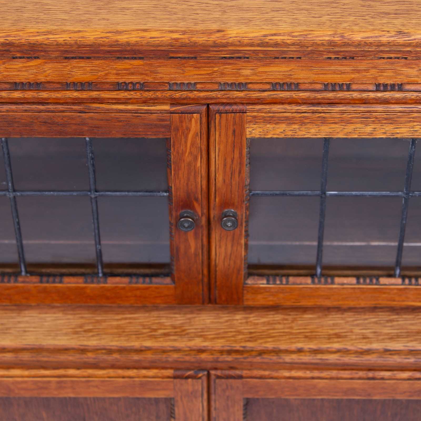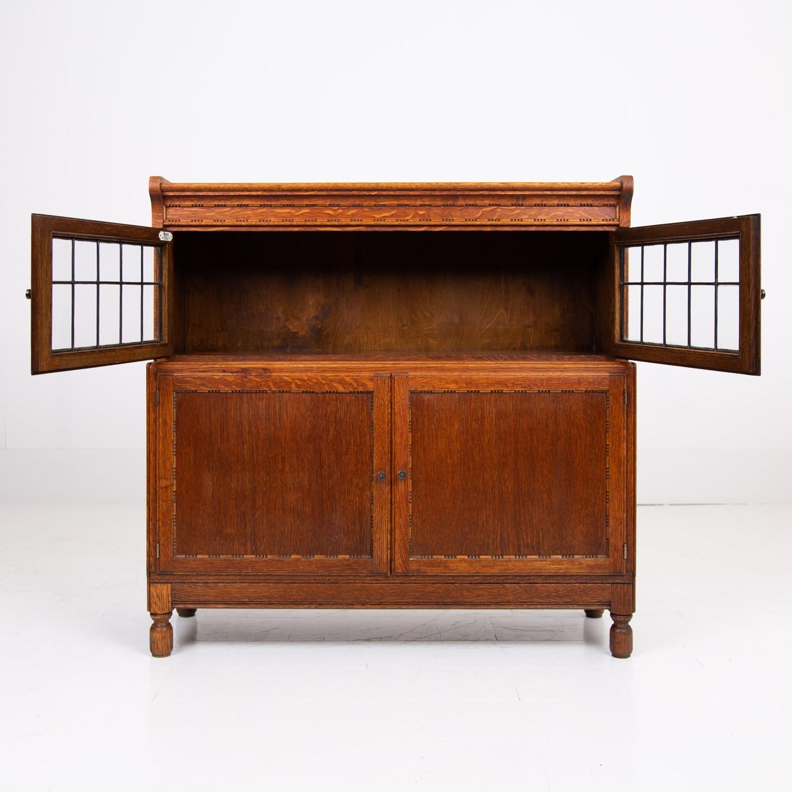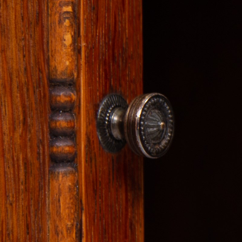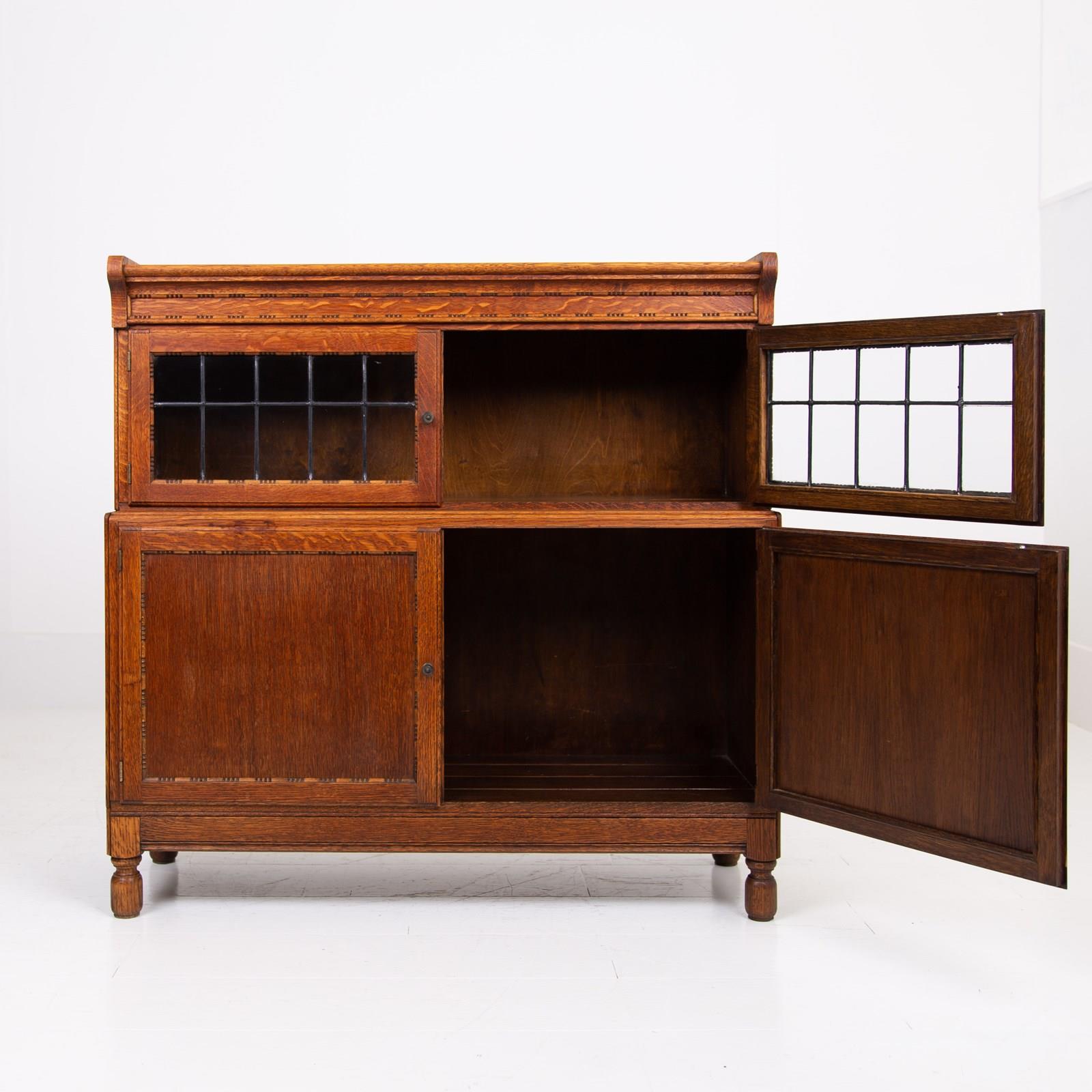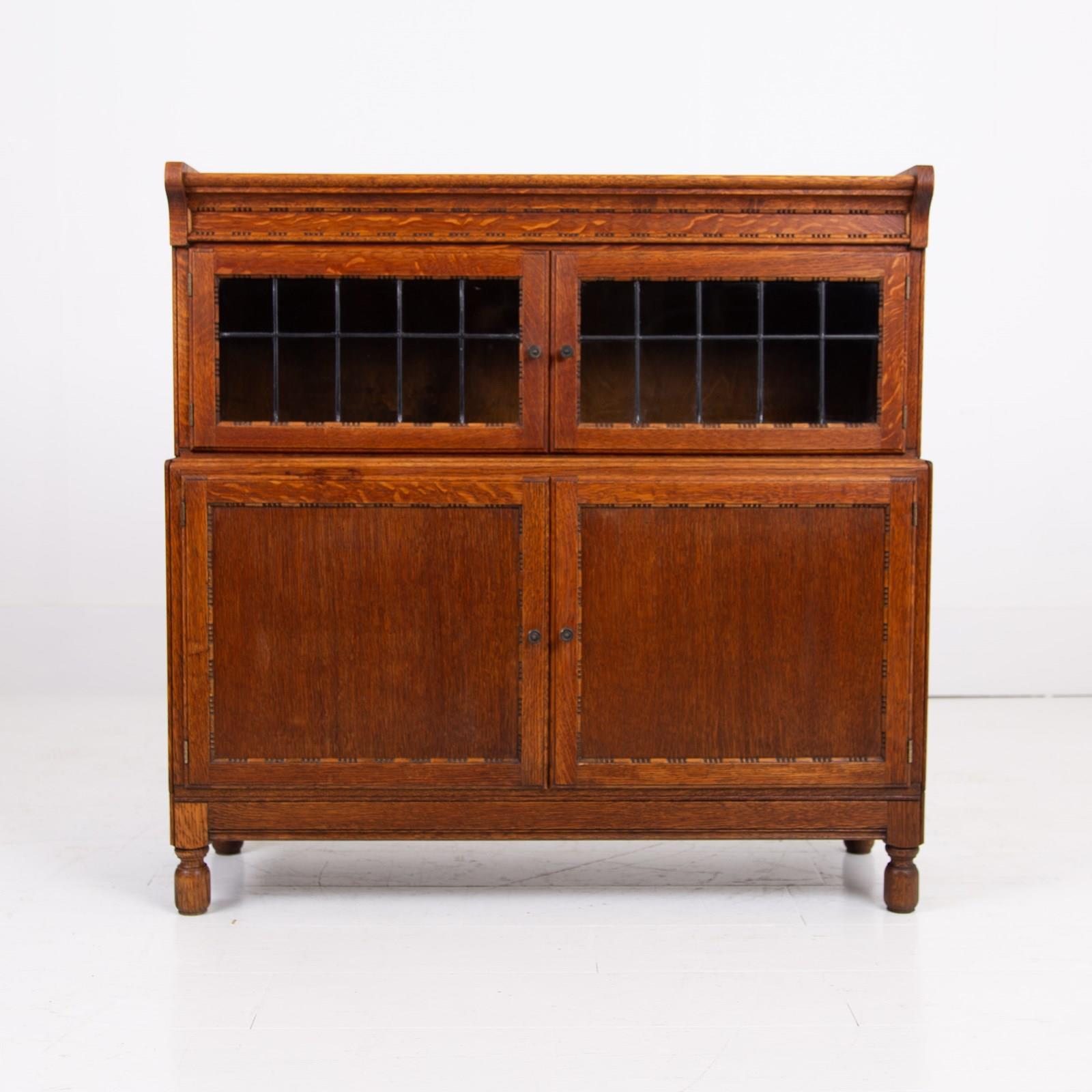 The English oak is of a pleasing tone and grain with some pleasing on the eye moulding and details on the pair. We have a maker's label to both bookcases to the inside of the top door and the bookcases sit well.