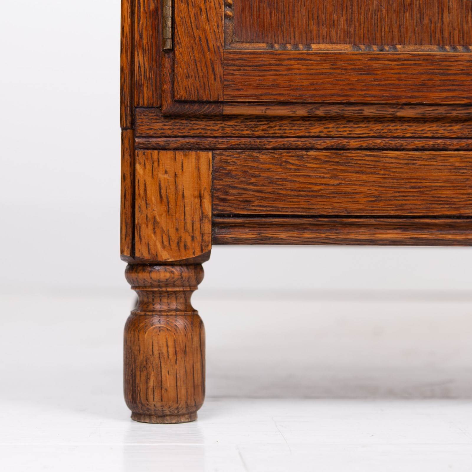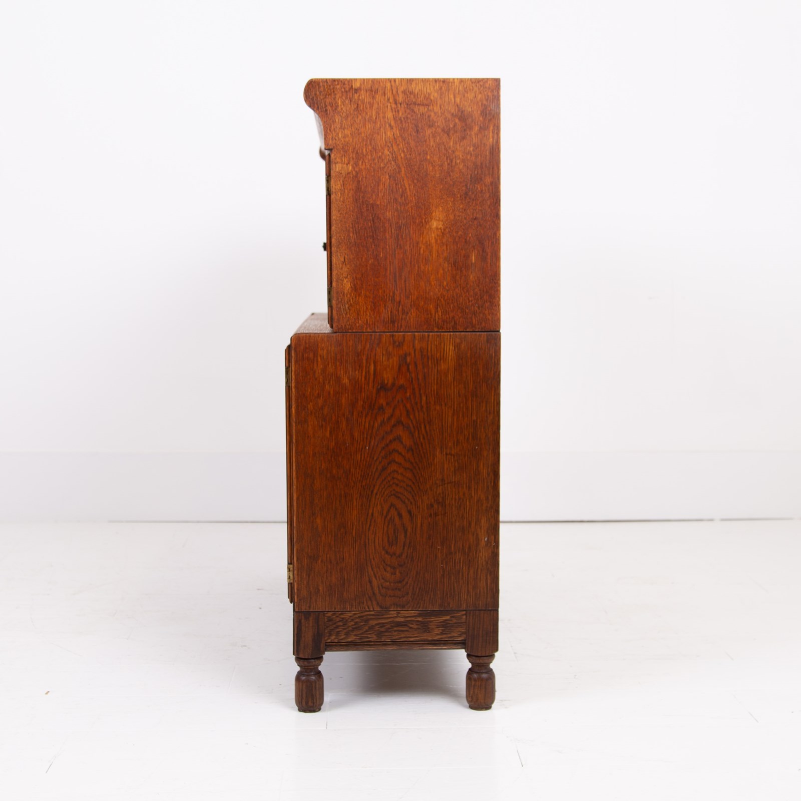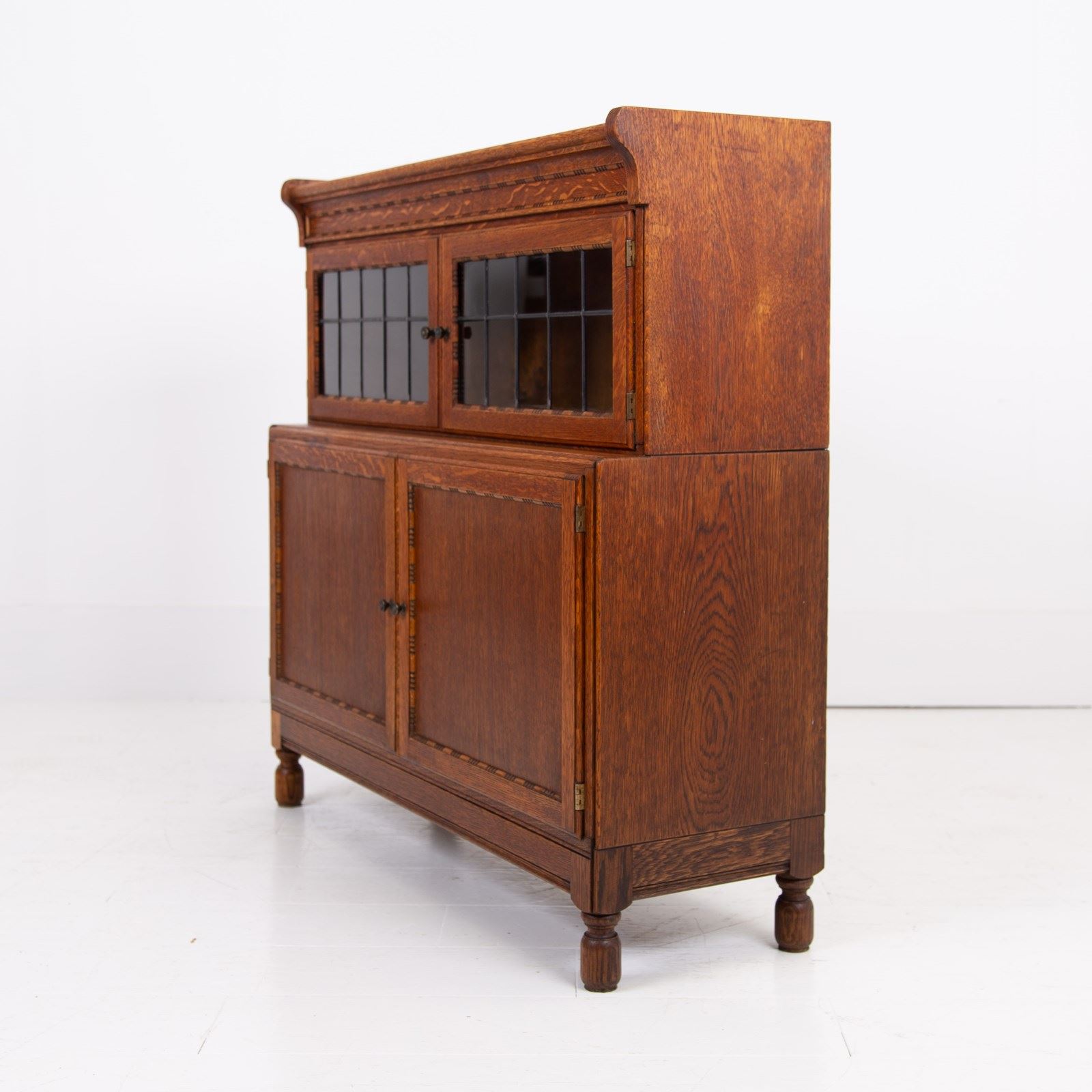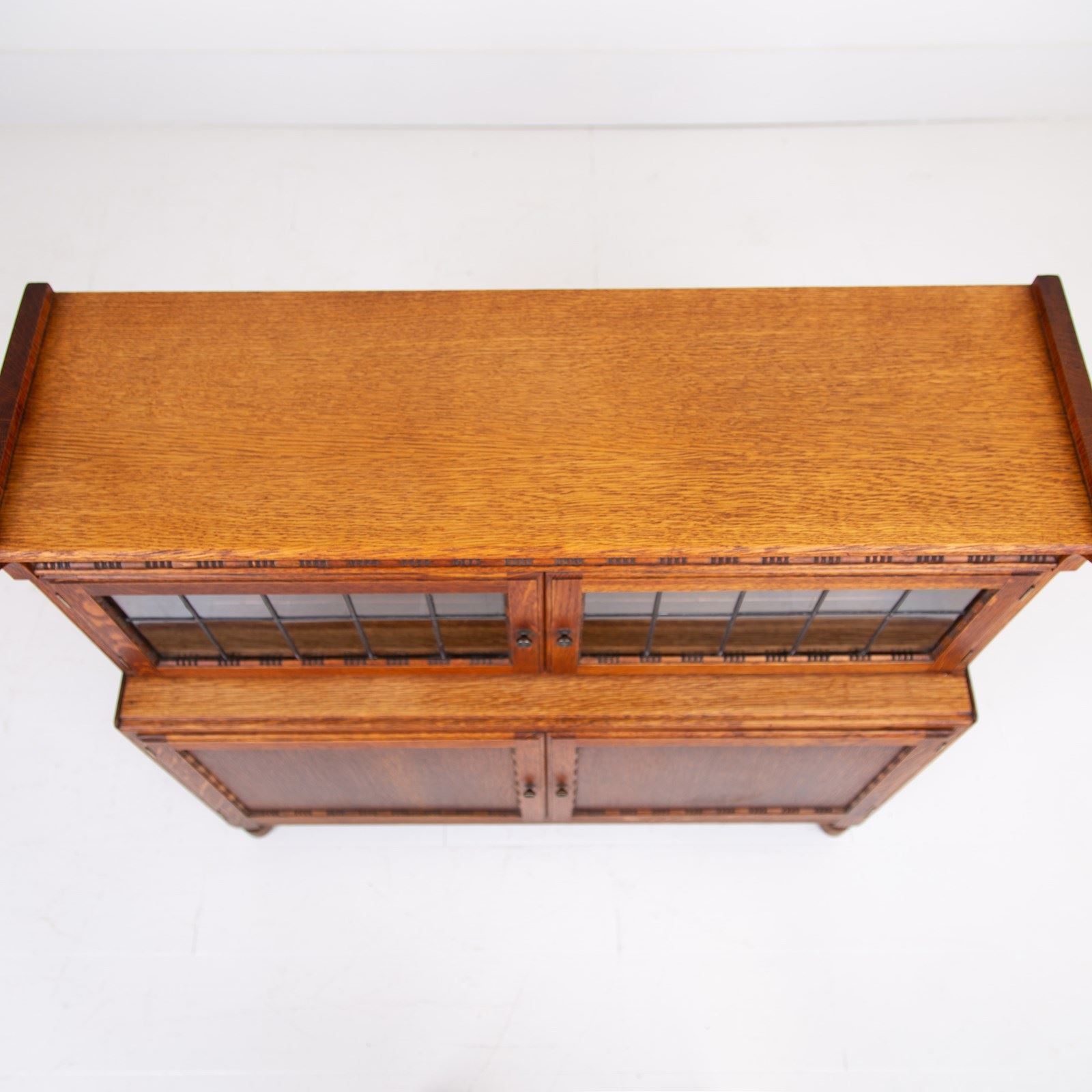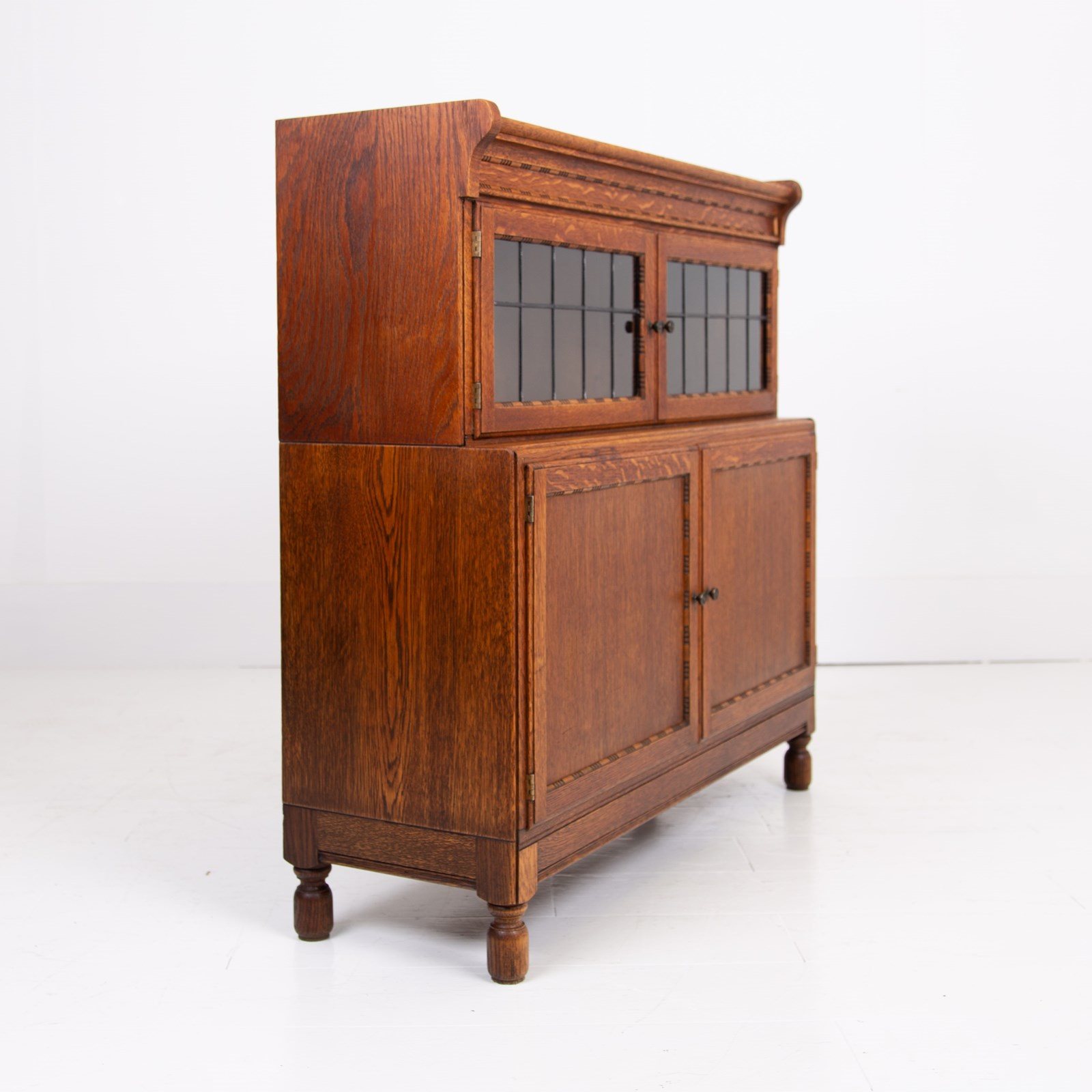The English oak is of a pleasing tone and grain with some pleasing on the eye moulding and details on the pair. We have a maker's label to both bookcases to the inside of the top door and the bookcases sit well.
