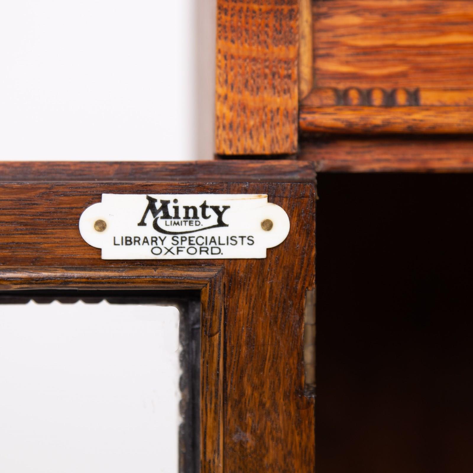 A rather handsome pair of English oak glazed library bookcases by Minty of Oxford C1920. From a large period property in the Home Counties, these are of lovely design and quality with the panelled lower section sitting on well turned legs and with the leaded glass oak framed top section both opening by way of a pair of doors both with original little brass knobs.