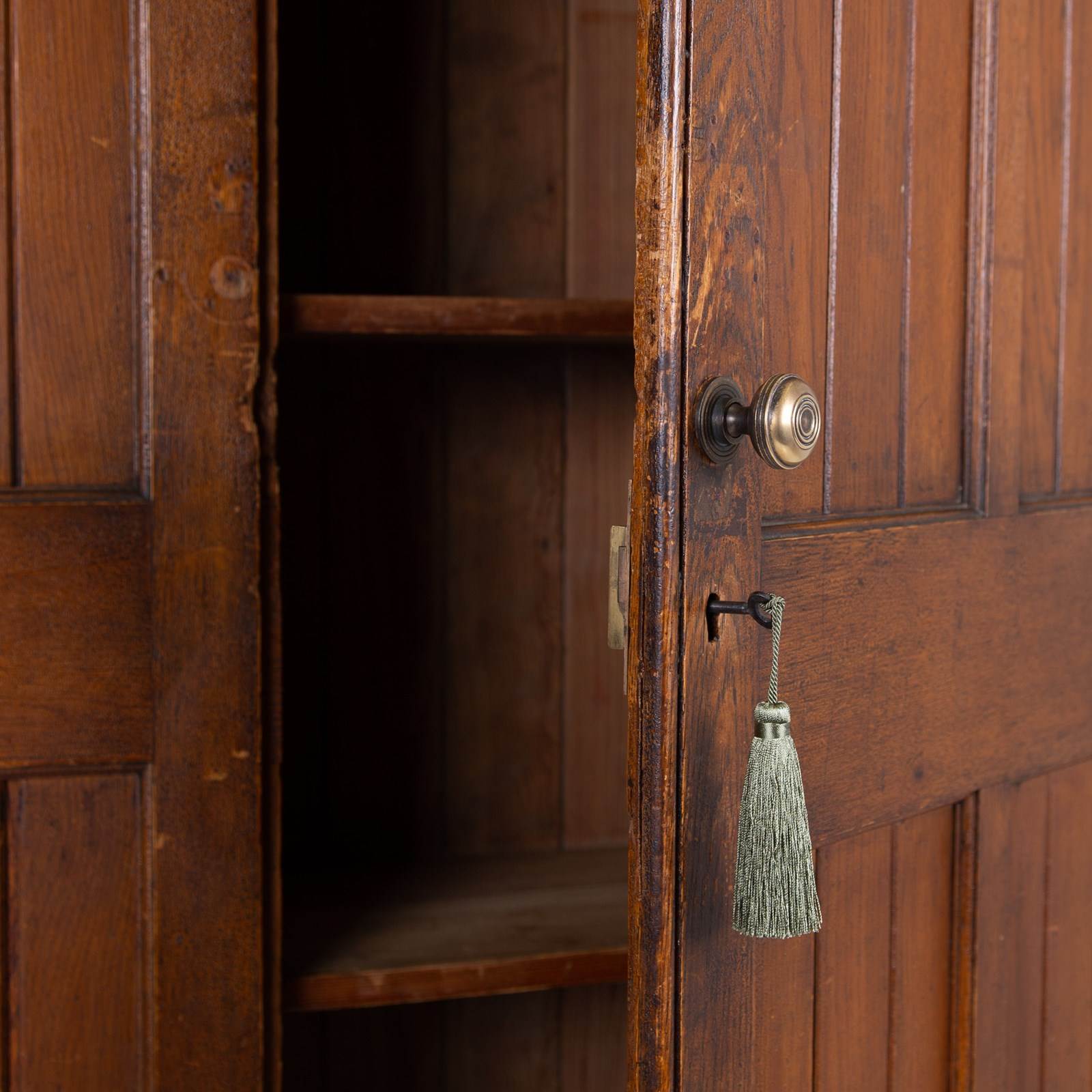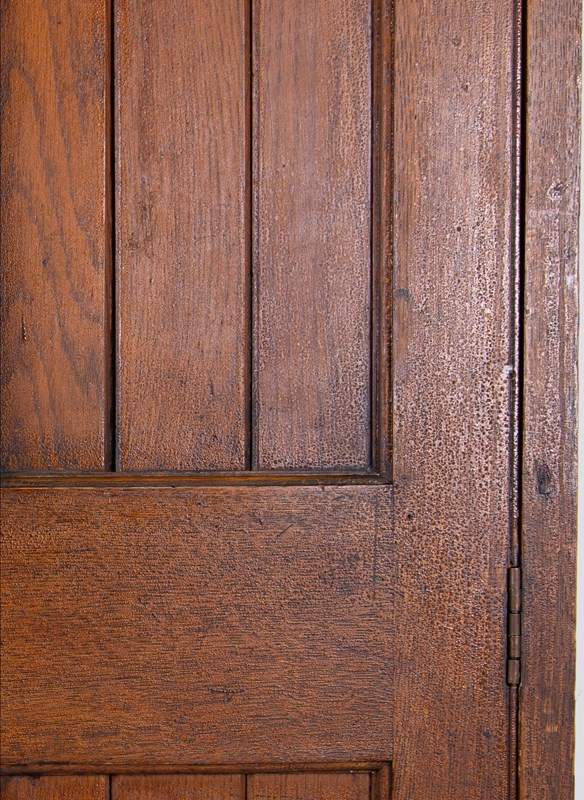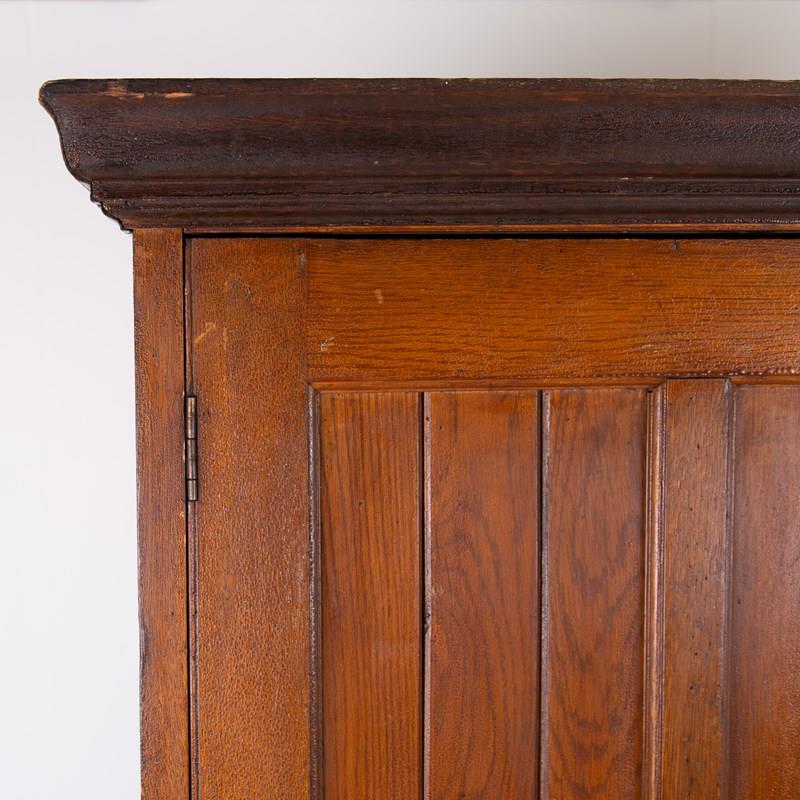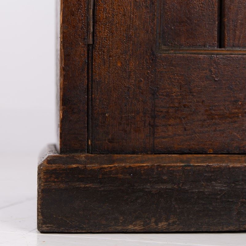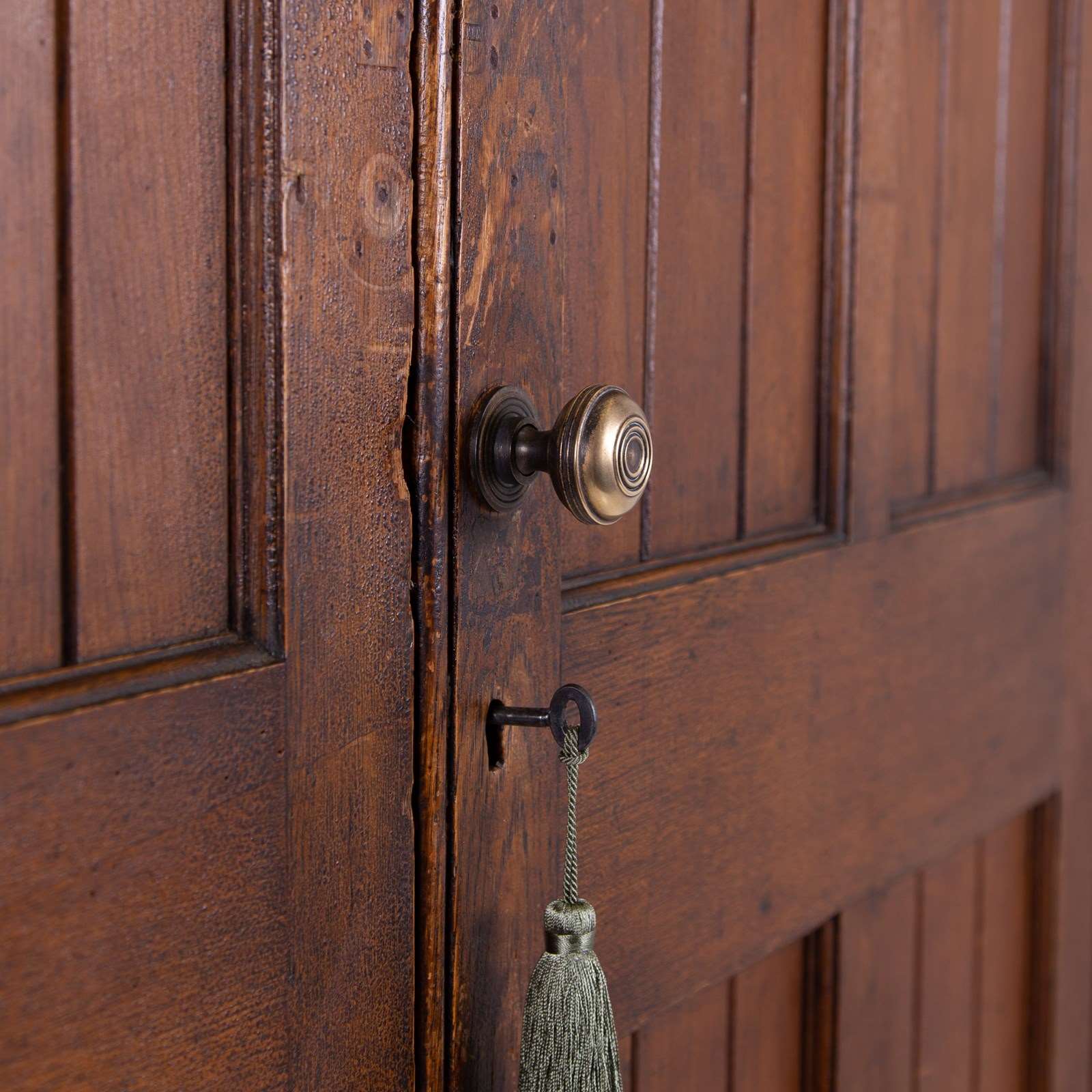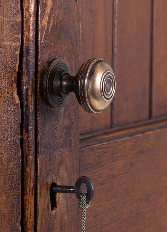 The piece sits well and as mentioned with age wear. Being oak it is reassuringly heavy with its attractive panelled doors, heavy brass knob and working lock and key. Inside we have original deep thick pine shelves which are fixed. This one benefits from sitting in a relatively warm place so it's dry and ready to place after a careful light clean in our workshop.