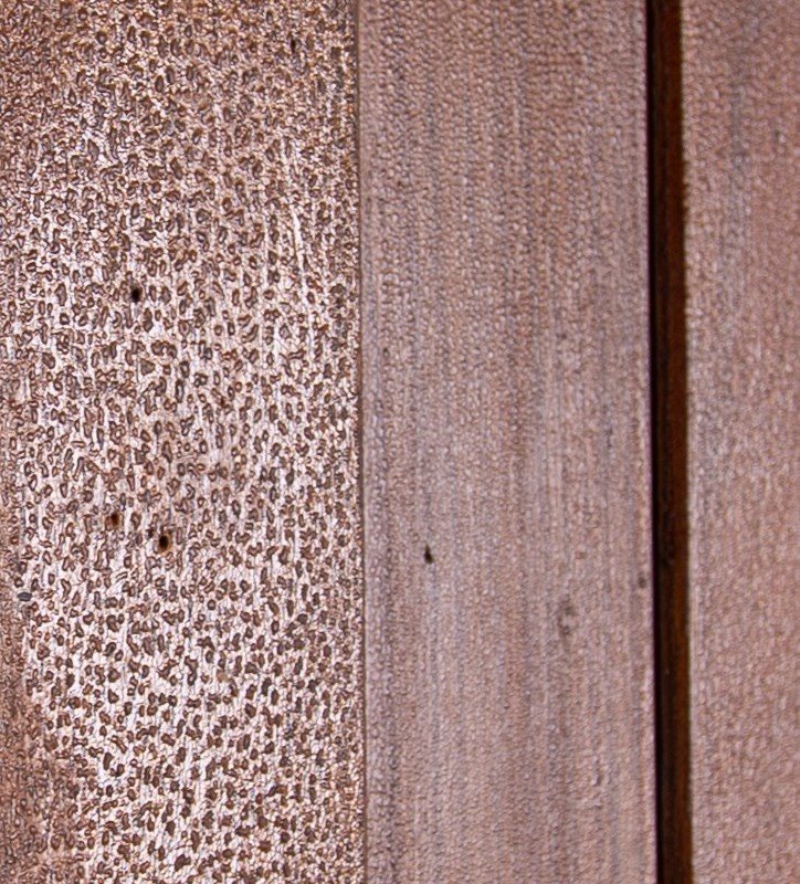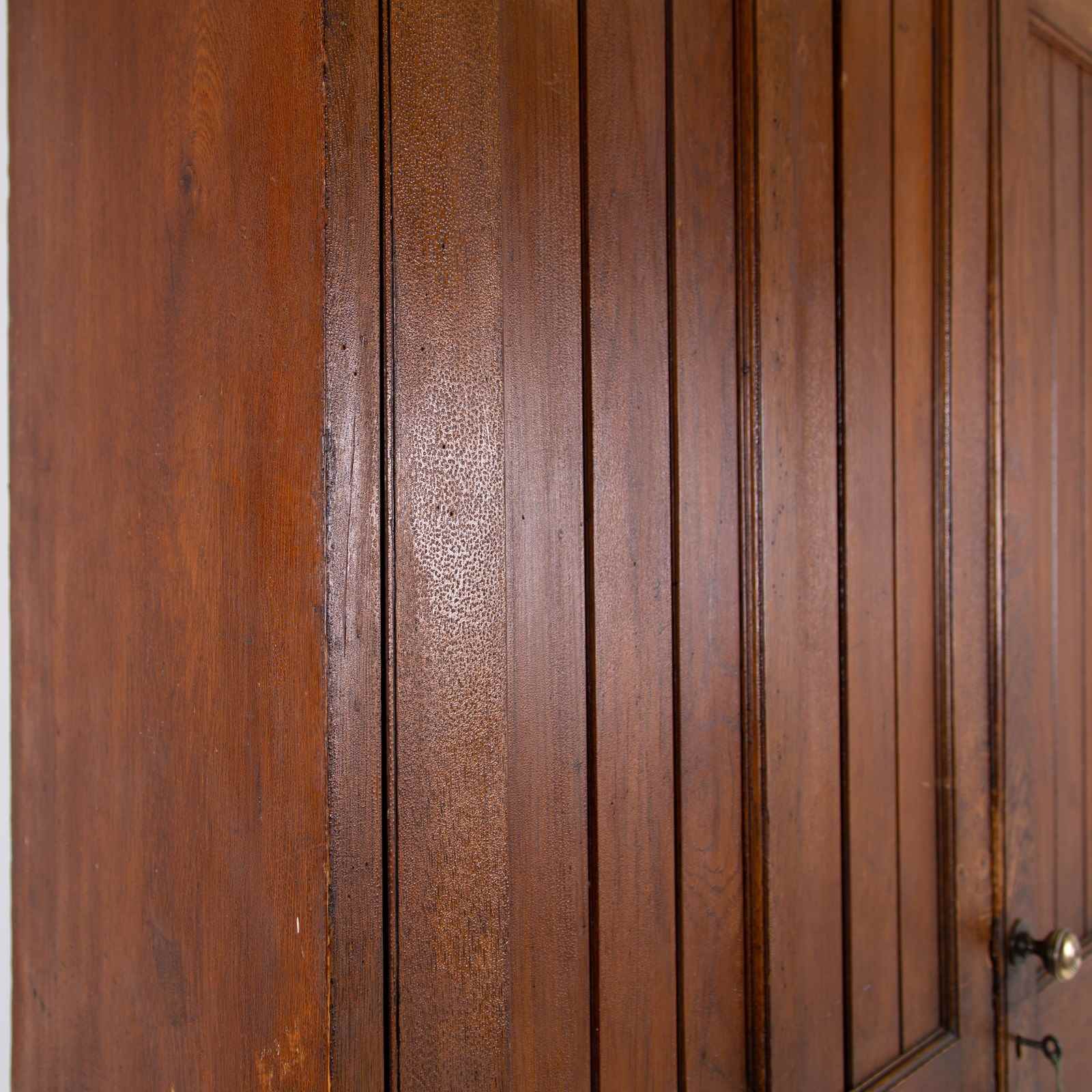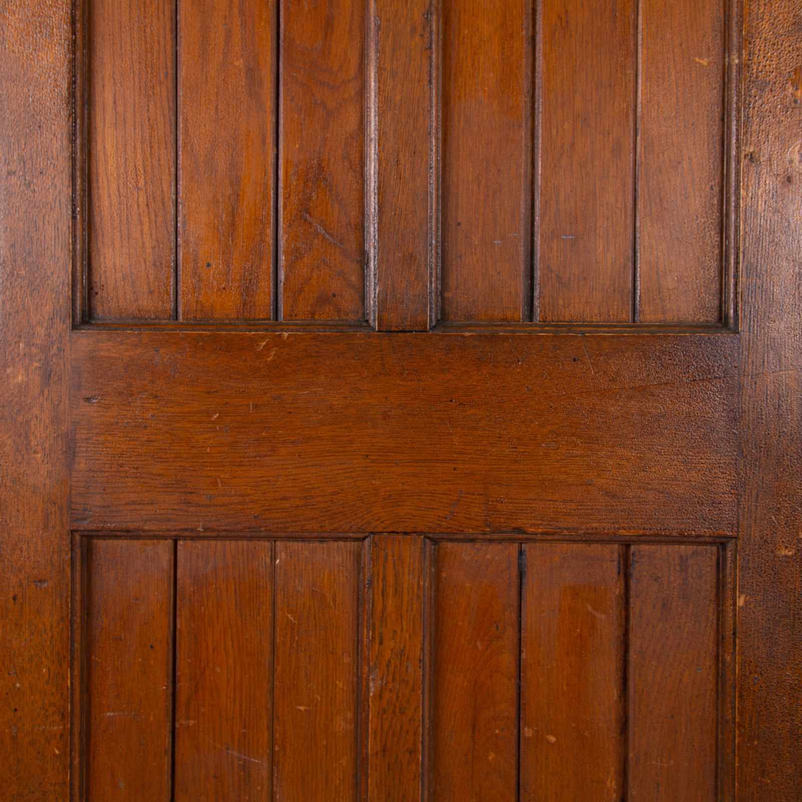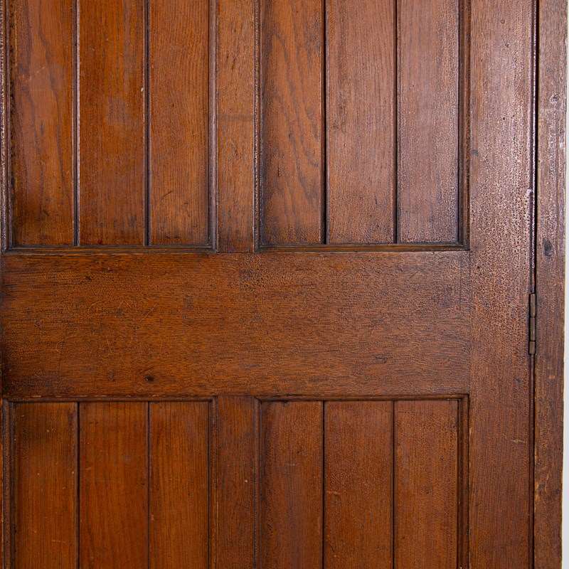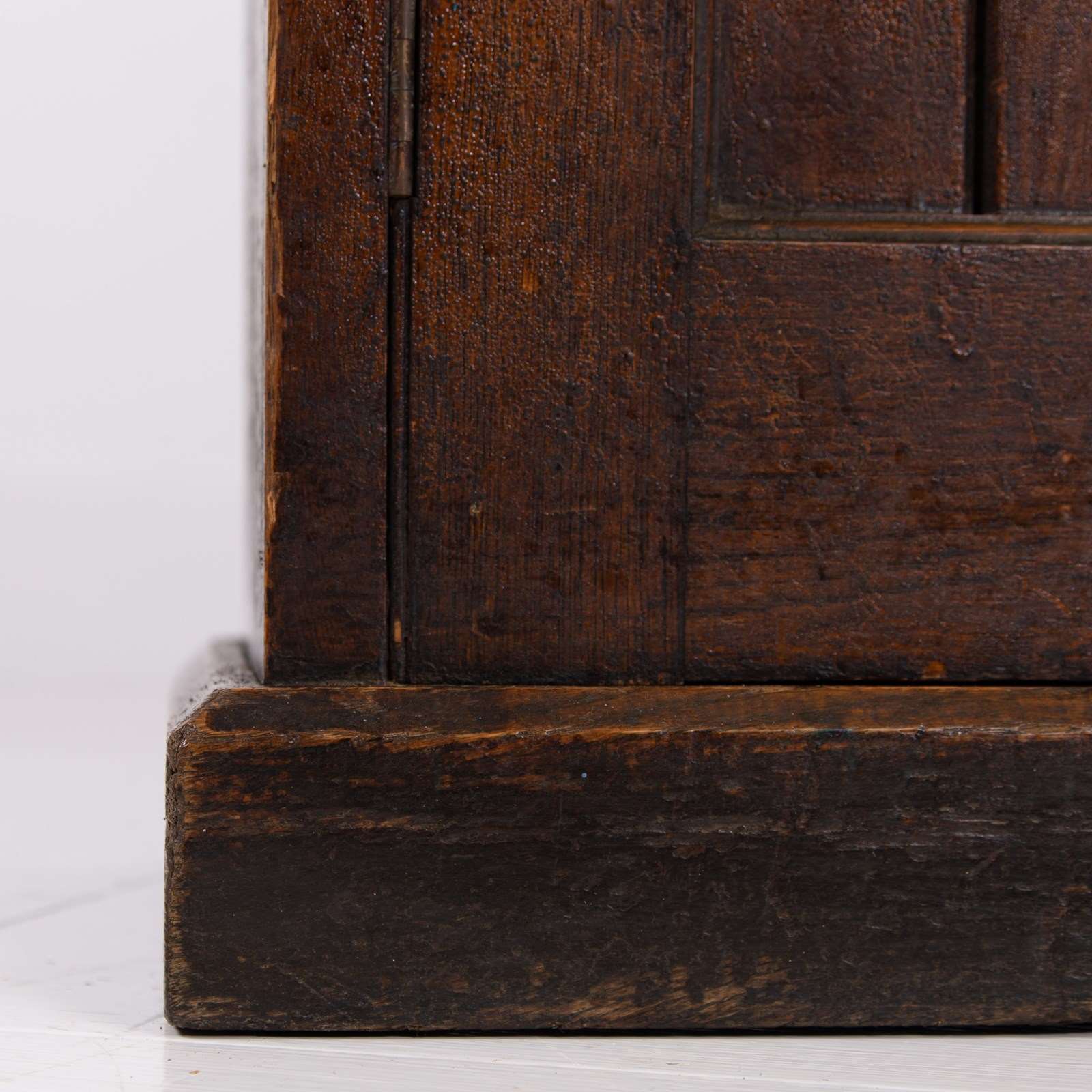 The piece sits well and as mentioned with age wear. Being oak it is reassuringly heavy with its attractive panelled doors, heavy brass knob and working lock and key. Inside we have original deep thick pine shelves which are fixed. This one benefits from sitting in a relatively warm place so it's dry and ready to place after a careful light clean in our workshop.