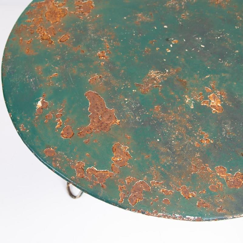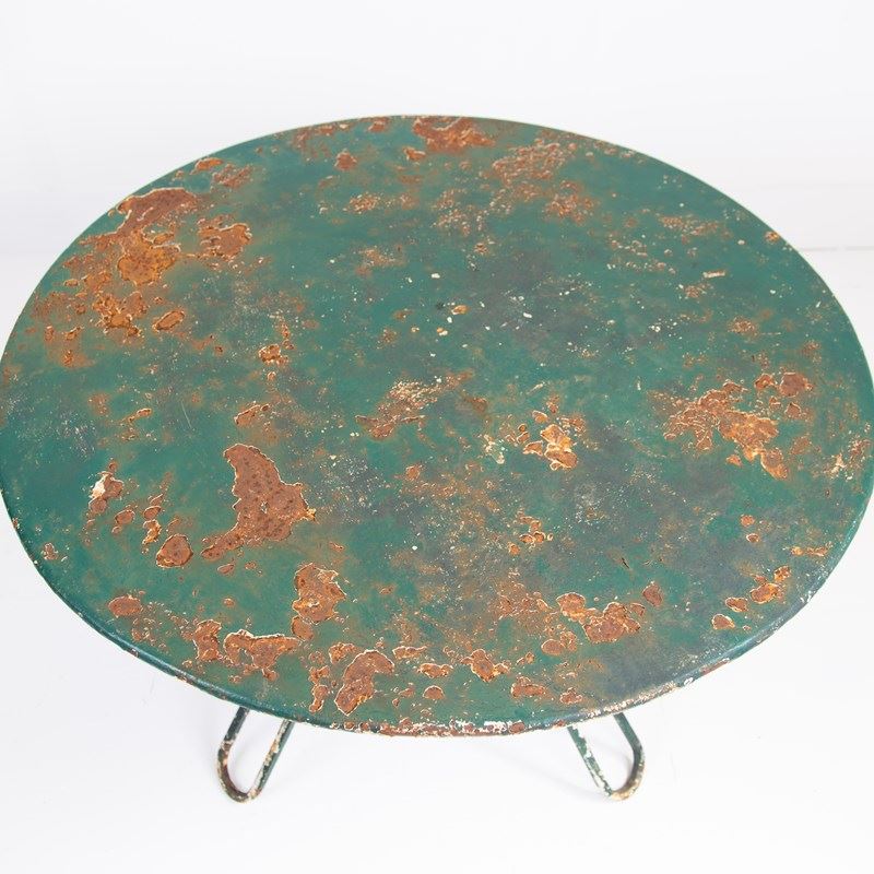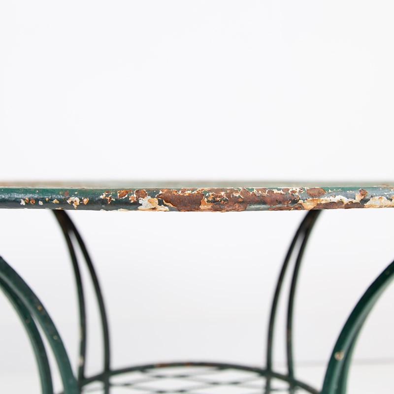 We have a super designed and pleasingly aged French patio garden table sitting in green paint with wear to all areas, but perfectly usable and very attractive to the eye.