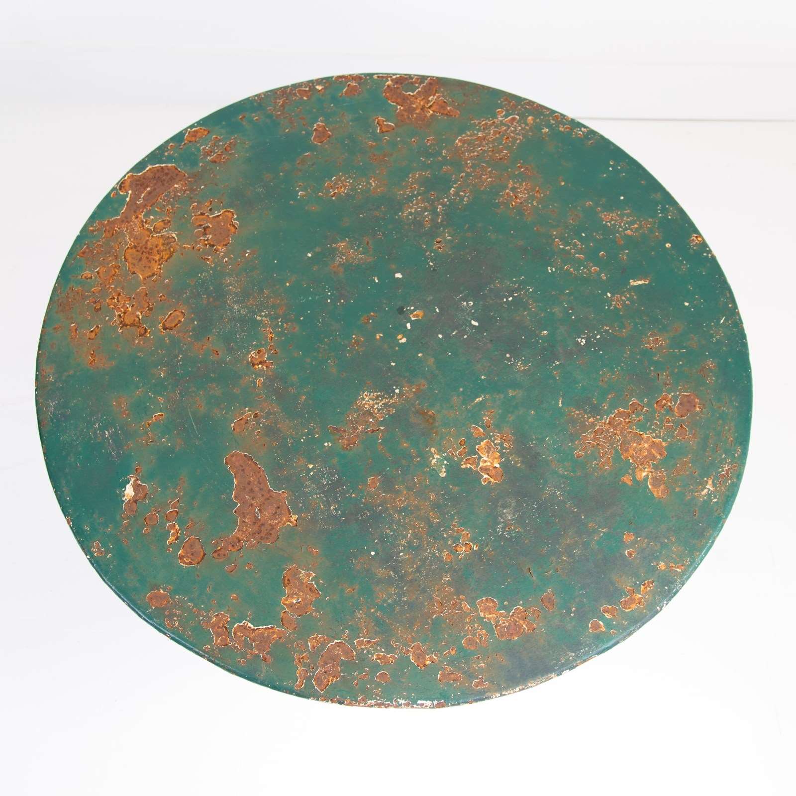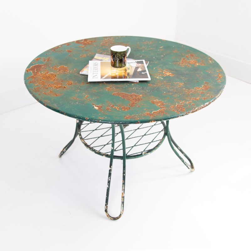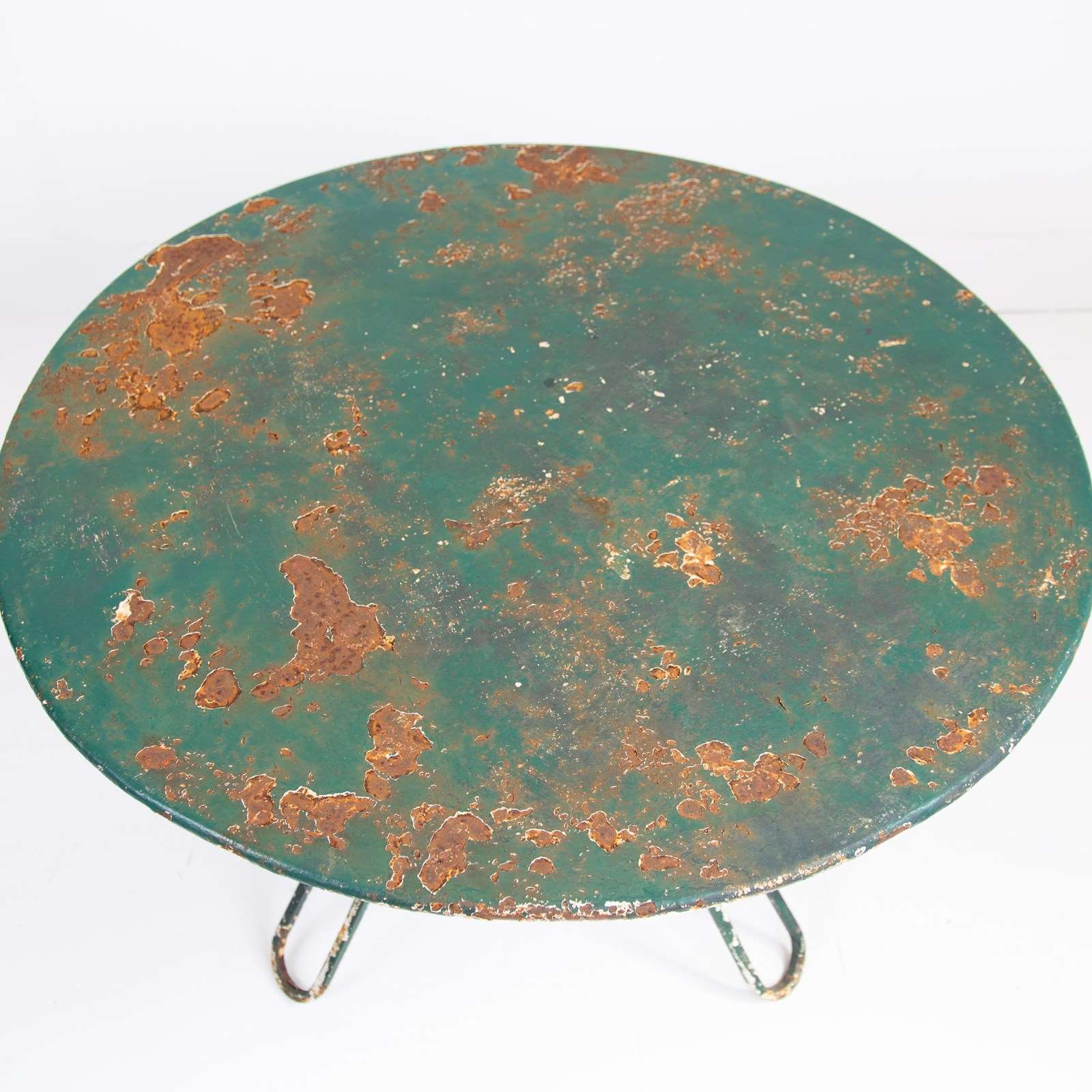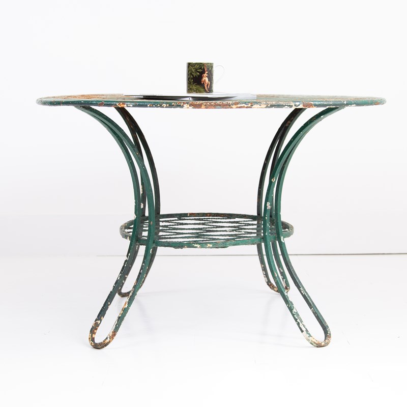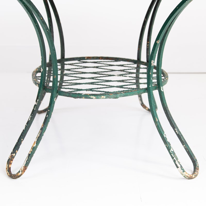 We have a fabulous set of curved iron legs, a lattice pattern undershelf and a large round top. The table is well aged with green and white paint and iron on display. The top is particularly attractive and as mentioned perfectly fine to use.