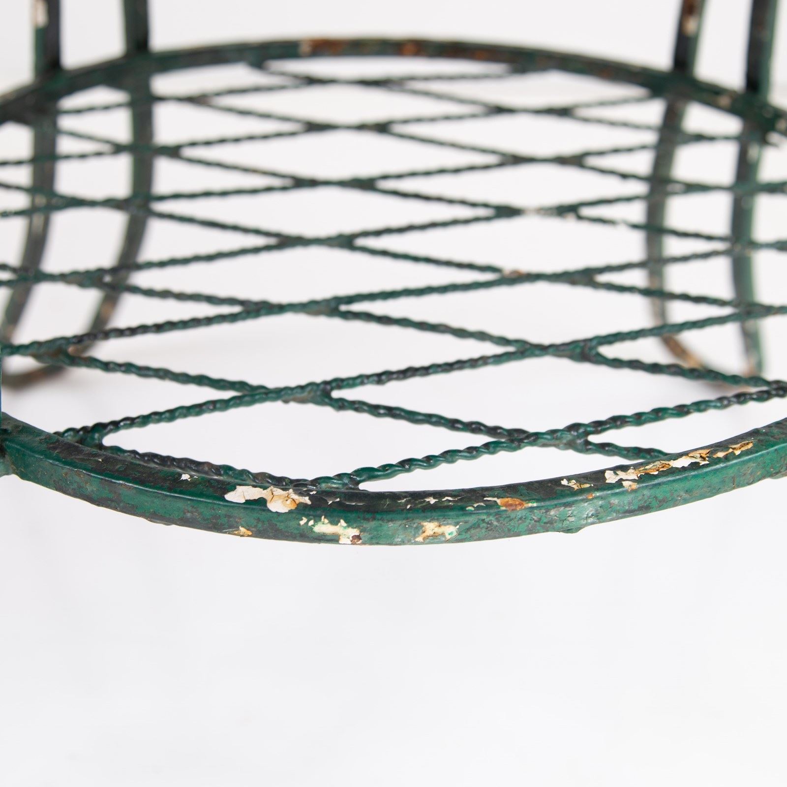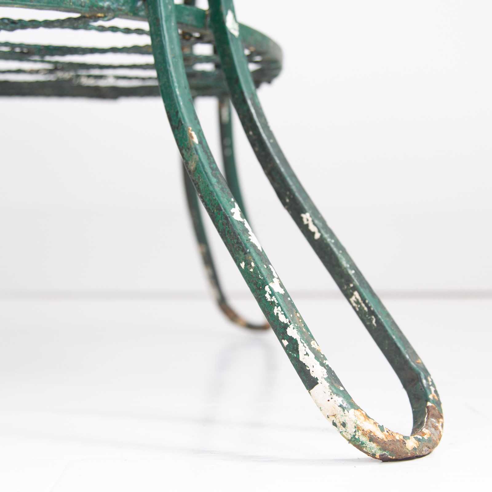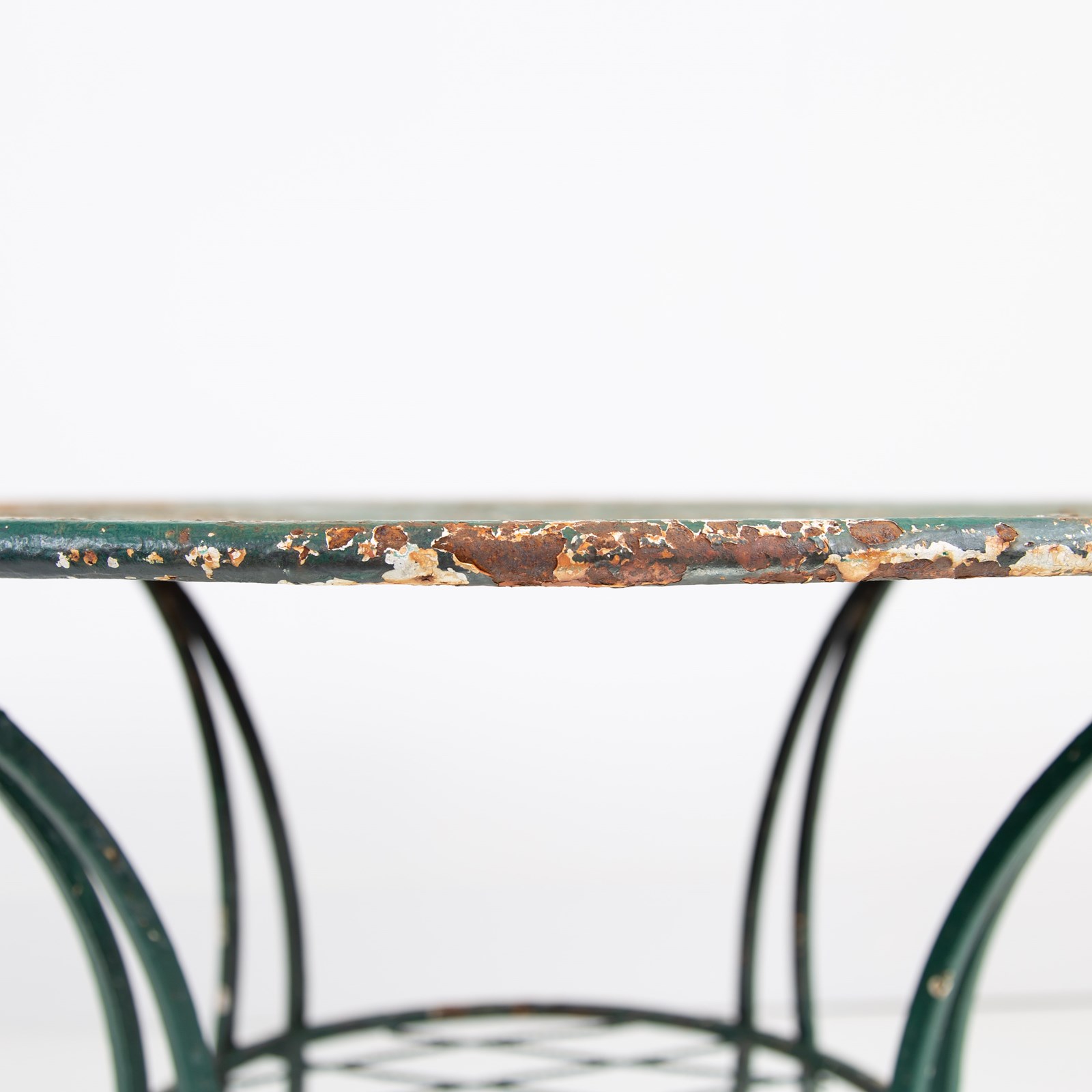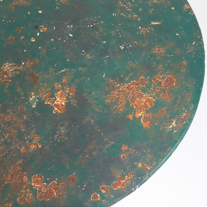 We have a fabulous set of curved iron legs, a lattice pattern undershelf and a large round top. The table is well aged with green and white paint and iron on display. The top is particularly attractive and as mentioned perfectly fine to use.