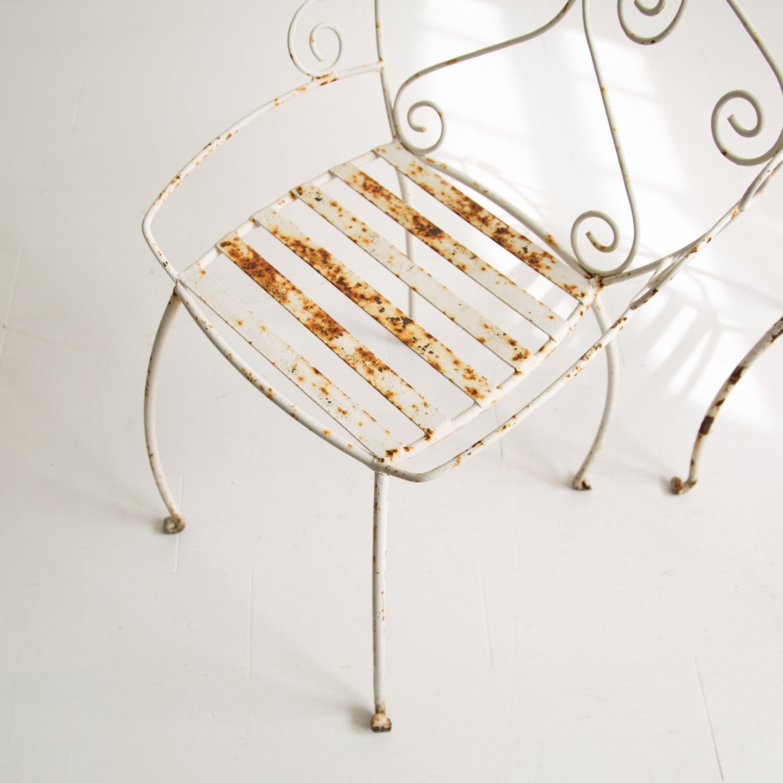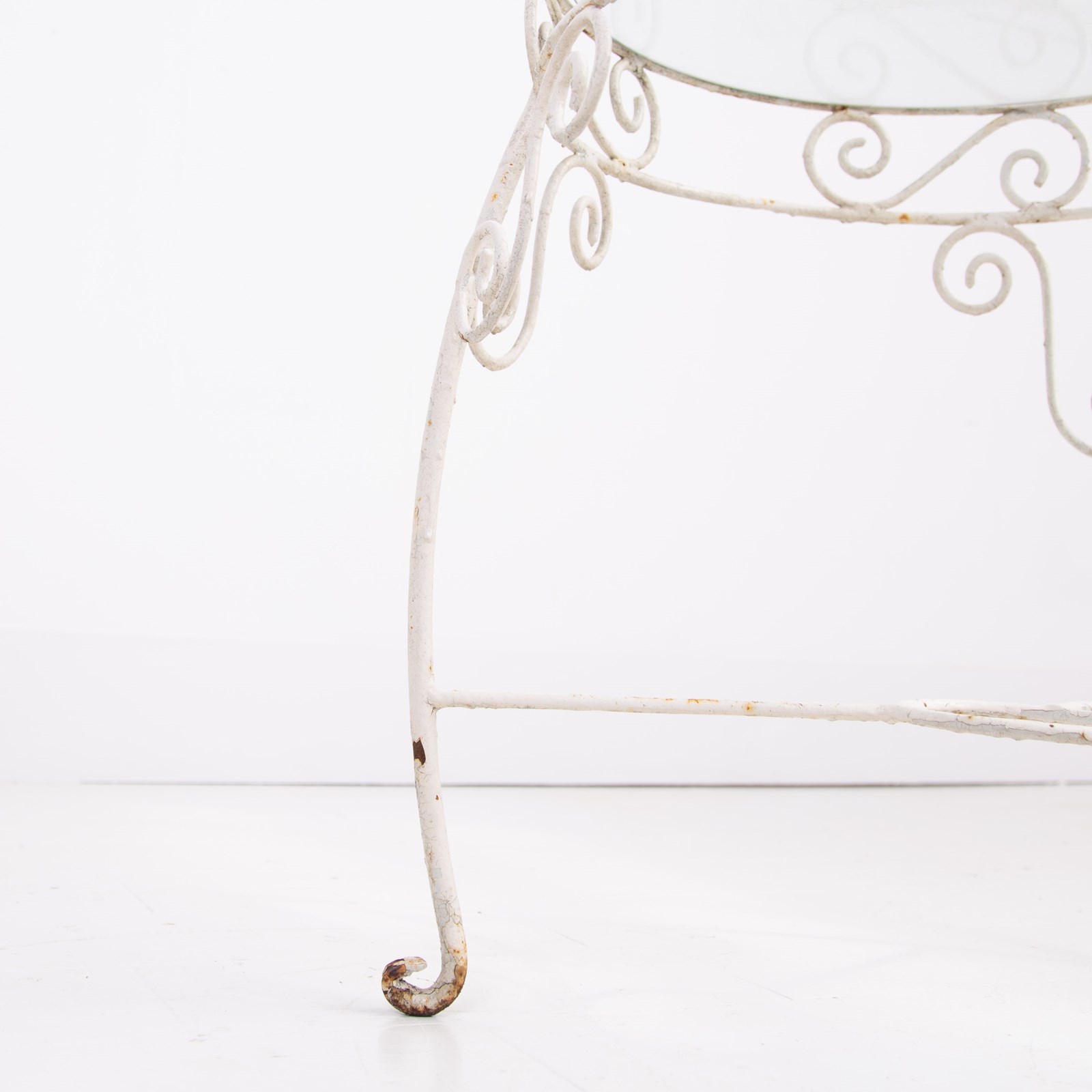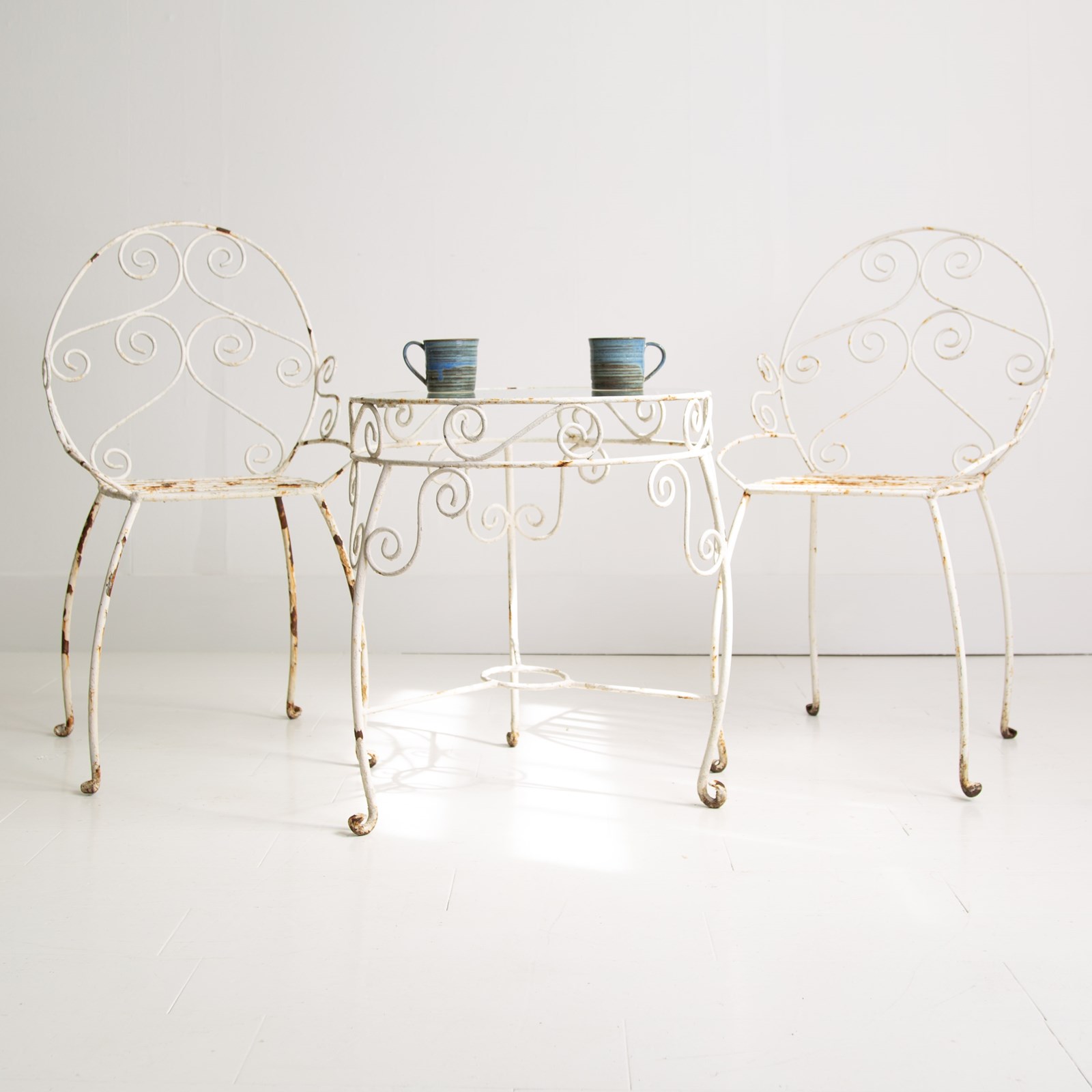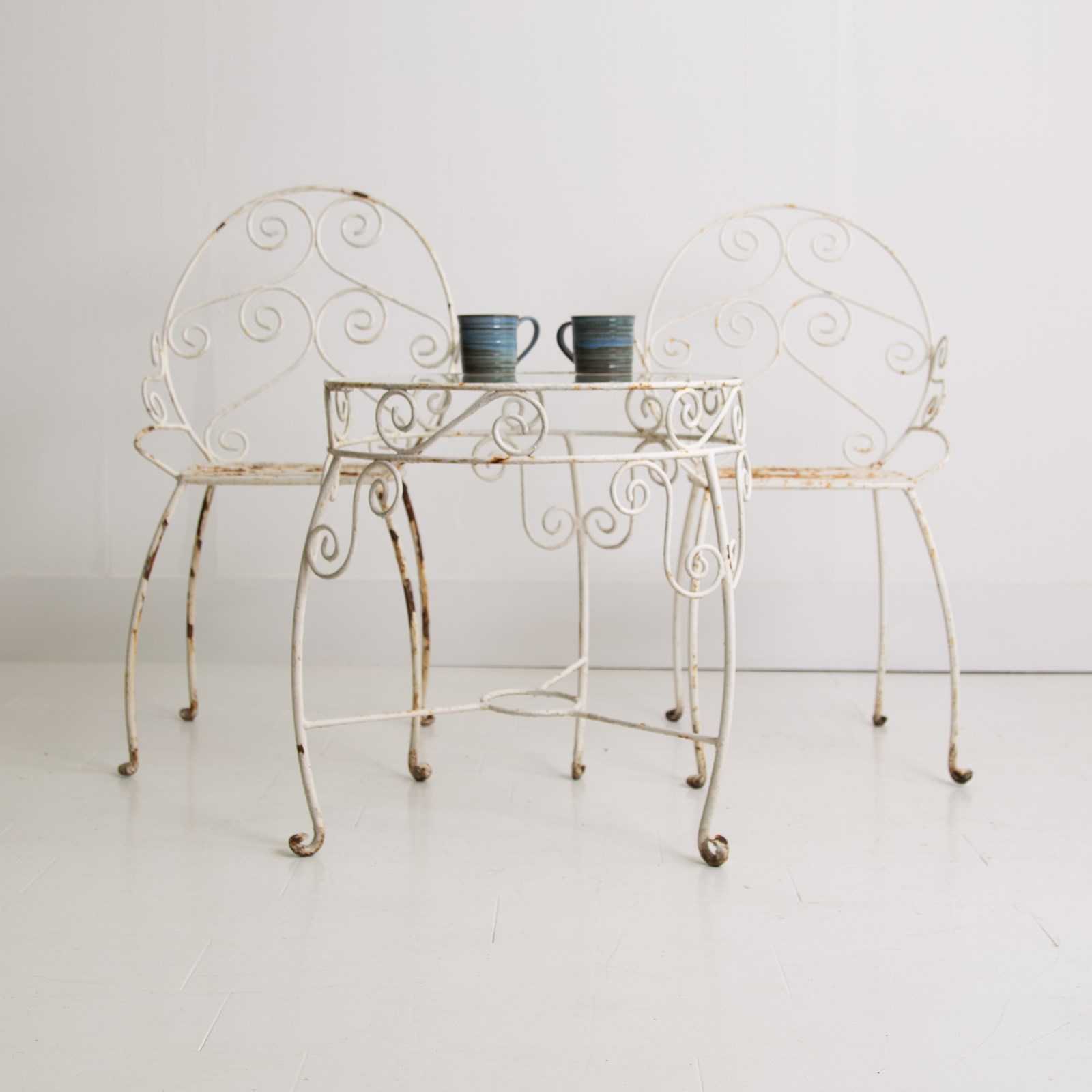 A rather delightfully attractive weathered and aged patio set consisting of a little round table and 2 matching chairs. A fab size for a little patio or roof terrace and ready to place with sensible aging to the iron frames and glass top. Very decorative with swirls and curves galore.