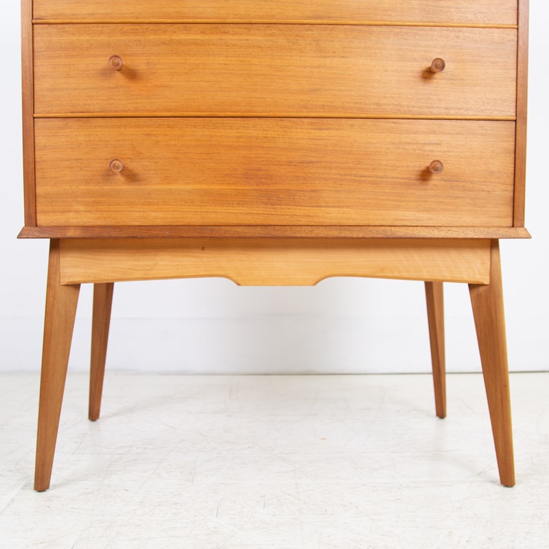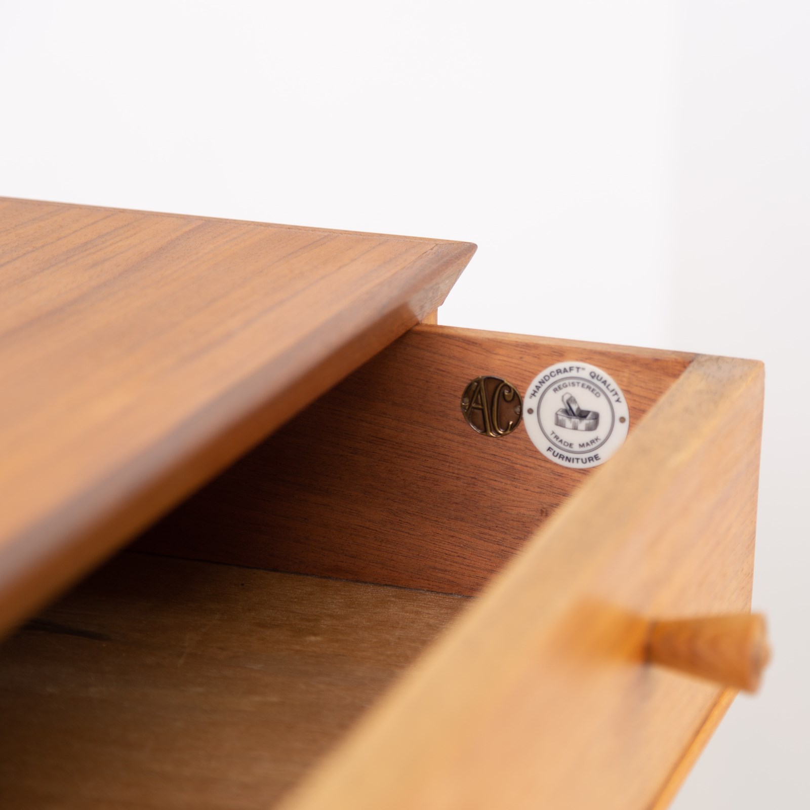 Alfred Cox retailed in the top department stores including Heal’s and the simple, sleek design and the use of the right timber makes this one shine. The attention to detail is wonderful. So often makers use substandard timber on the sides, however this chest possesses a stunning grain to the walnut on both sides. The graduated drawers are a perfect fit in a lighter shade of walnut and sit neatly perched on well angled legs.