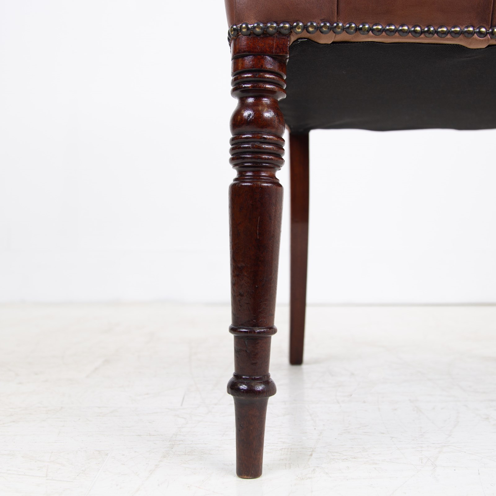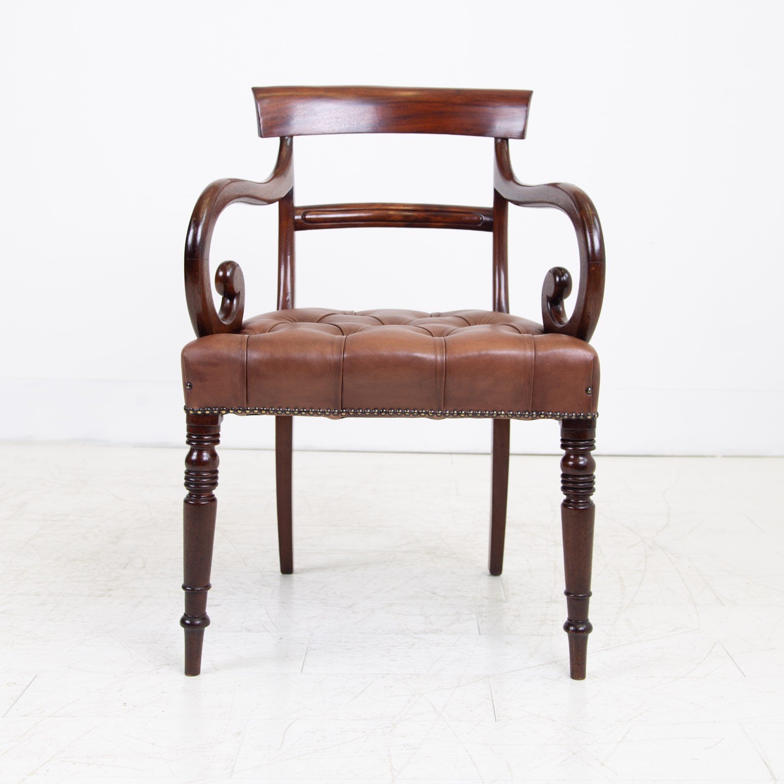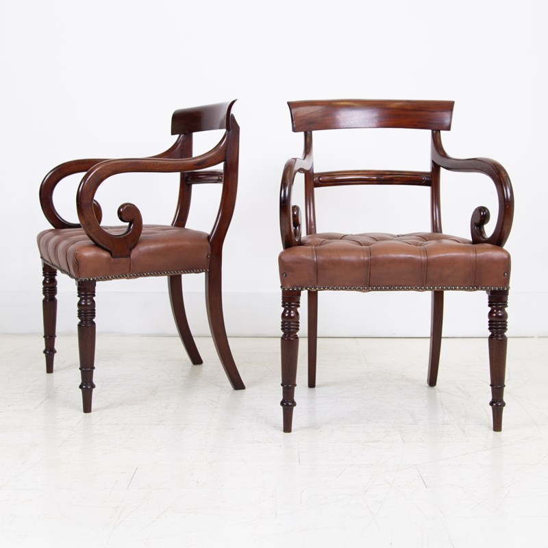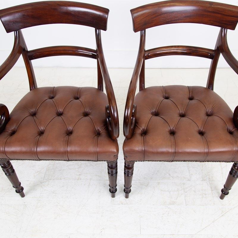 We have 2 matching attractive mid 19th Century armchairs raised on delightfully turned, tapering legs with traditionally stuffed deep buttoned leather seats - a very recent addition so very little wear and of super quality. The chair benefits from a deep bar back and lovely sinuous curves to the classic scroll arms.