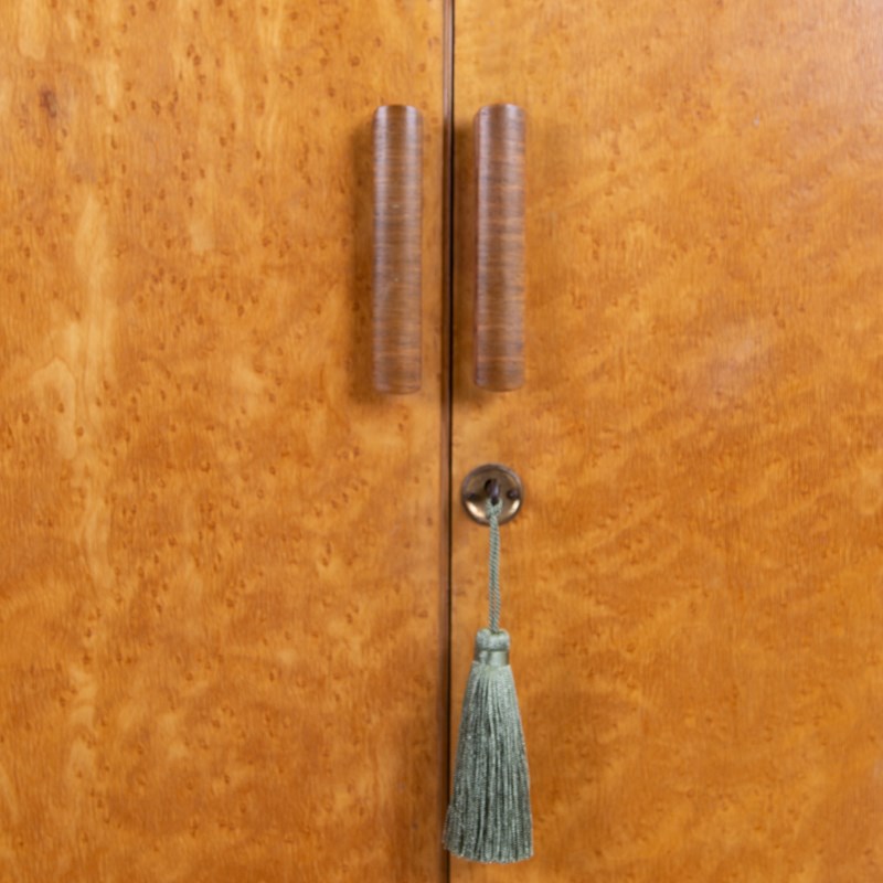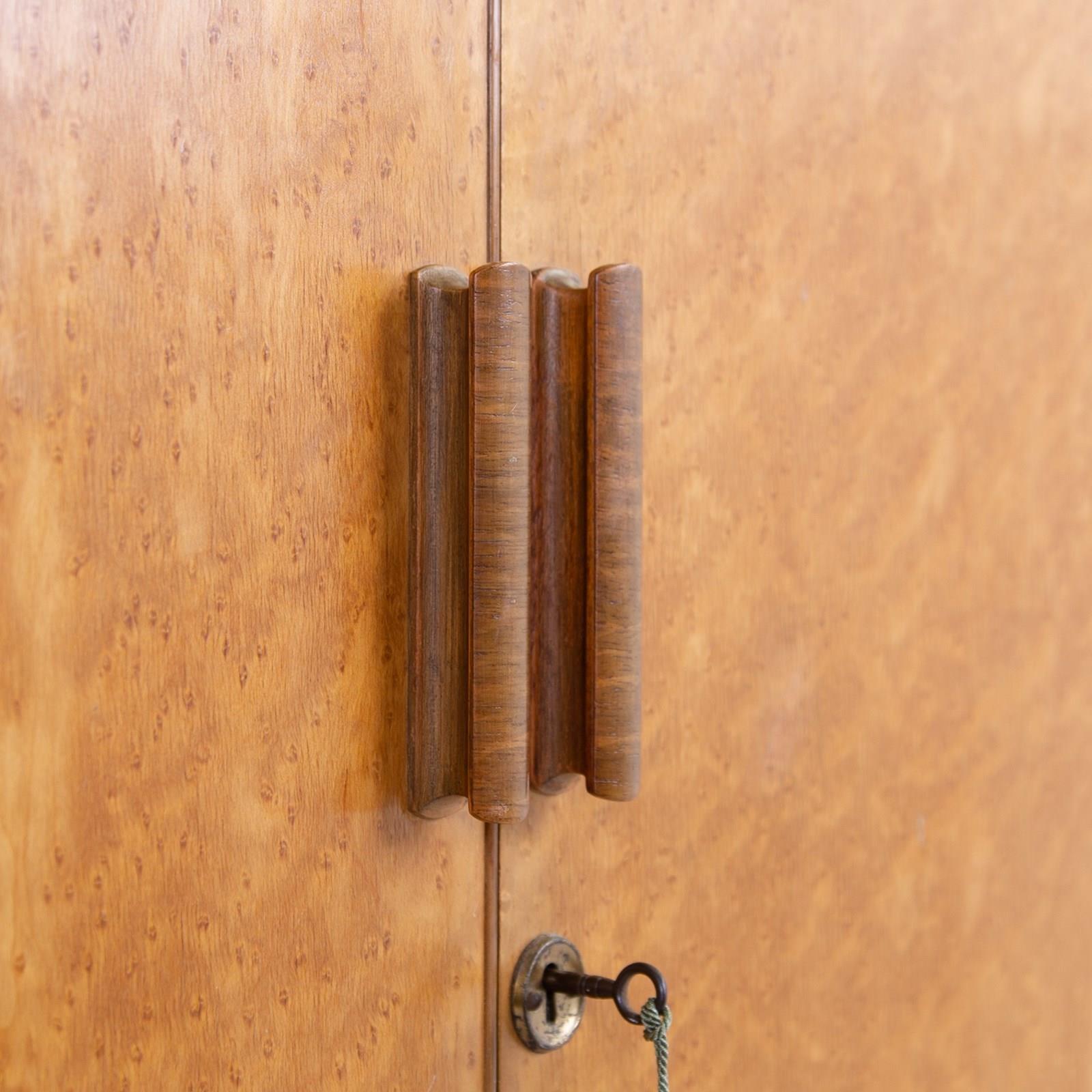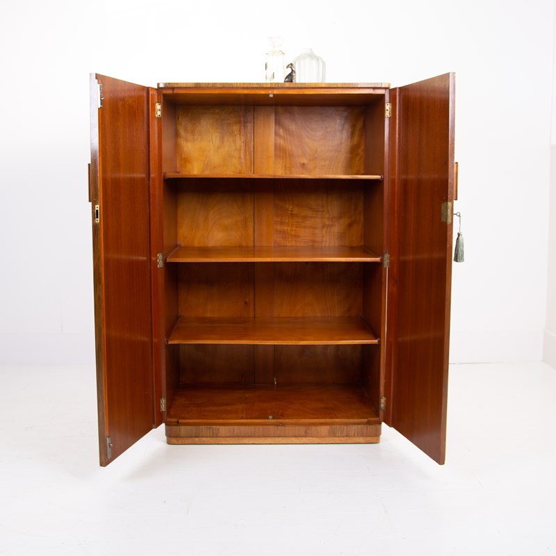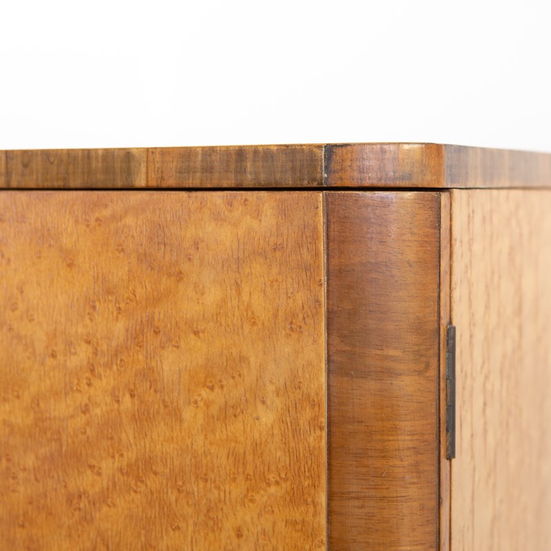 We have gentle, handsome hints of the deco period with this piece: the gentle shape to the top matched with the doors, a band of walnut to the edging - the top matched with one at the bottom, a lovely inverted plinth of birds eye maple tucked under this at the base, a very smart coloured interior, smart long handles and the original period escutcheon with working lock and key.