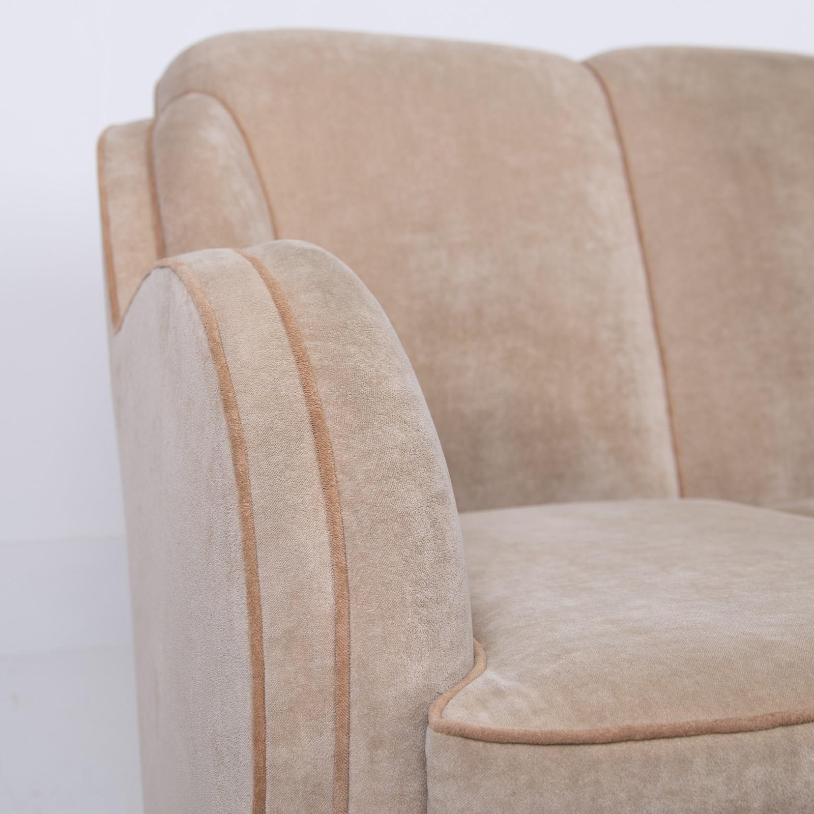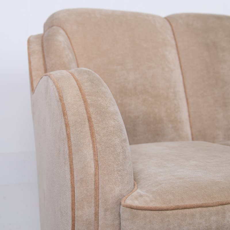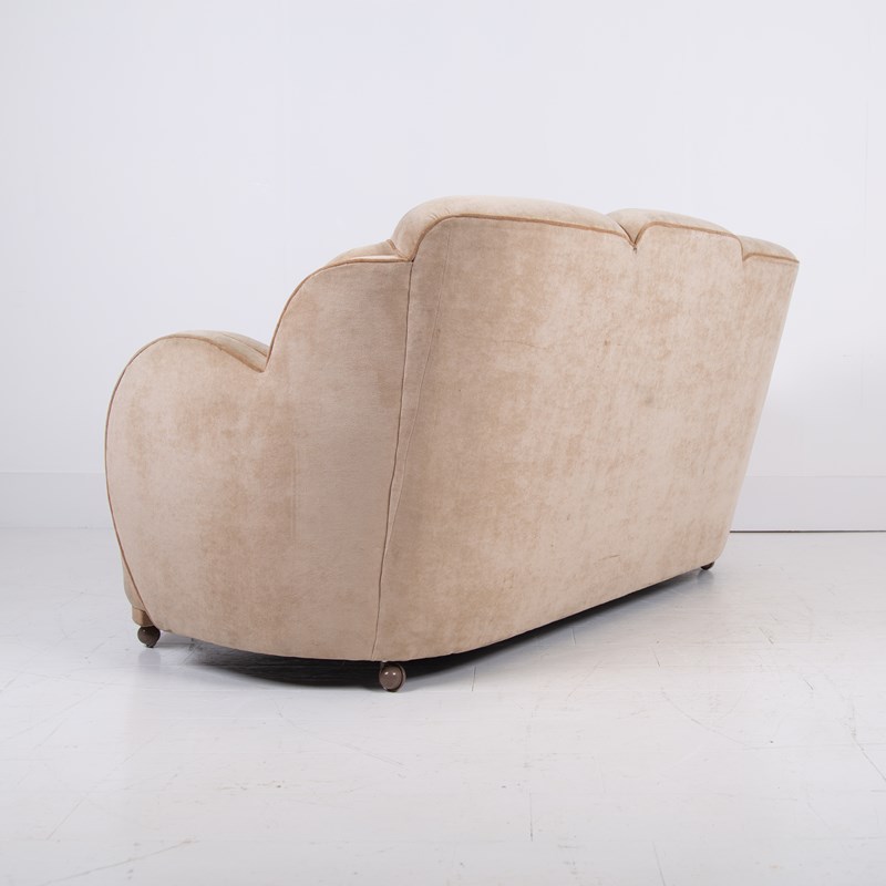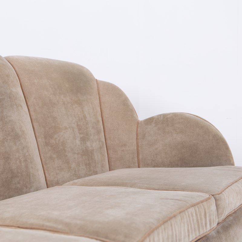 We have a fabulous looking Art Deco cloud sofa by Harry and Lou Epstein which currently sits in a worn short cut velvet fabric which our upholsterer would be happy to fully re-upholster at a cost of £835 plus VAT. You would require around 8-9 metres of fabric, depending on pattern, which we would be happy to assist with the sourcing of swatches and an initial chat about patterns and colours etc.