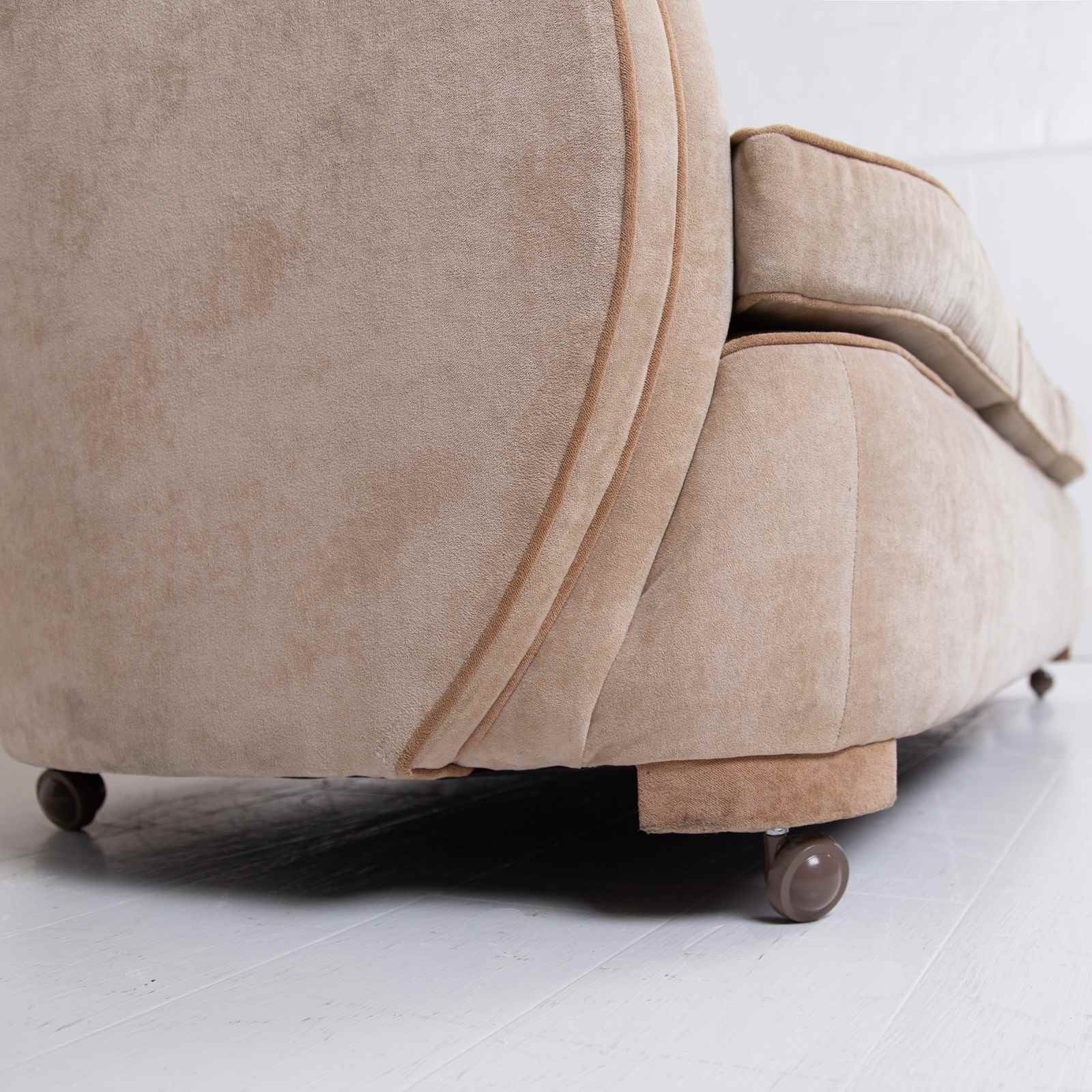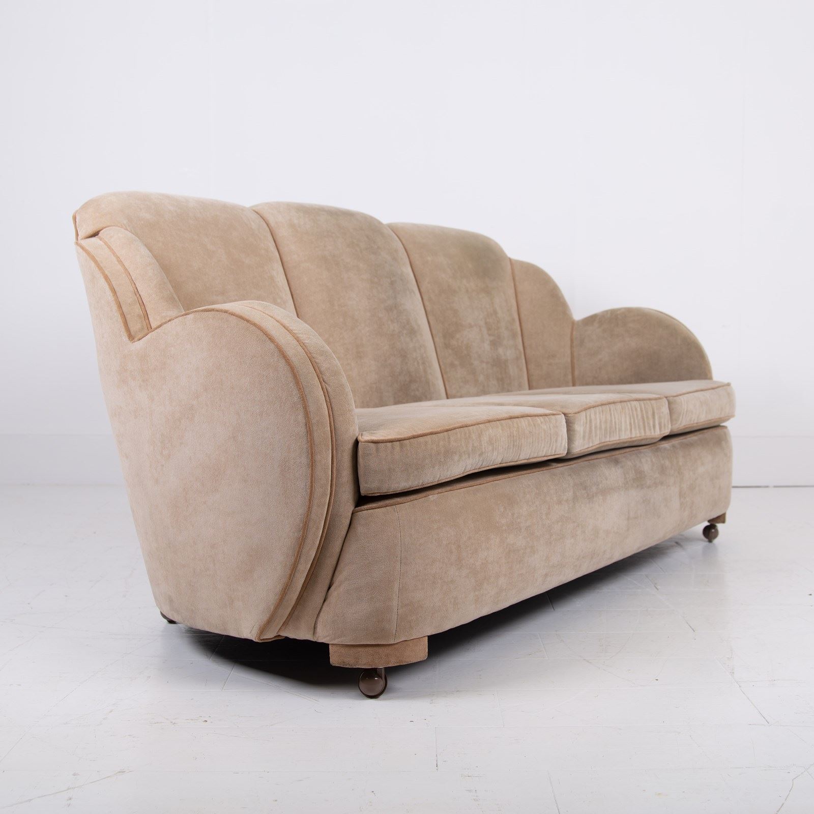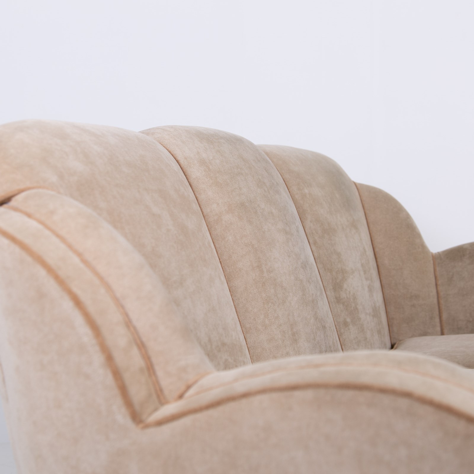 We have a fabulous looking Art Deco cloud sofa by Harry and Lou Epstein which currently sits in a worn short cut velvet fabric which our upholsterer would be happy to fully re-upholster at a cost of £835 plus VAT. You would require around 8-9 metres of fabric, depending on pattern, which we would be happy to assist with the sourcing of swatches and an initial chat about patterns and colours etc.
