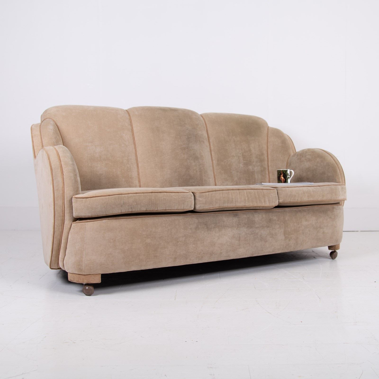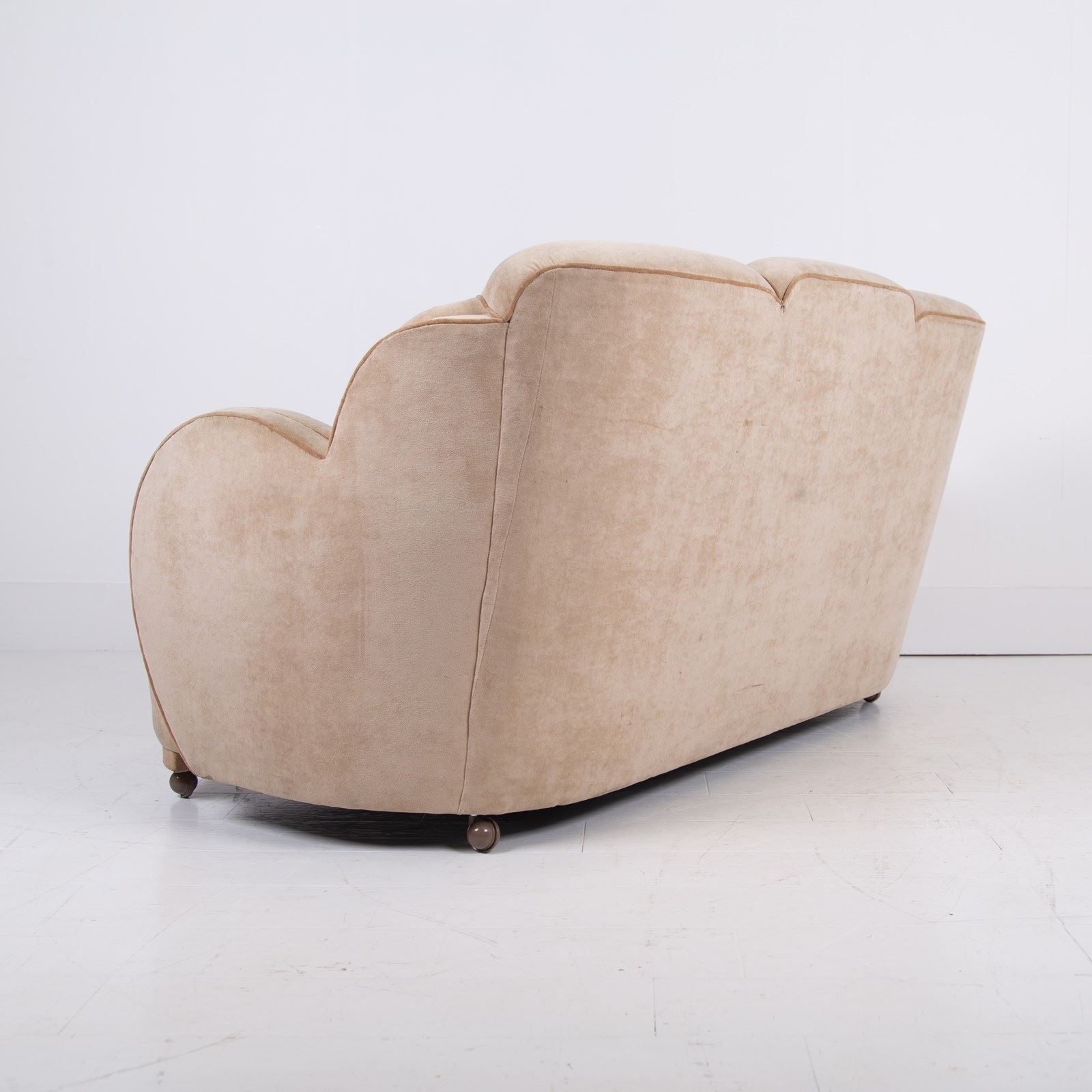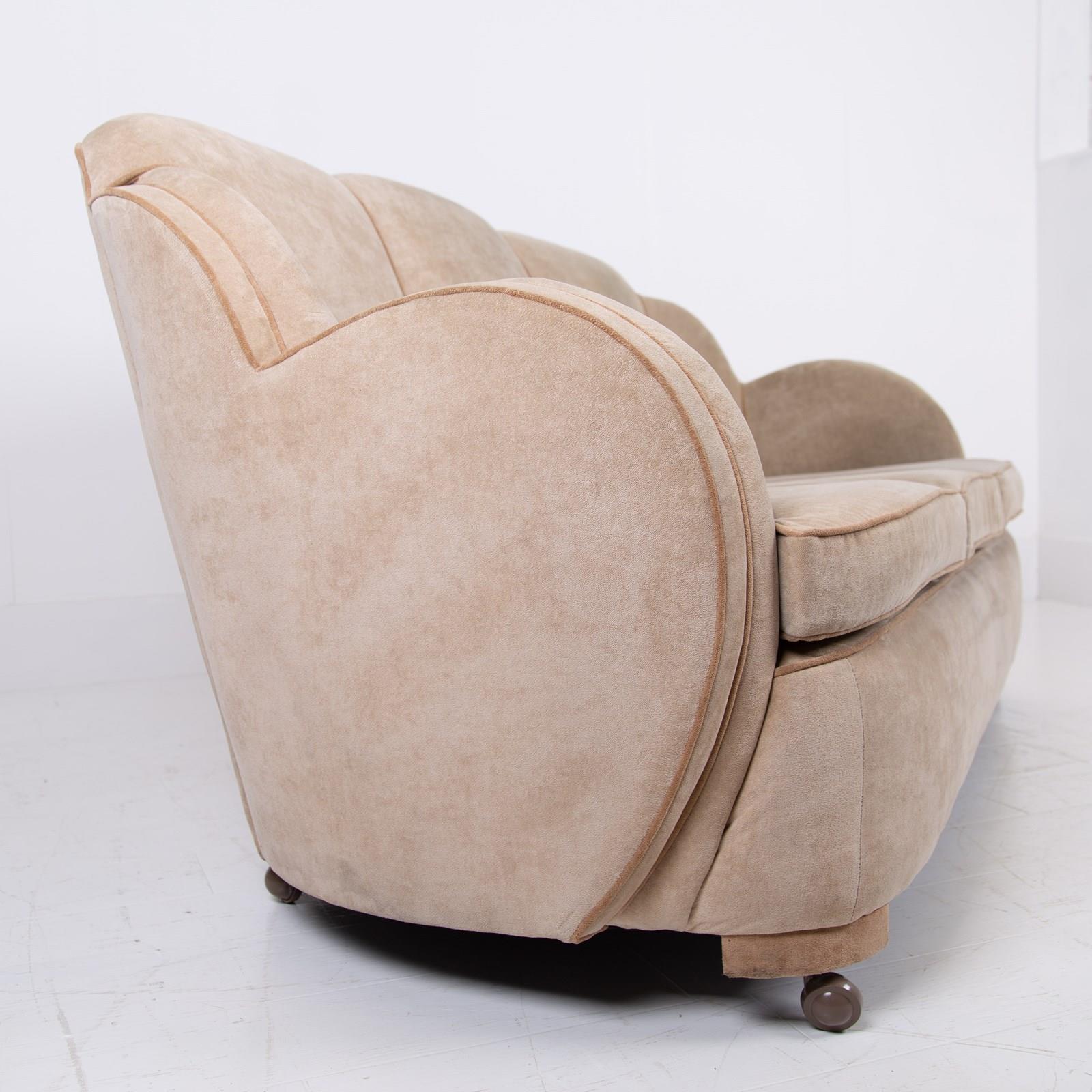 The sofa is a quality classic Art Deco piece with those cloud shaped arms and back. It currently sits well - the weighty well made frame is firm, no movement in the back or arms etc, springs are tight and you could use as is if you wish, no faults apart from the fabric looking tired and worn.